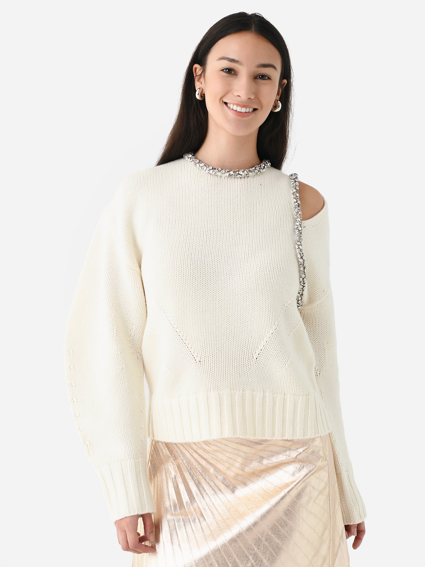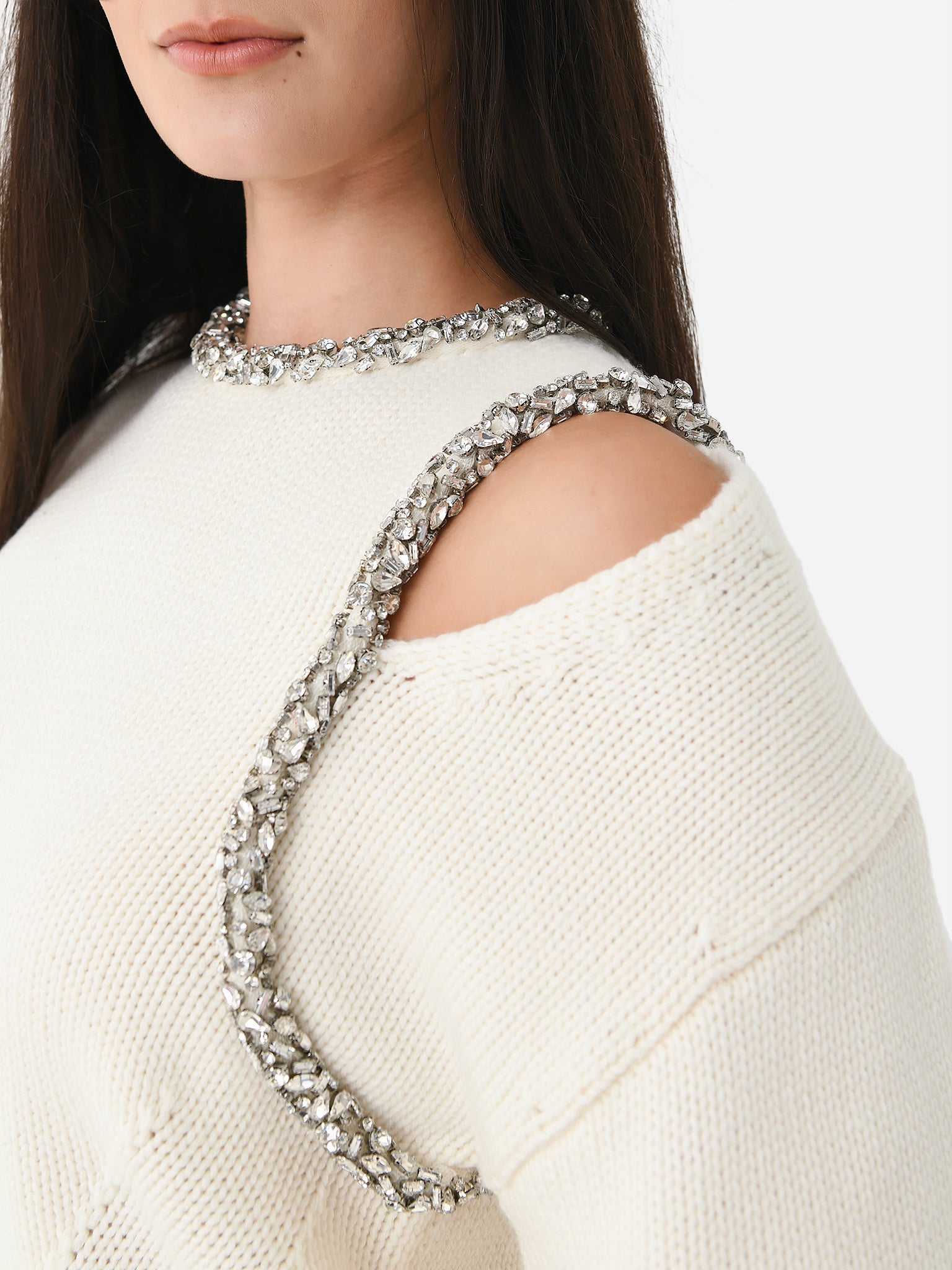 This wool-cashmere sweater features a cold shoulder cutout and crystal trim along the neckline and arm.