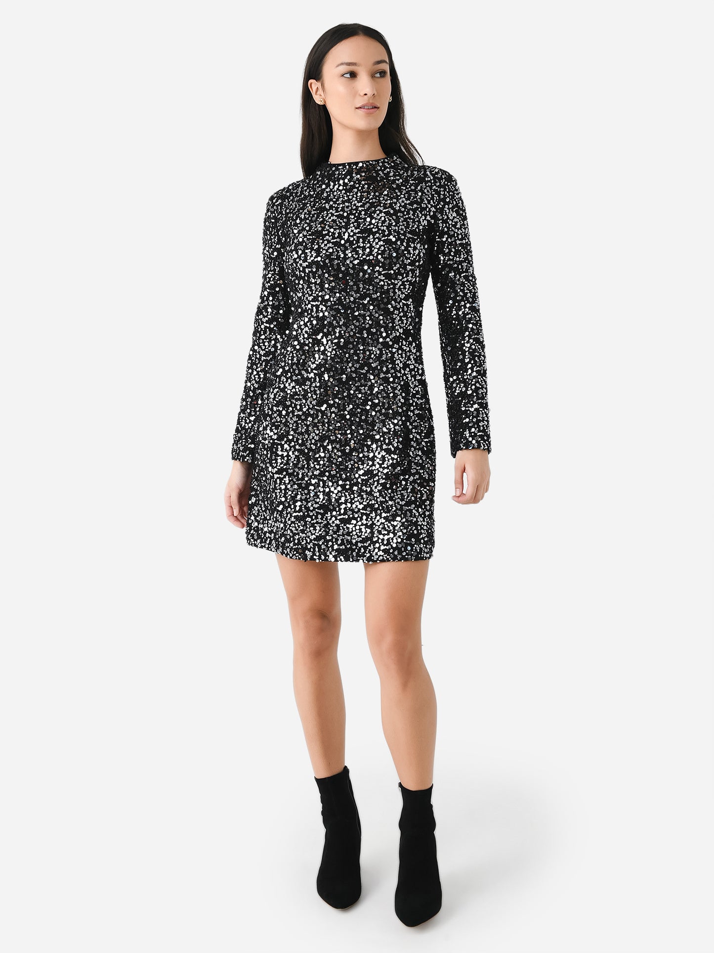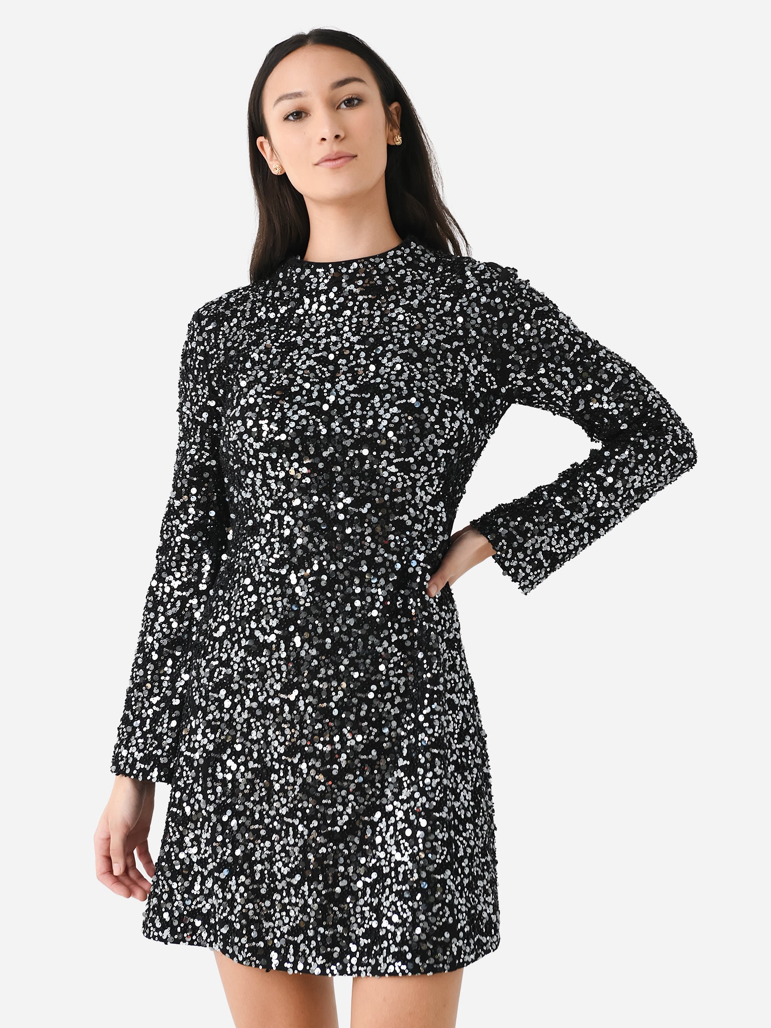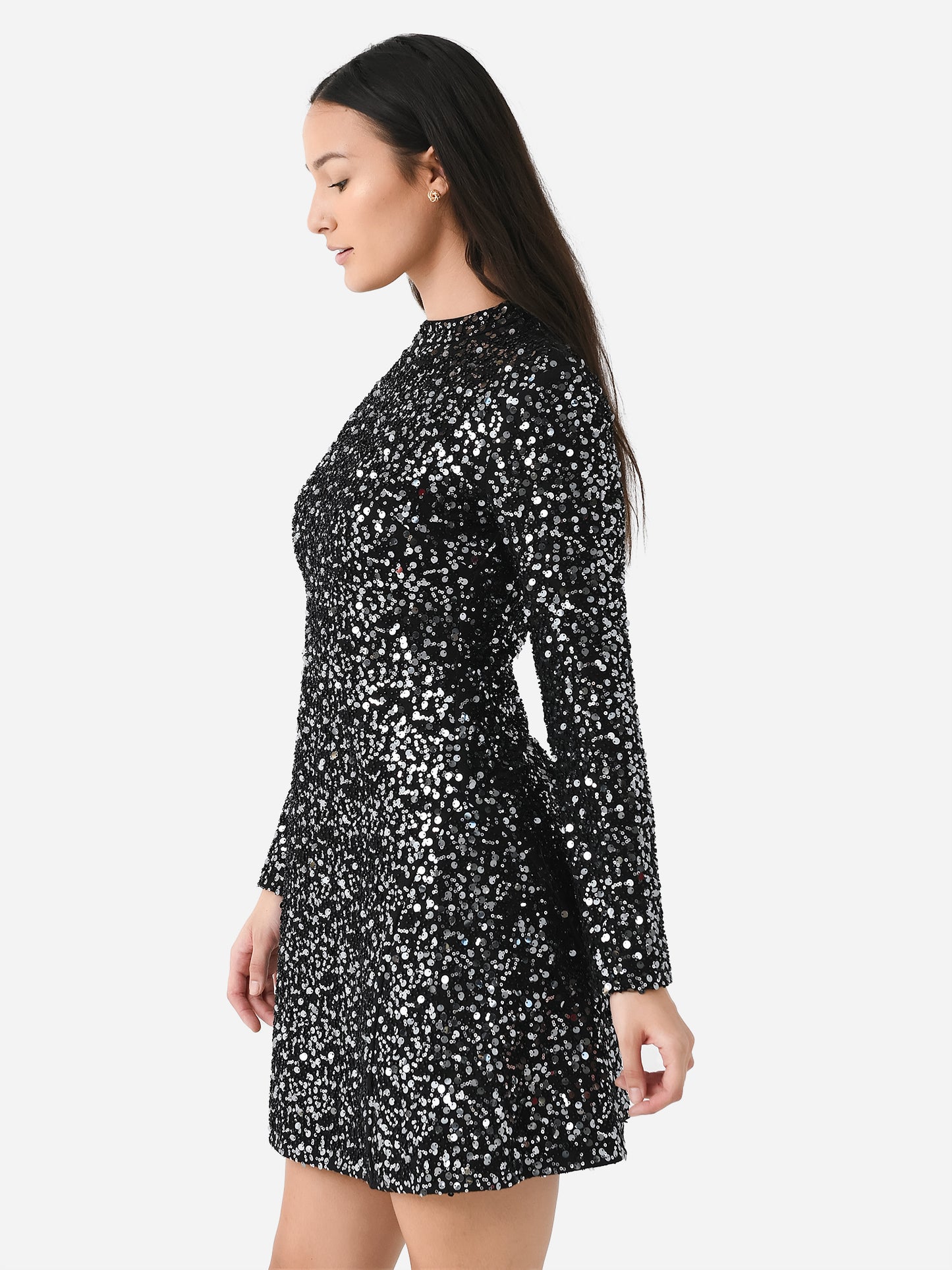 A striking mock-neck mini dress constructed from dazzling sequins.
