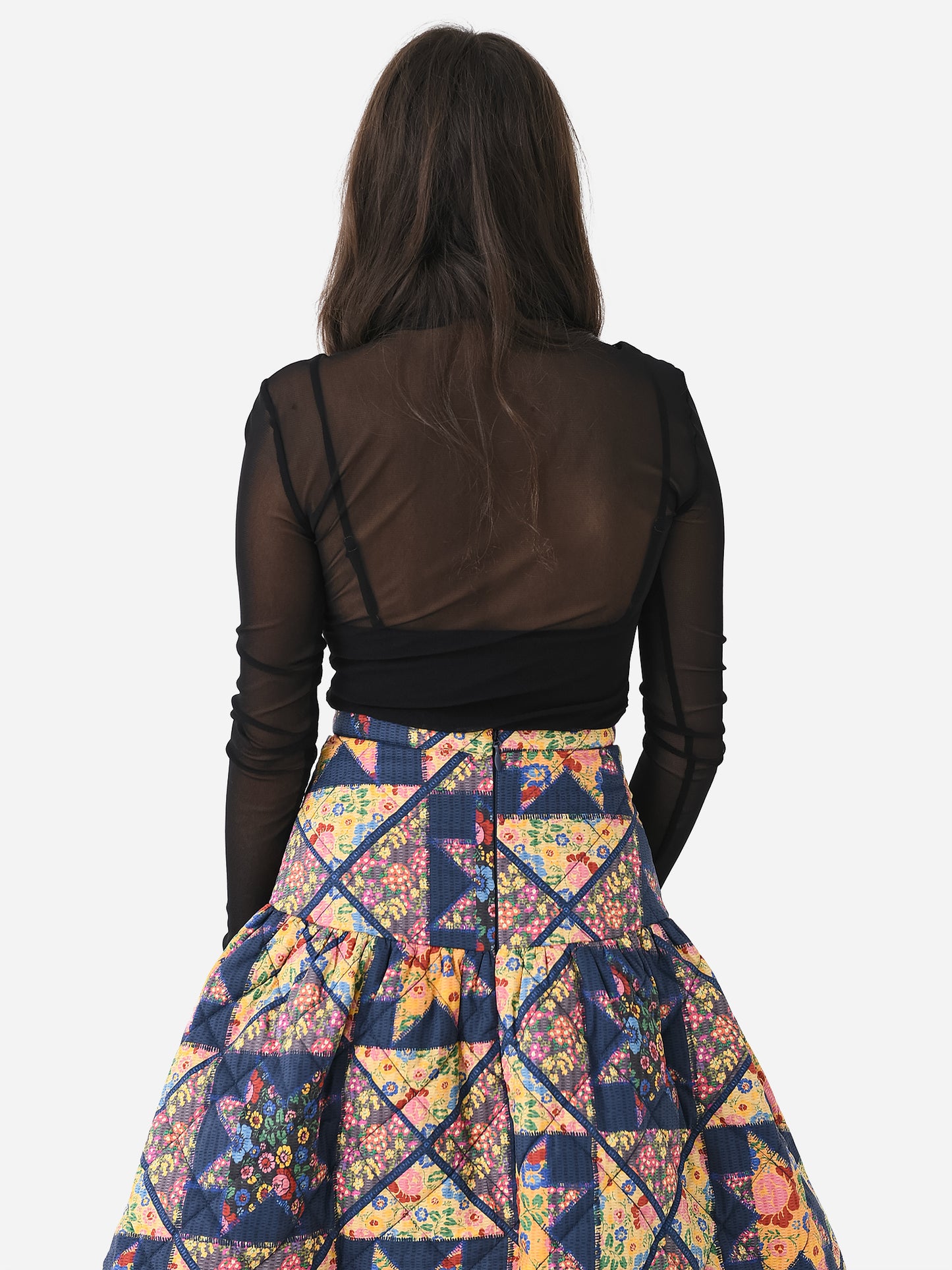 Camisole bodysuit with a sheer long-sleeve overlay.
