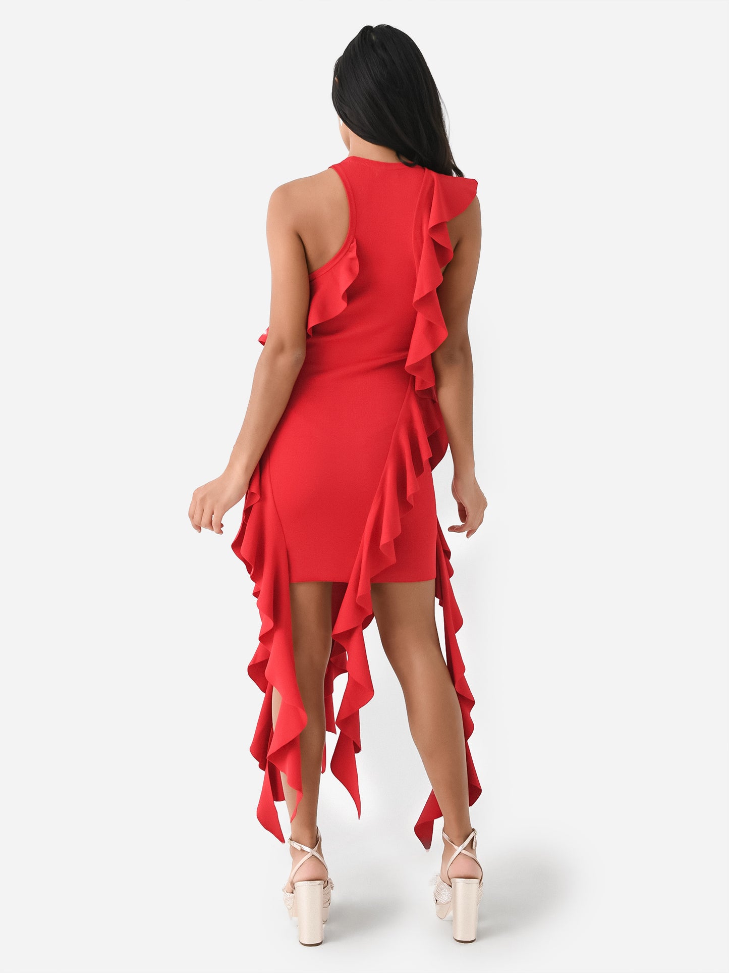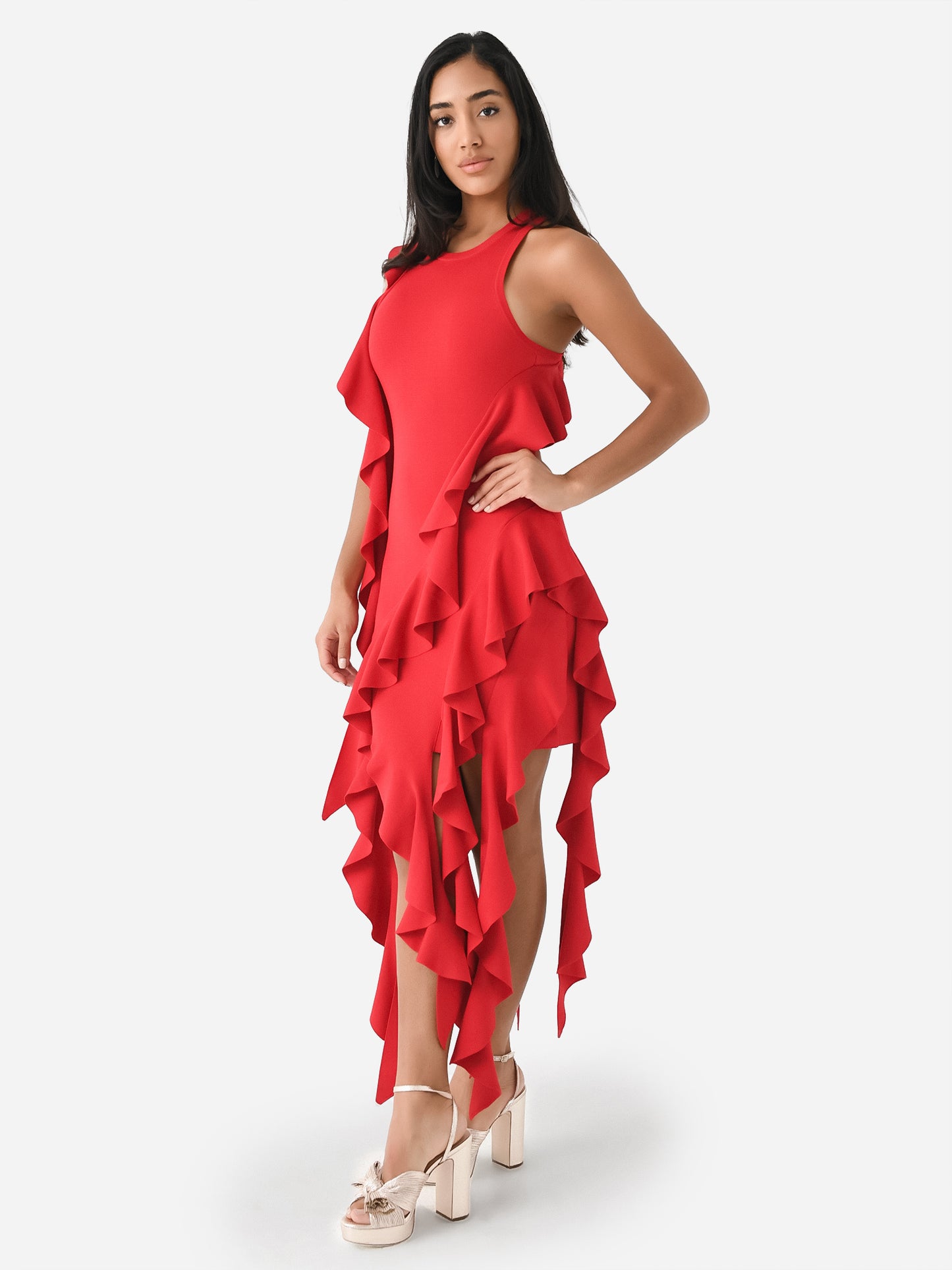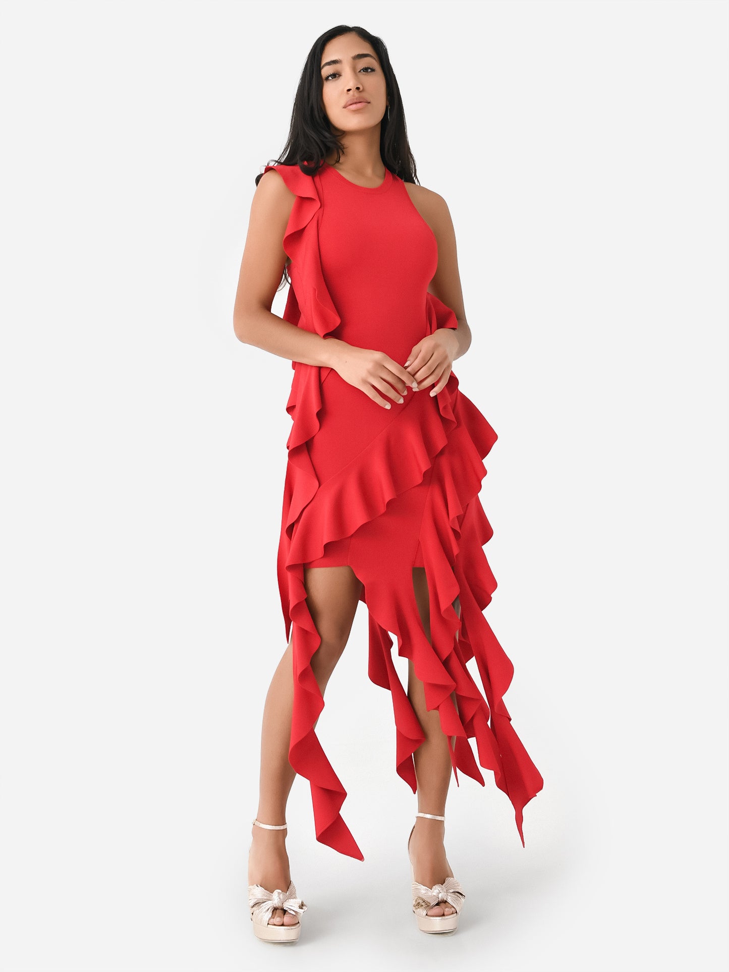 A sleeveless bodycon dress featuring asymmetrical cascading ruffles.