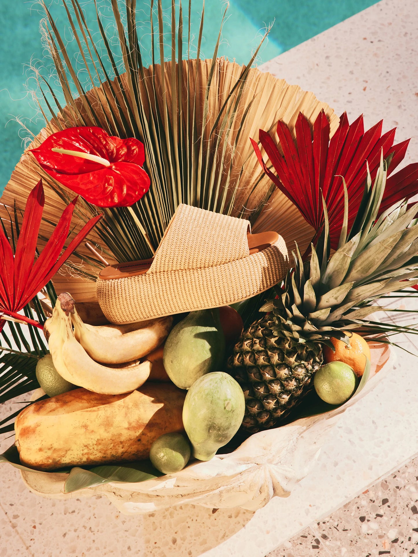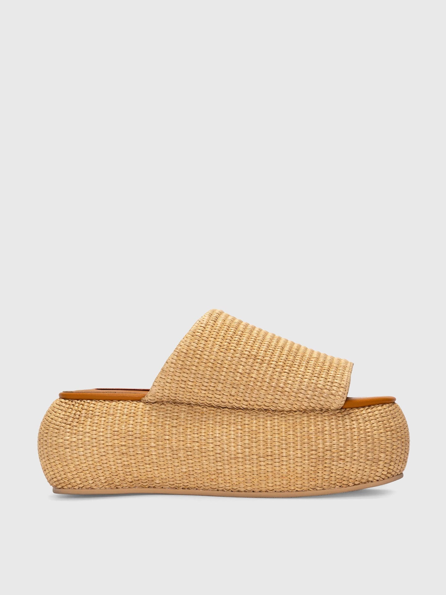 A chunky slide sandal made from natural raffia with a platform sole and vegan leather footbed.