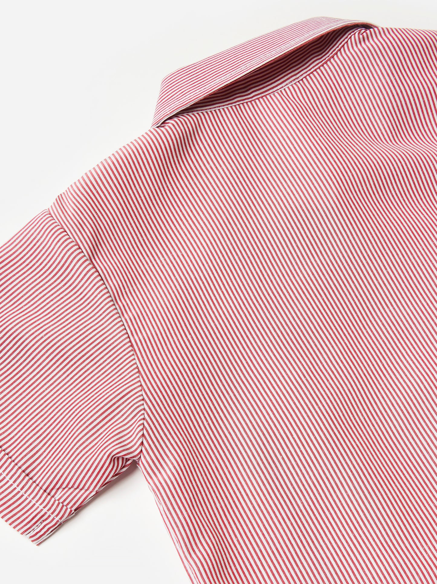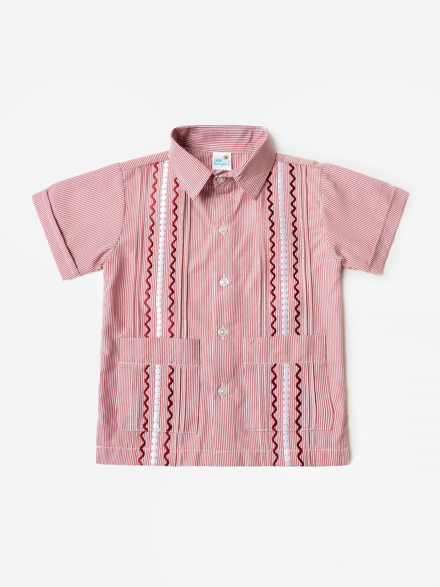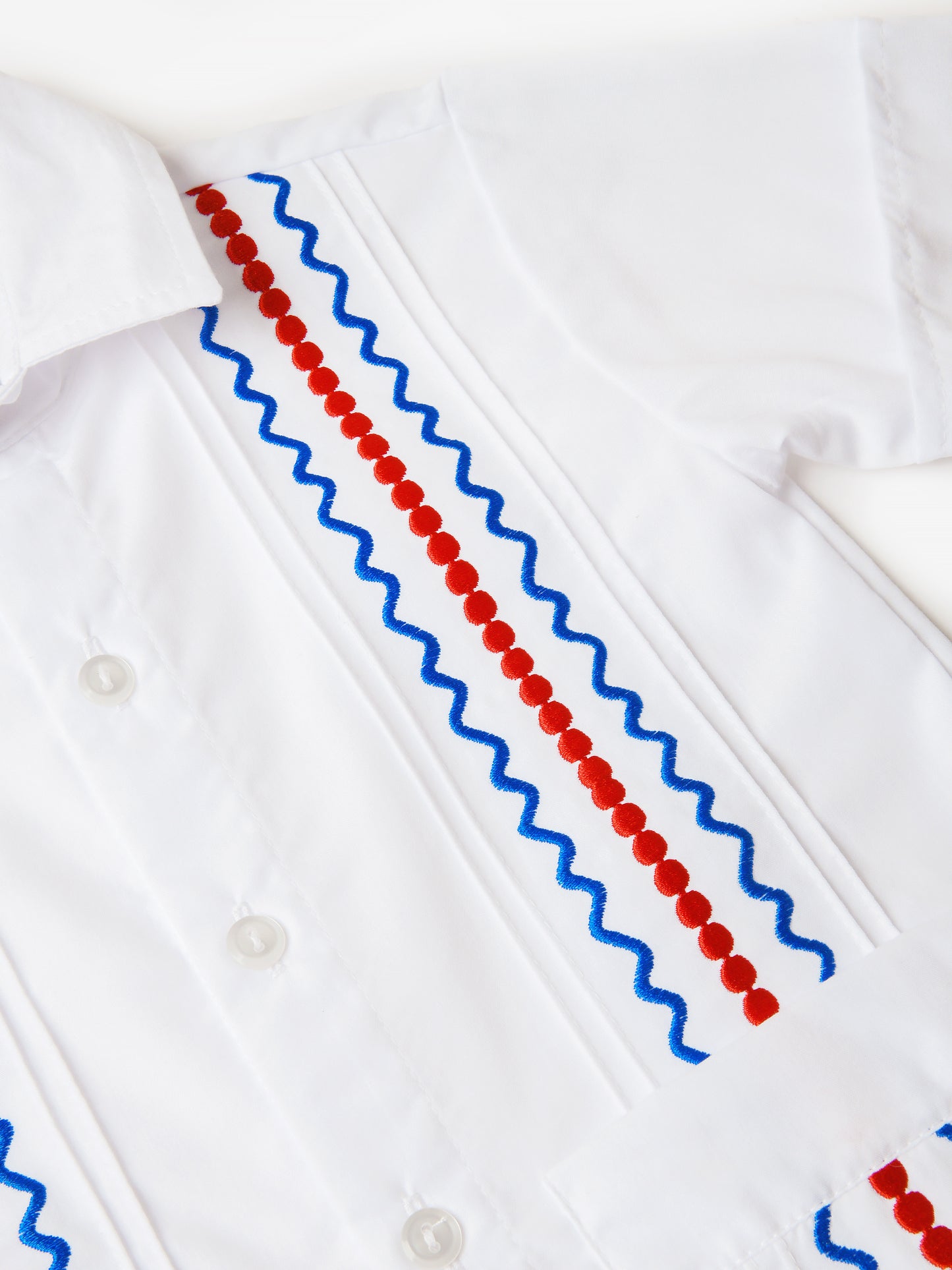 Guayabera-style button-down shirt with a point collar and embroidered detail.