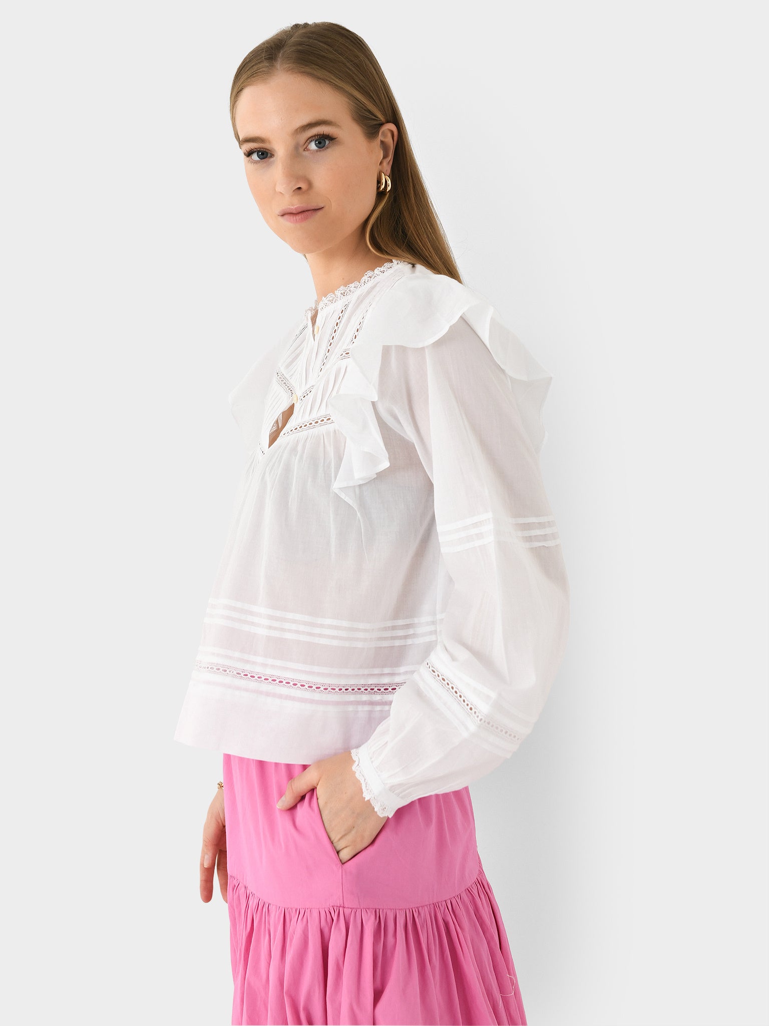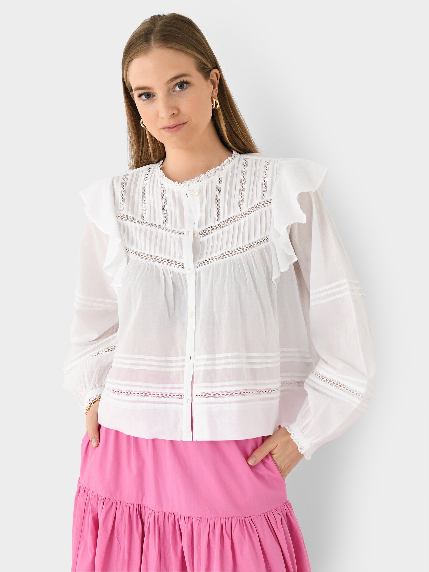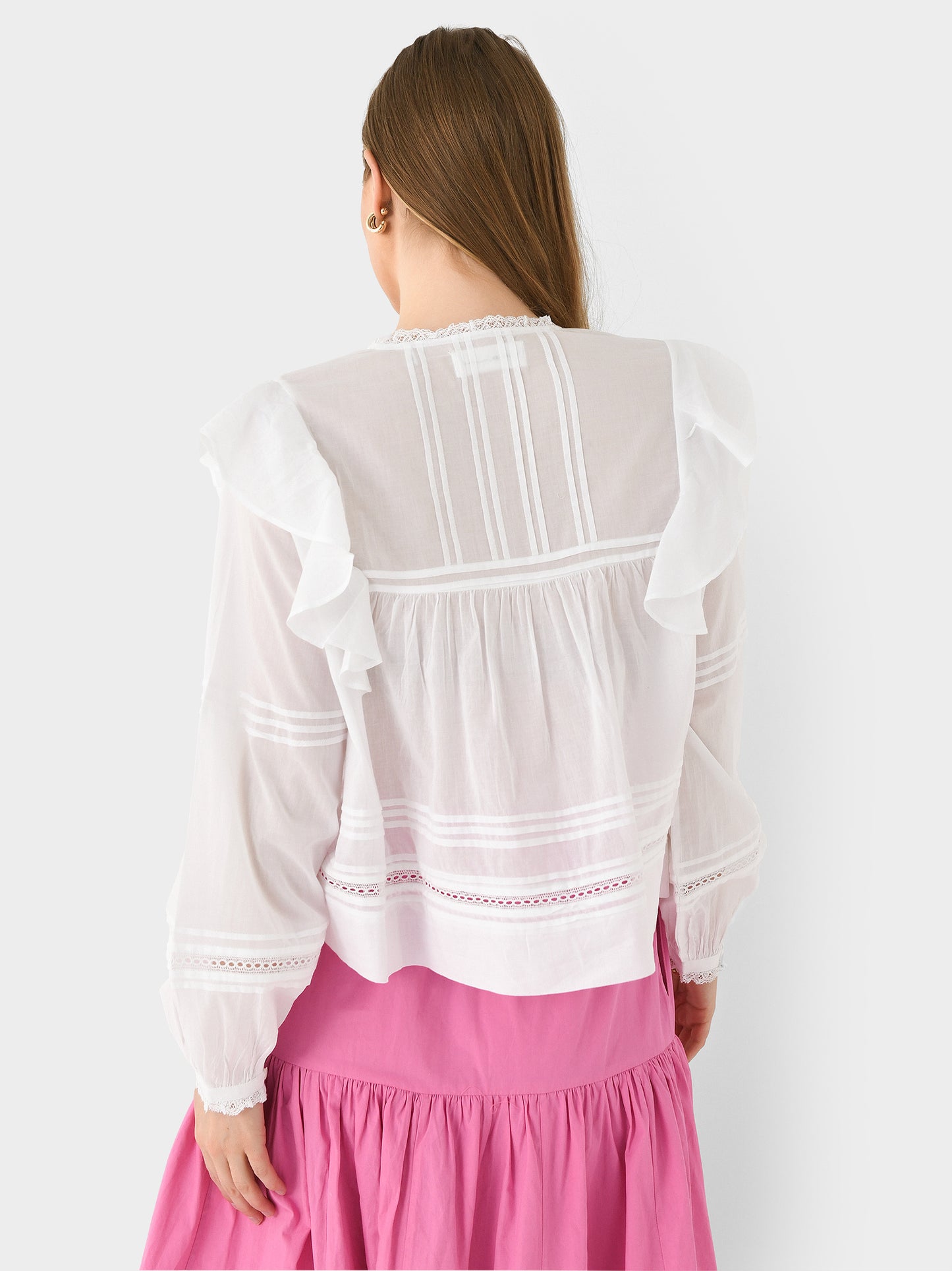 An organic cotton blouse with gathered pintucks, embroidered eyelet lace, and ruffle details.