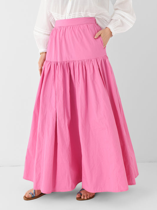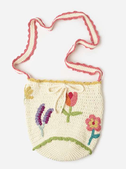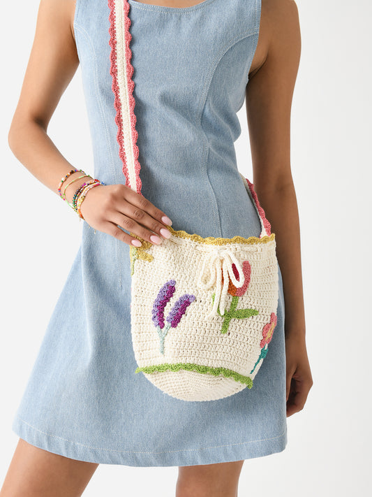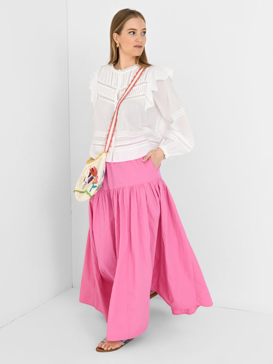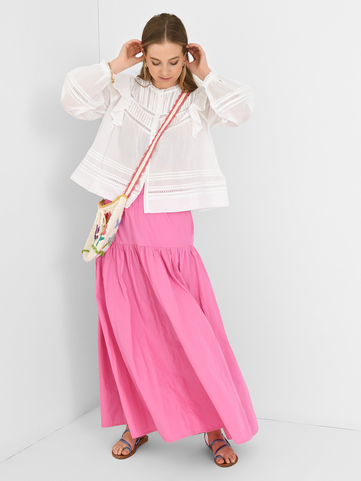 An organic cotton blouse with gathered pintucks, embroidered eyelet lace, and ruffle details.