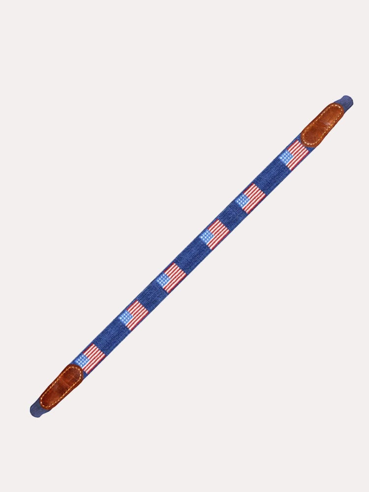 A hand-stitched needlepoint sunglasses strap with an American flag design and full-grain leather details.