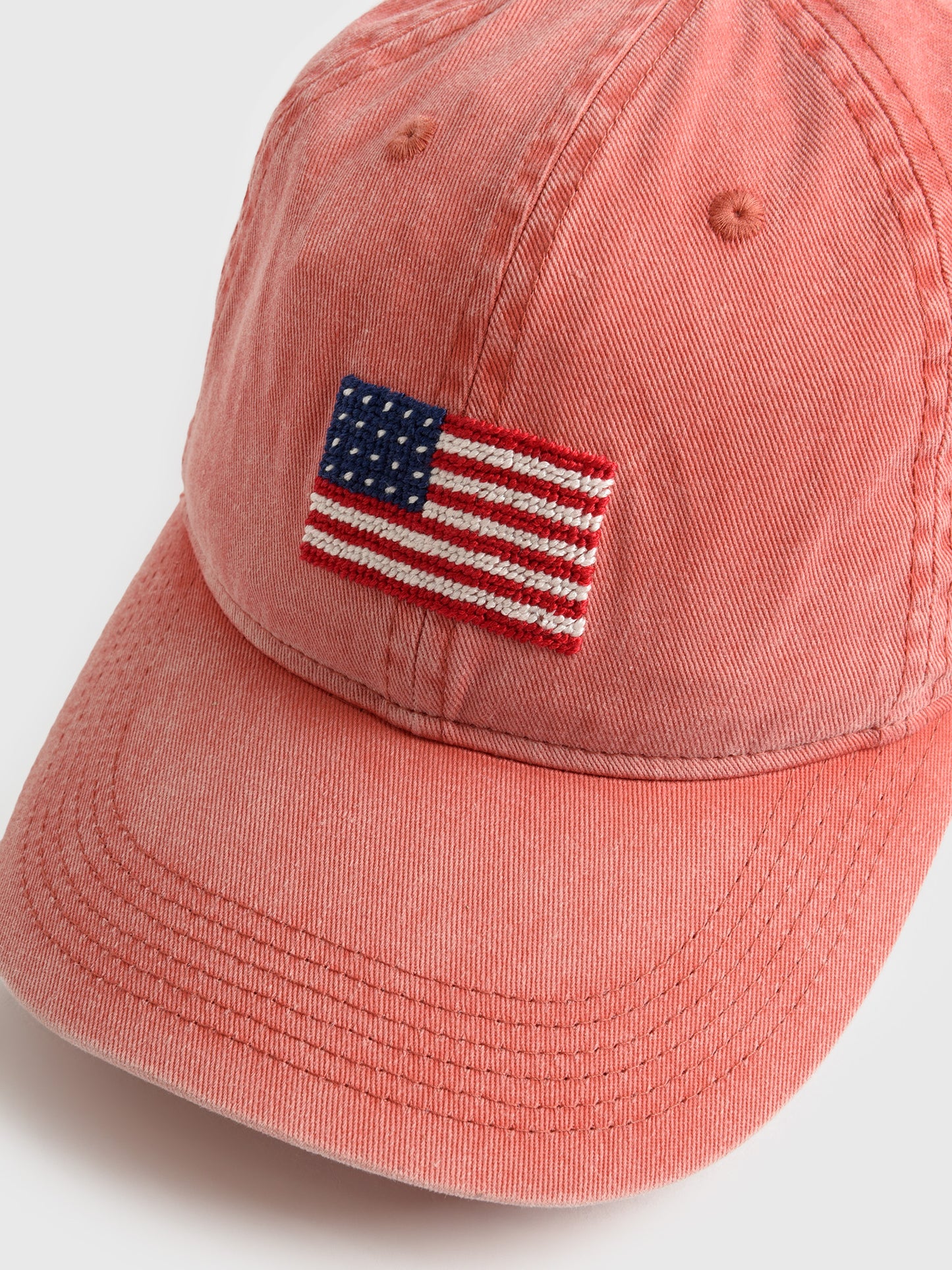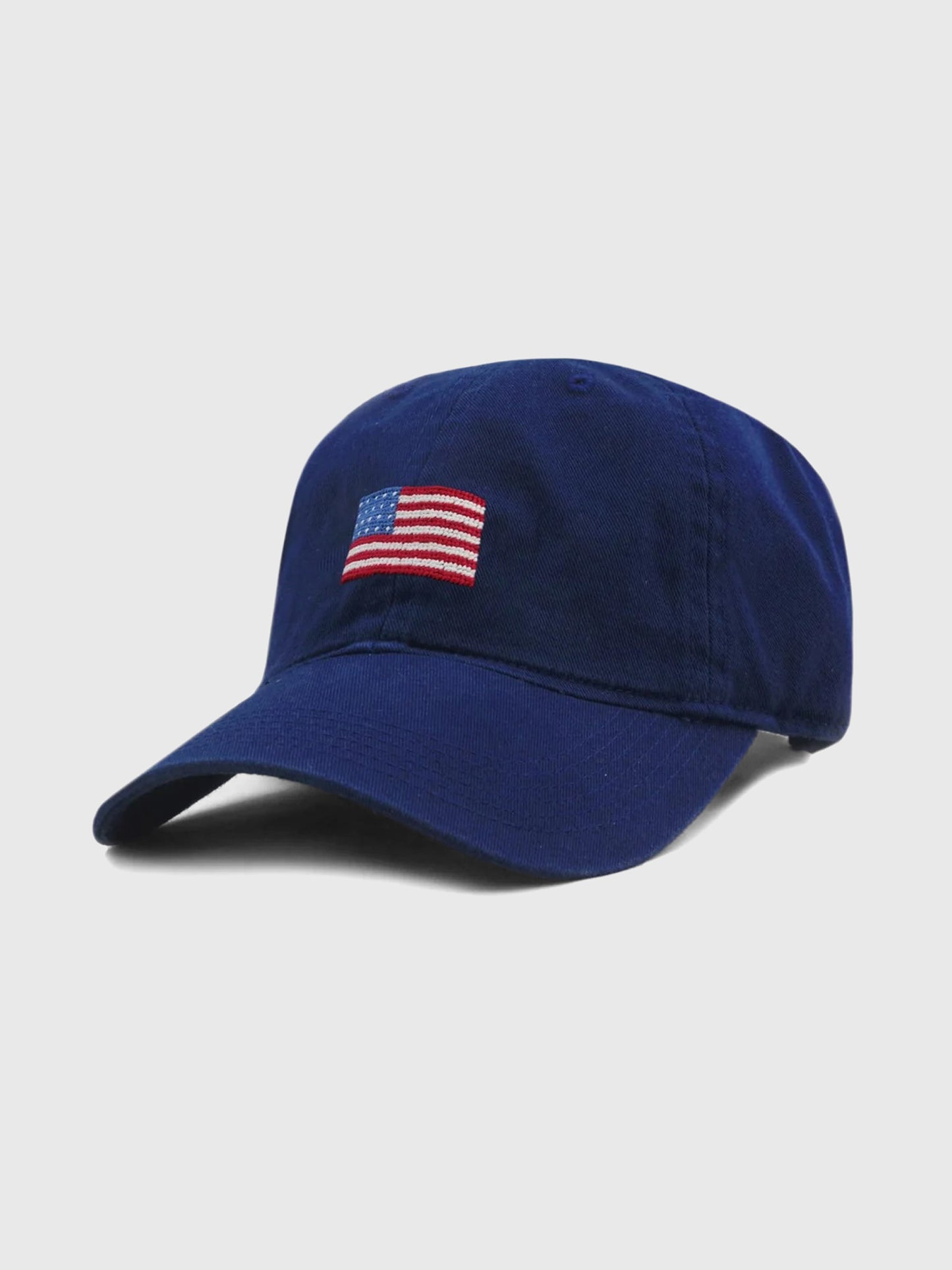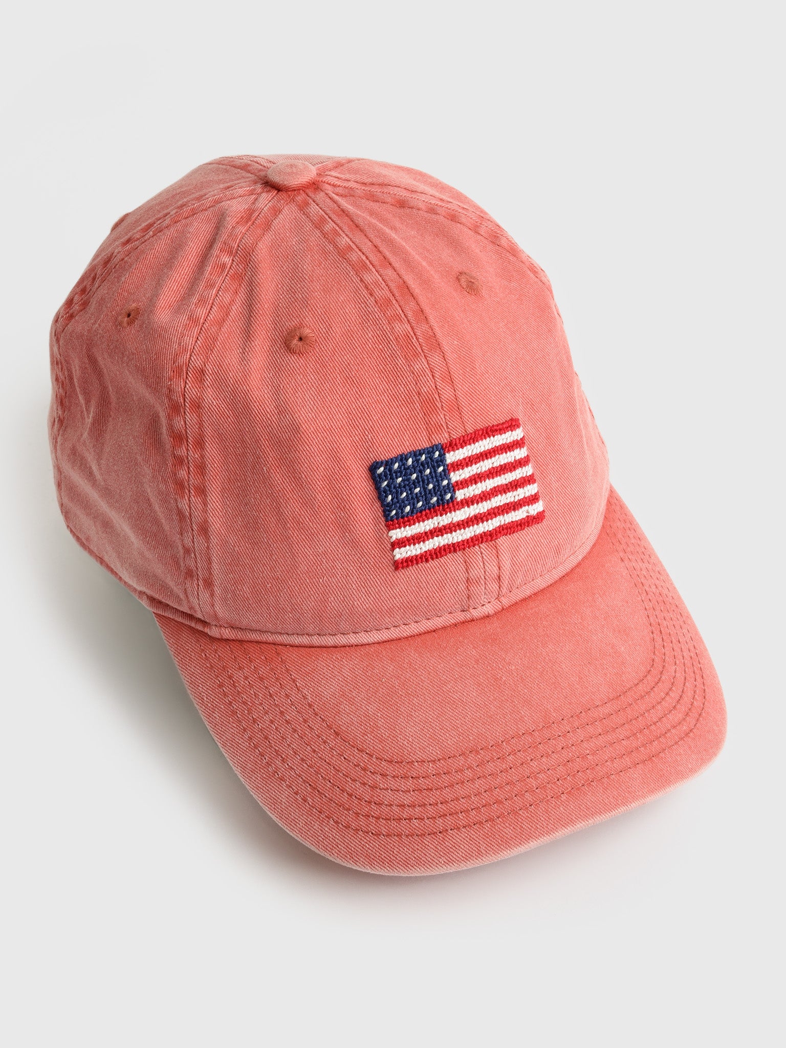 This classic baseball hat is made from soft cotton twill and features a hand-stitched needlepoint American flag design. Circumference: approximately 21'' (adjustable by a nickel slide). Top to Side: approximately 6.5''. Brim: 2.75'' long