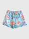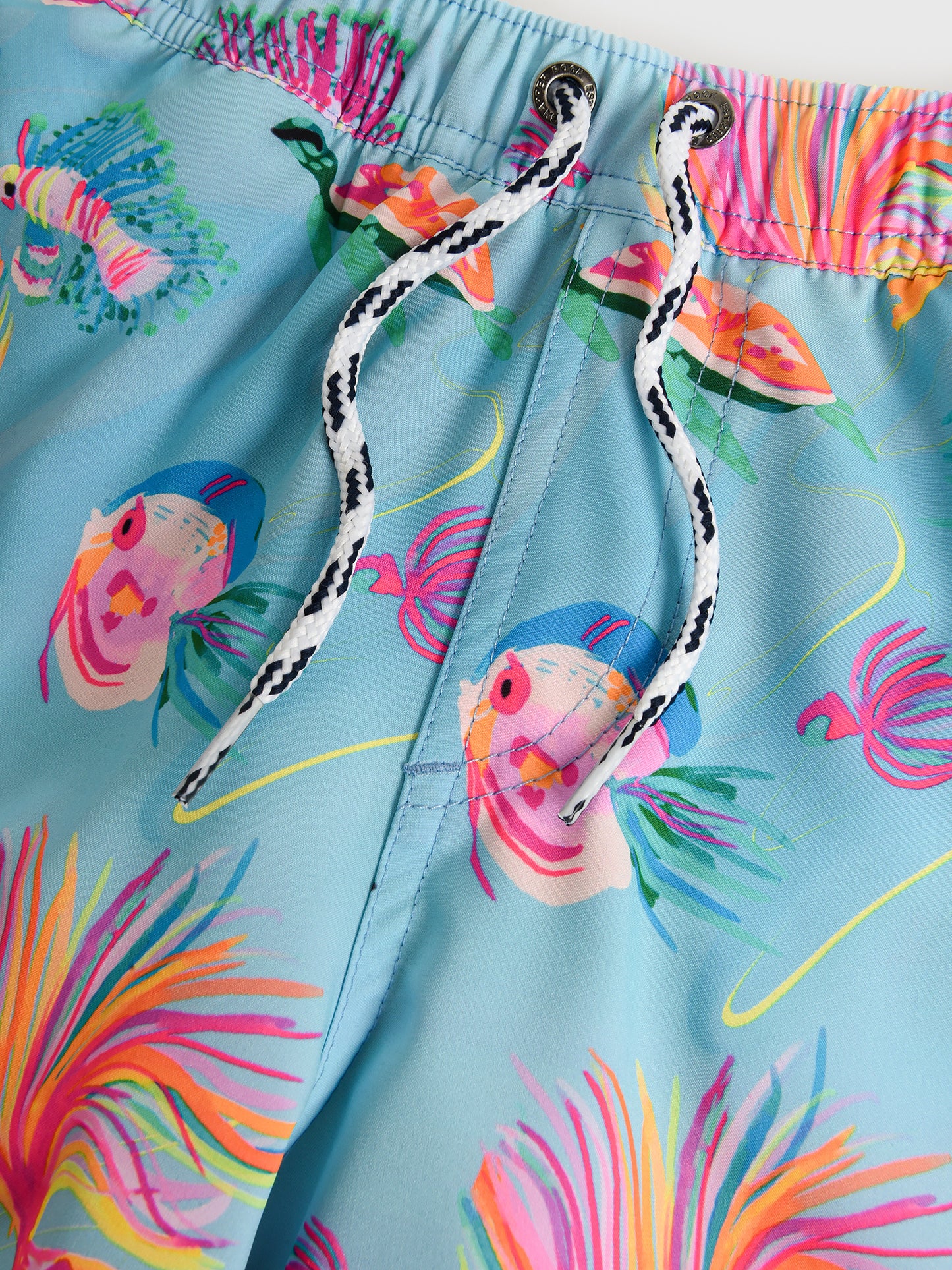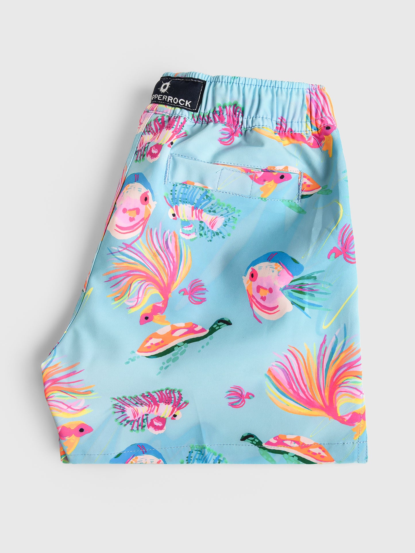 This swim trunk is made from breathable quick-drying fabric and features a colorful fish print.