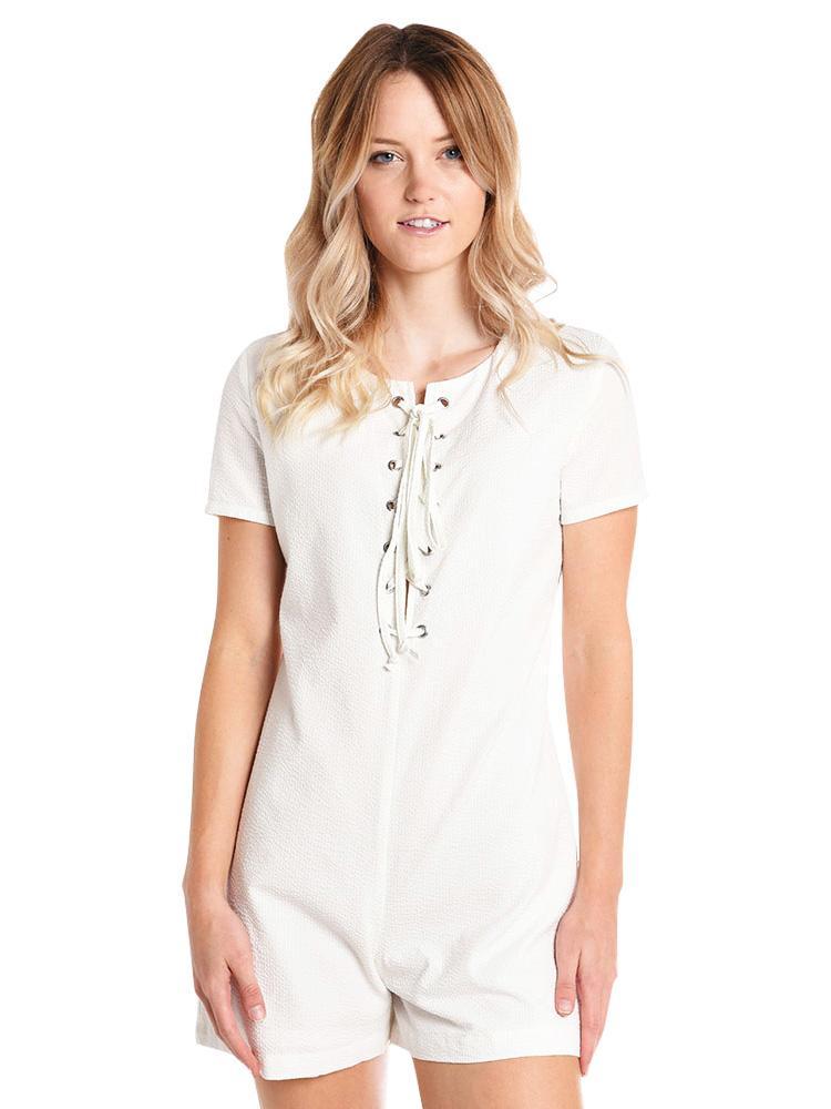 The Solid and Striped The Arabella Short Jumsuit has a lace front to make a chic coverup from pool to cocktails.