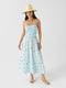A flattering A-line dress made from lightweight cotton with a smocked bodice, an exposed back with elastic straps, and an all-over embroidered floral print.