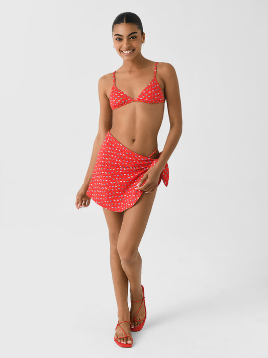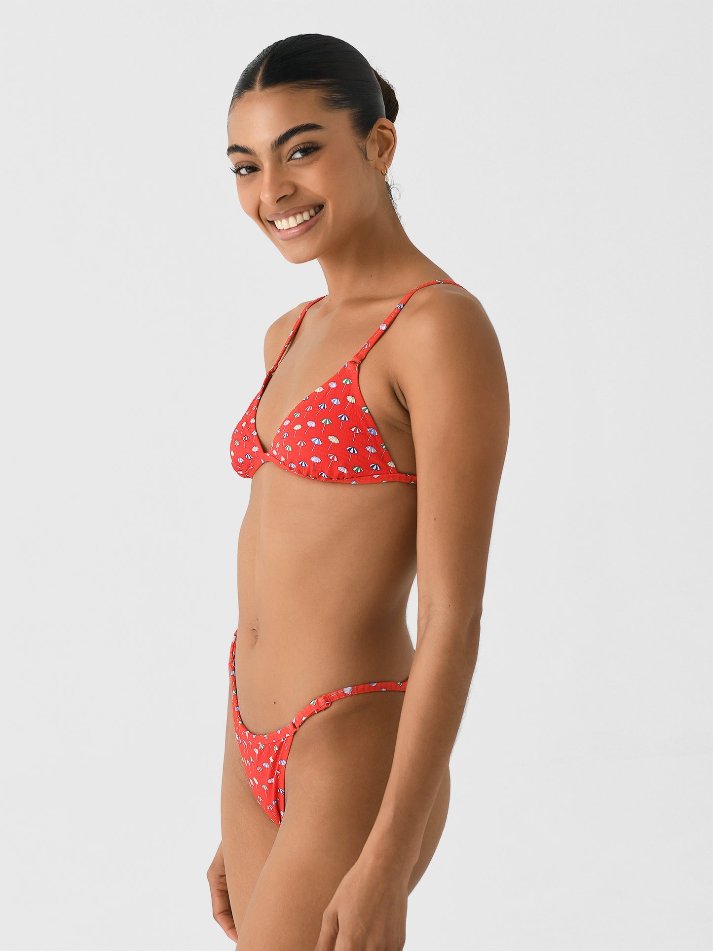 A chic, triangle bikini top with adjustable straps and a mini umbrella print.