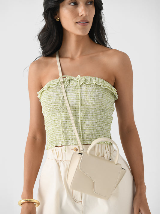 This lightweight strapless top is perfect for spring with its seersucker fabric and subtle gingham print.