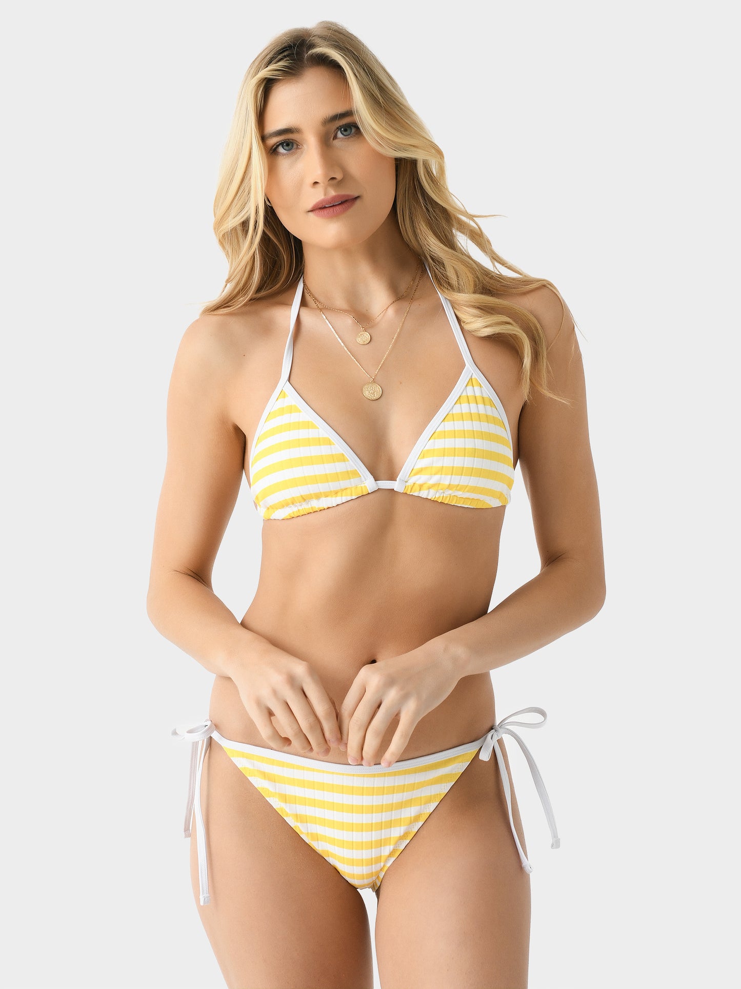 - Model is wearing size Small bikini top.
