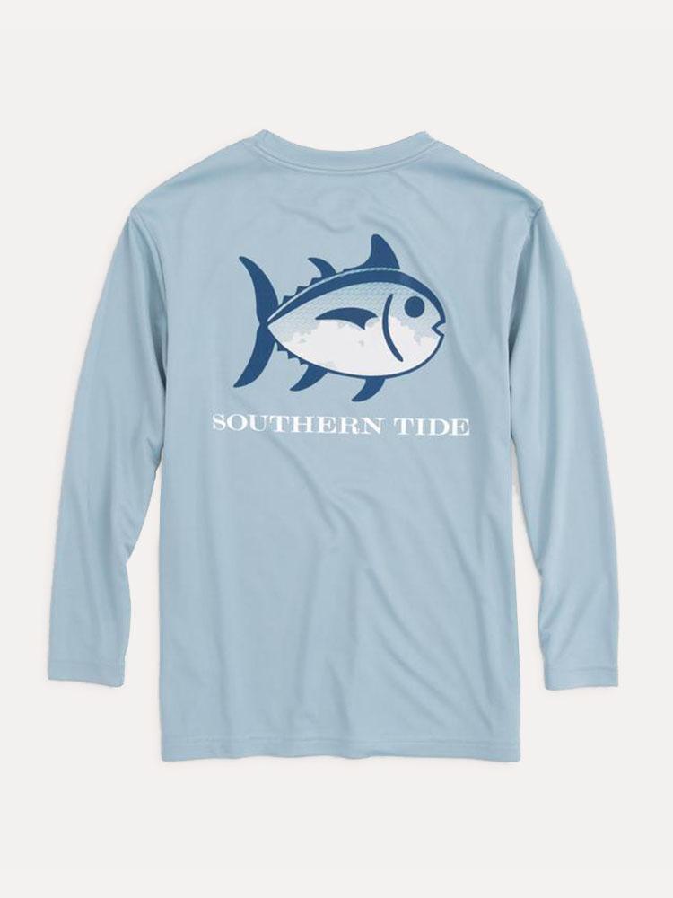 He will be play time ready in the Southern Tide Boys' Long Sleeve Skipjack Great White Performance Tee.