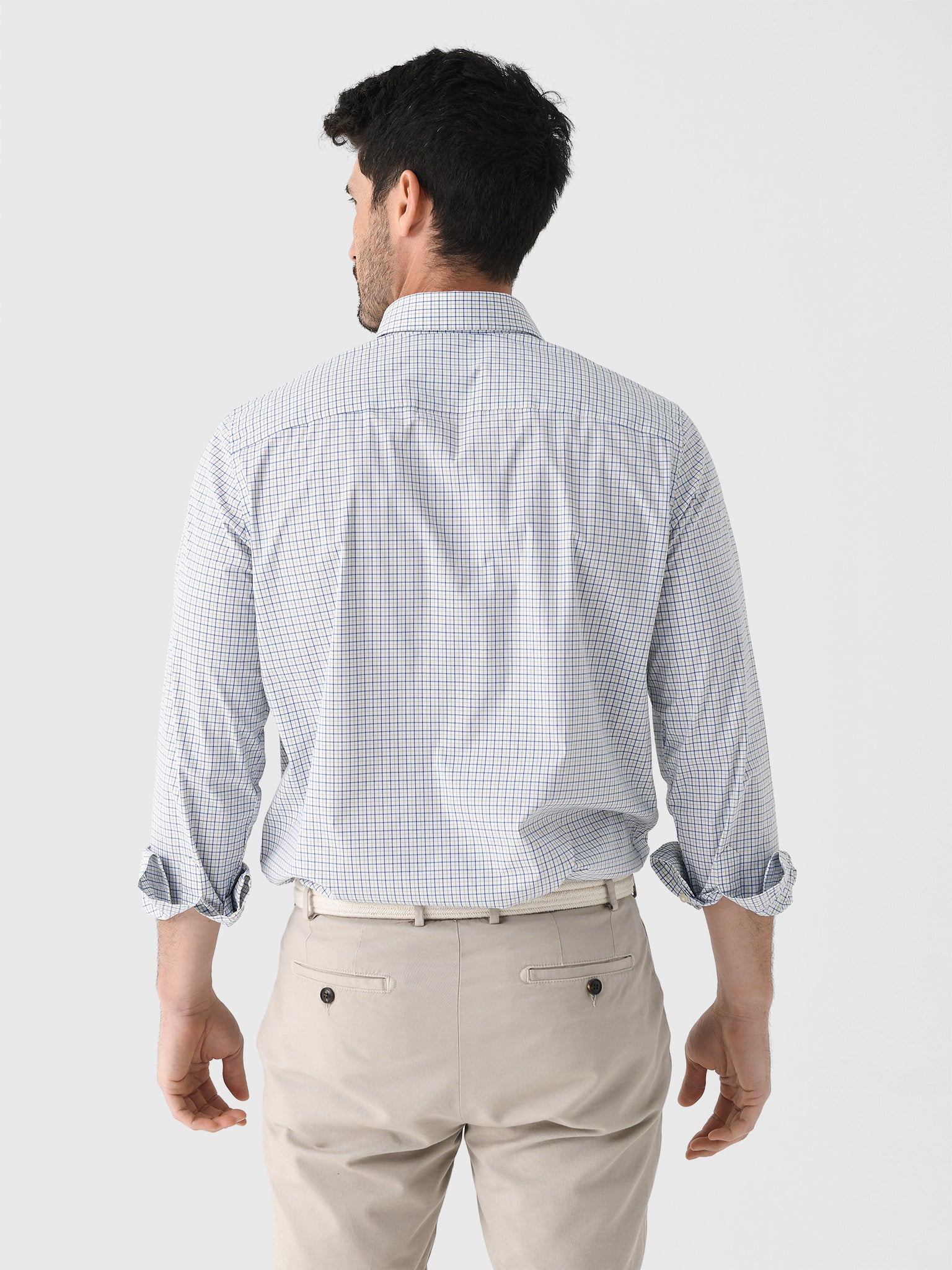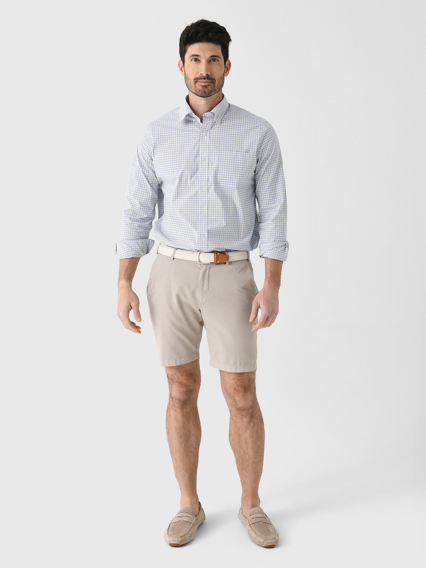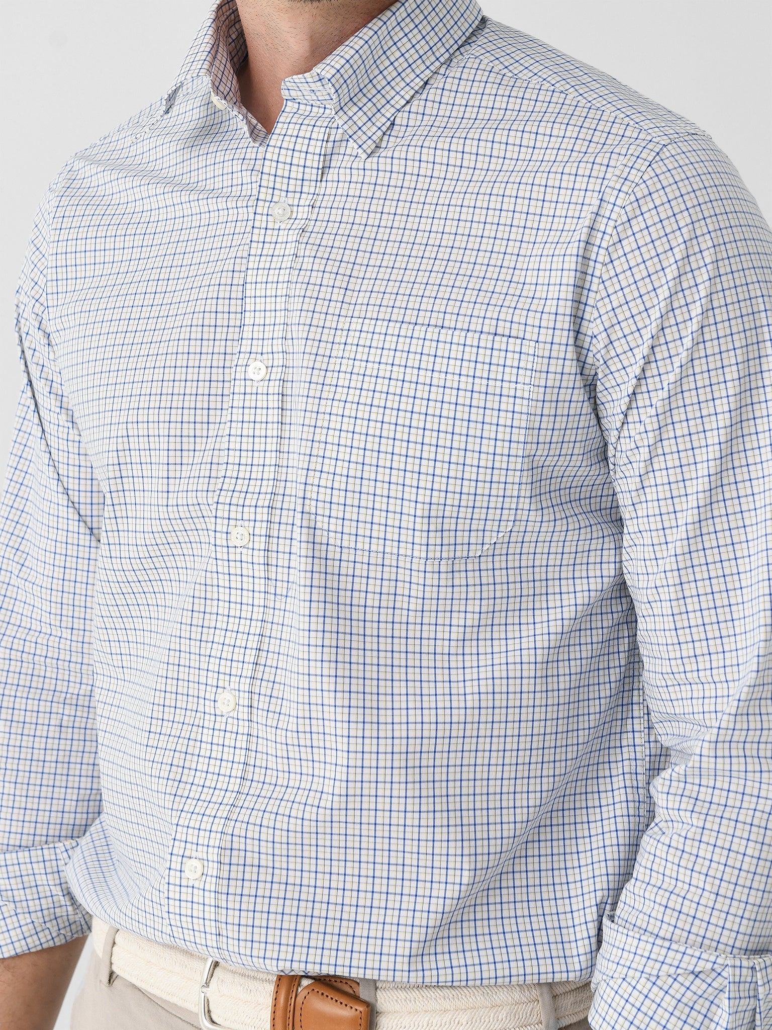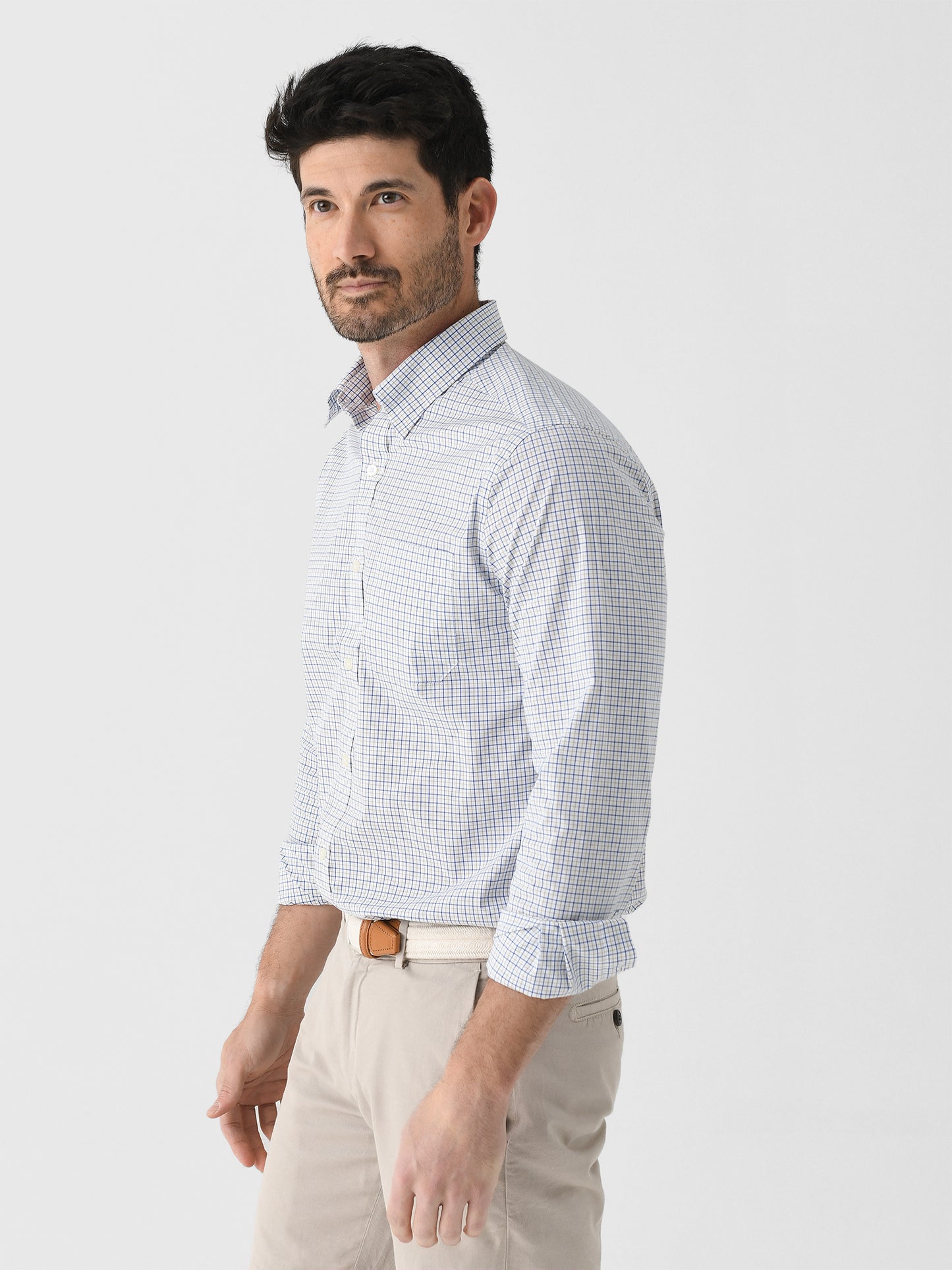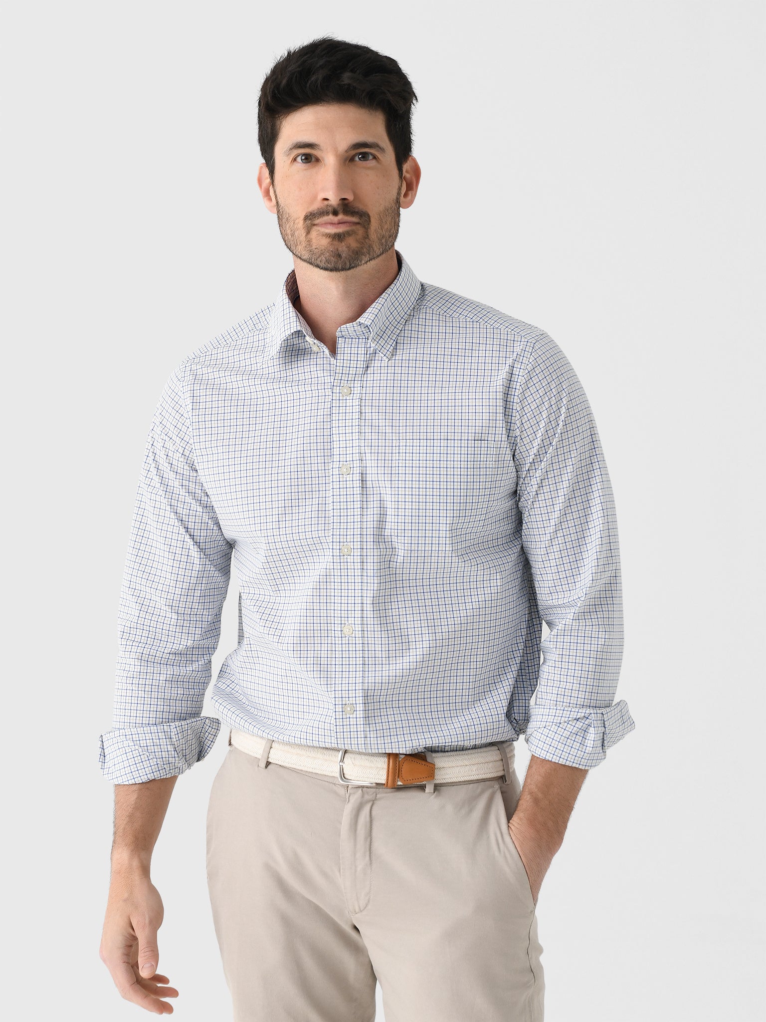 Easily transition between occasions with this breathable sports shirt featuring a bright plaid pattern and hidden button-down collar.