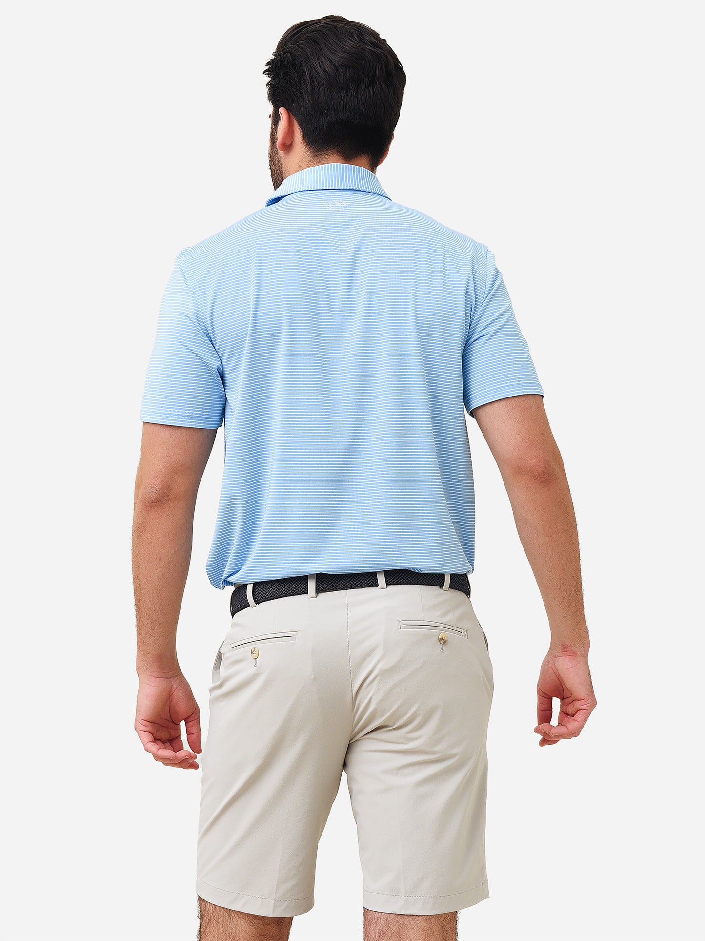 Striped performance polo with performance properties.