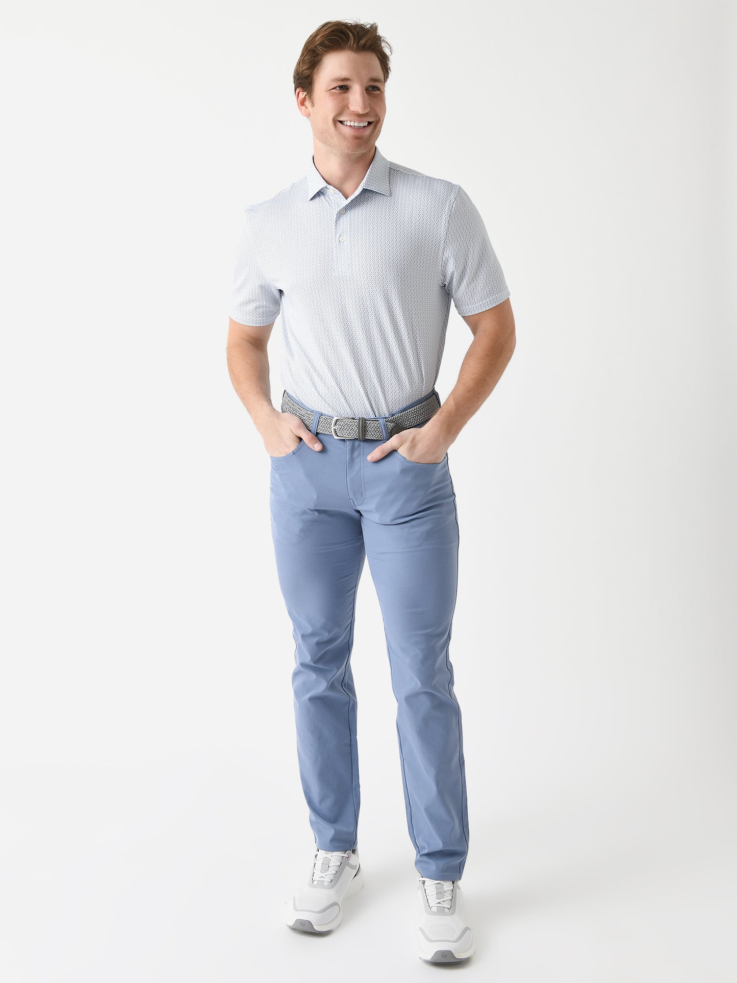 A flexible performance polo crafted from sustainable materials and moisture-wicking technology.