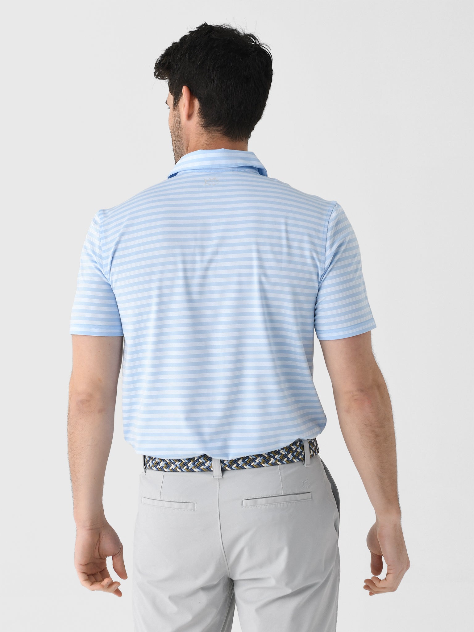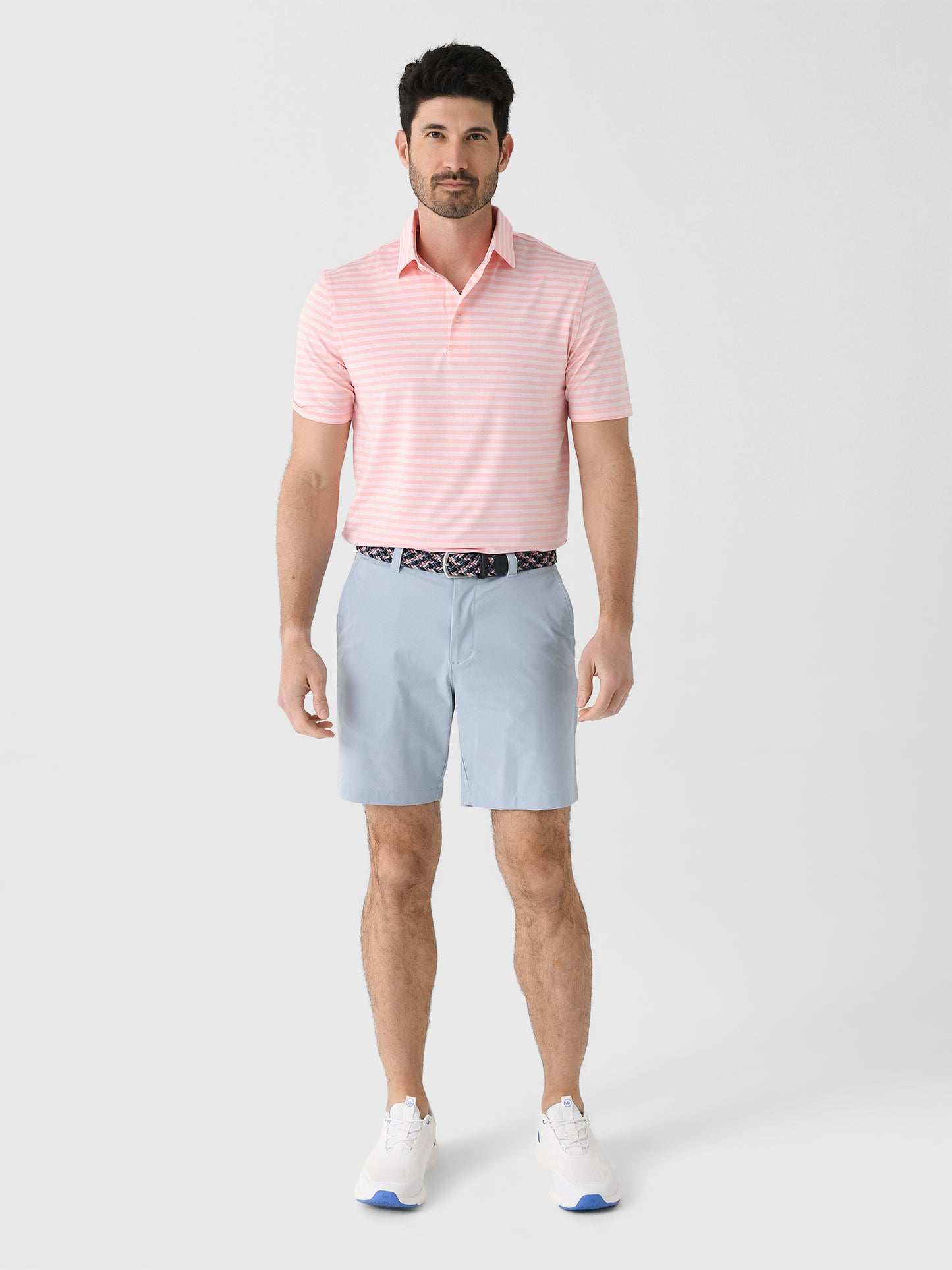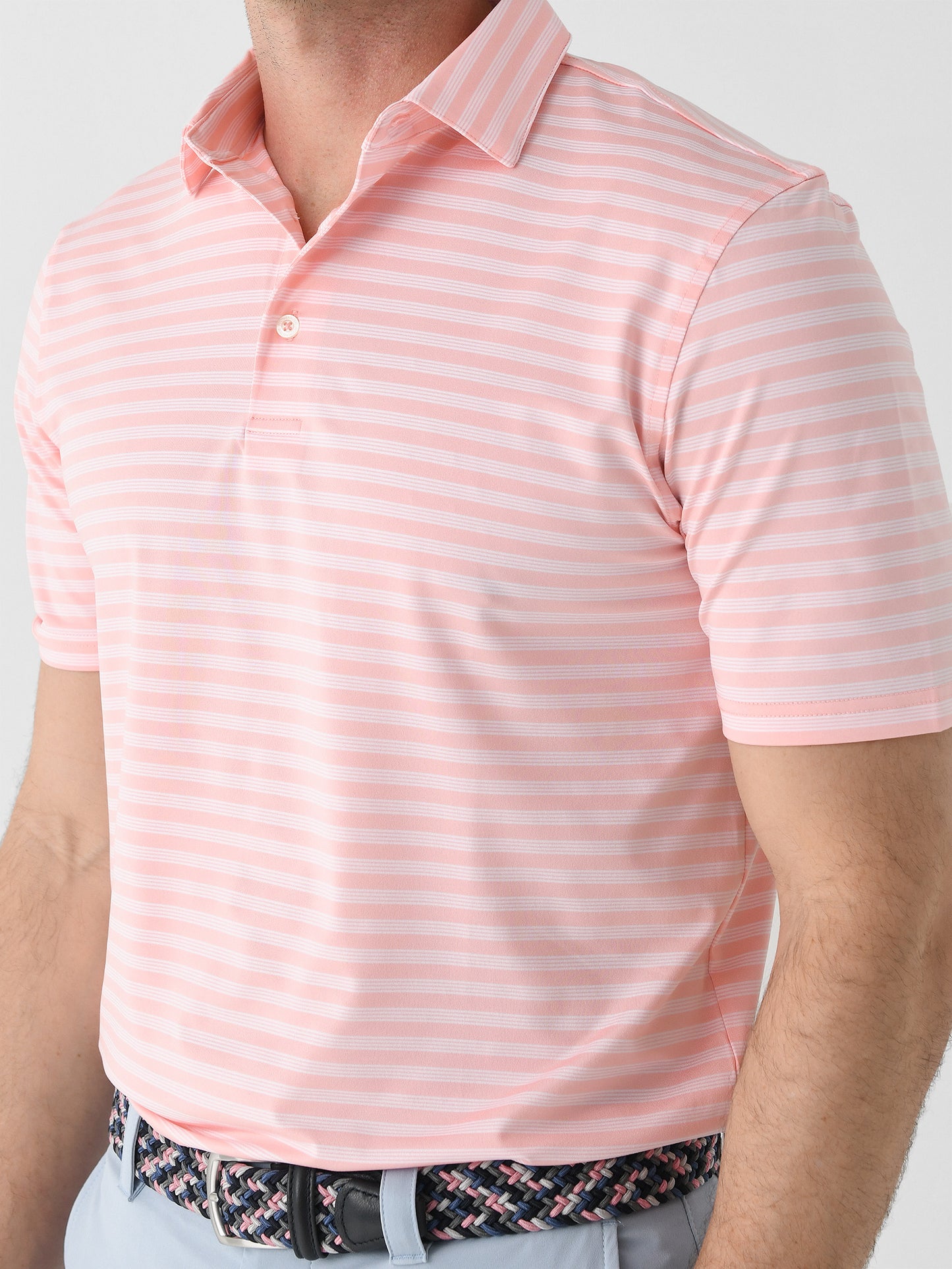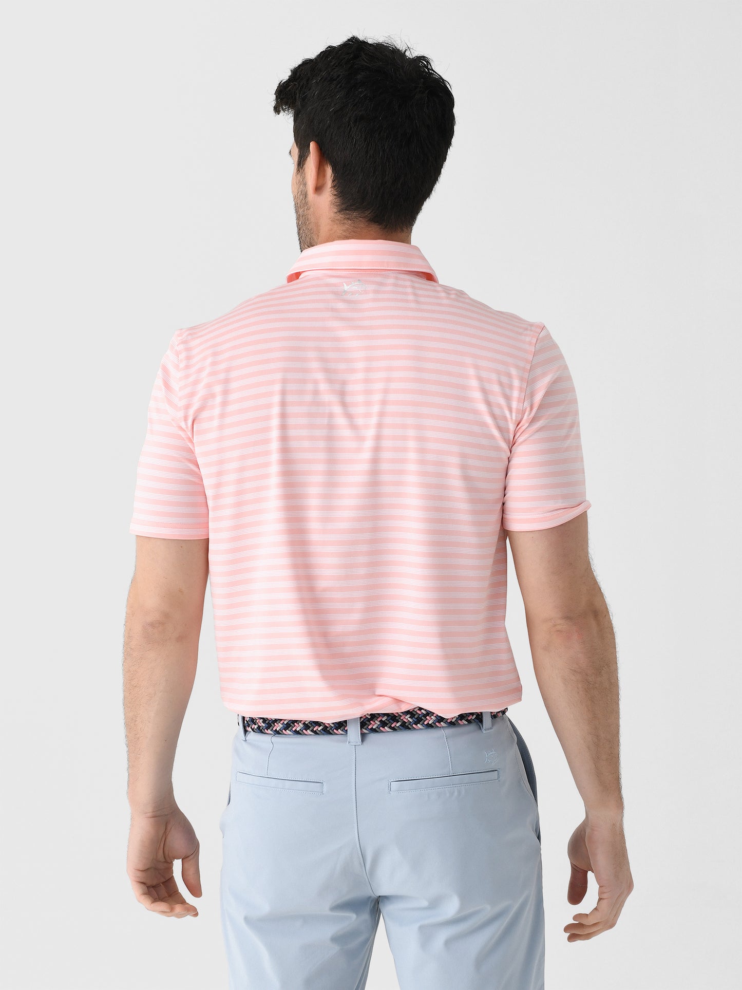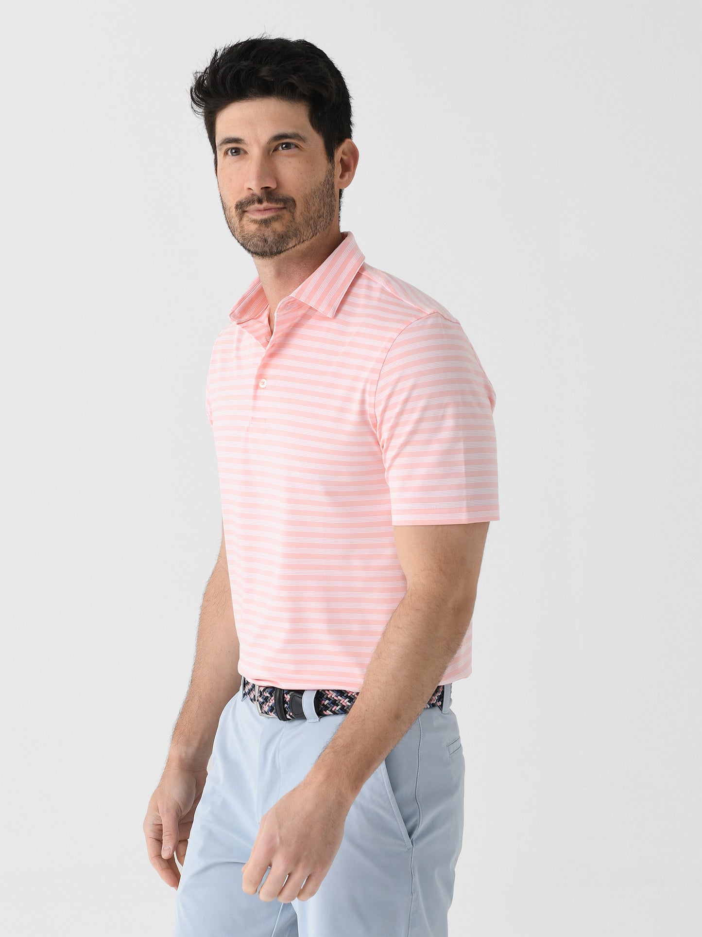 This striped polo is a sustainable and stylish choice for your warm-weather wardrobe. Made from a recycled polyester and spandex blend, it offers exceptional comfort and performance, while the self-collar and drop-tail hem add a touch of modern style.