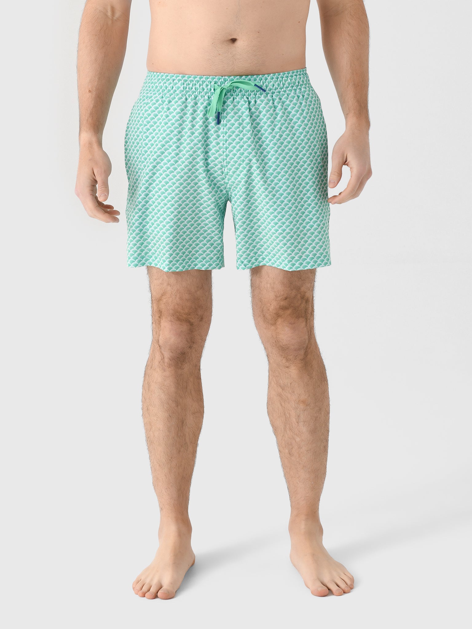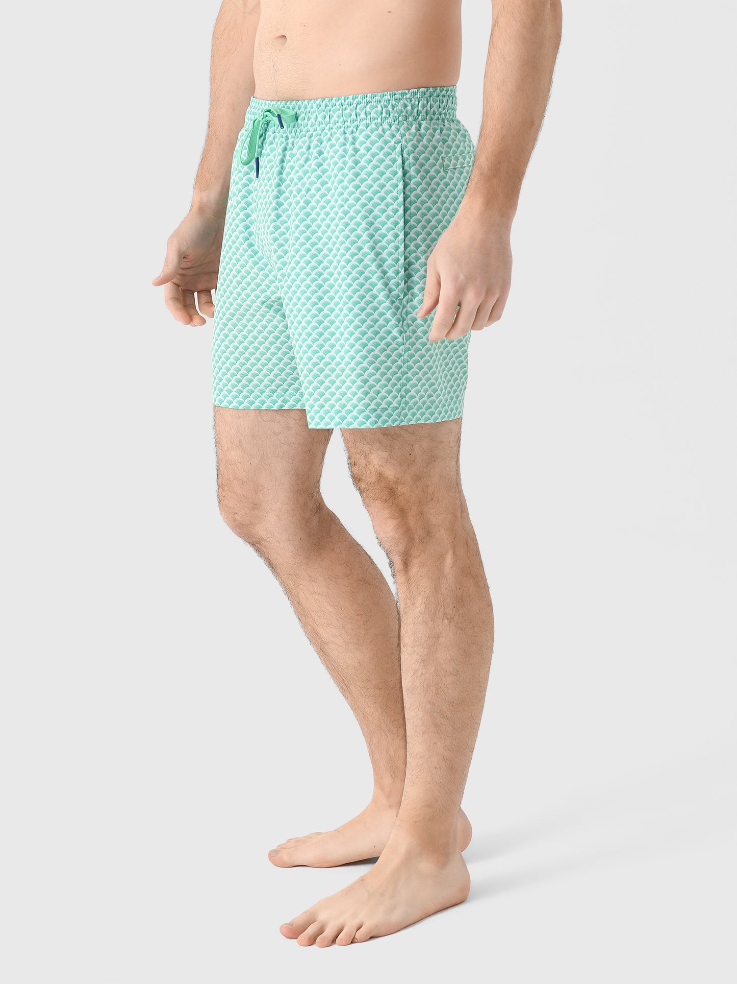 A lightweight swim trunk with a micro-mesh brief liner and stretch fabric for all-day comfort featuring a custom scalloped golf ball print.
