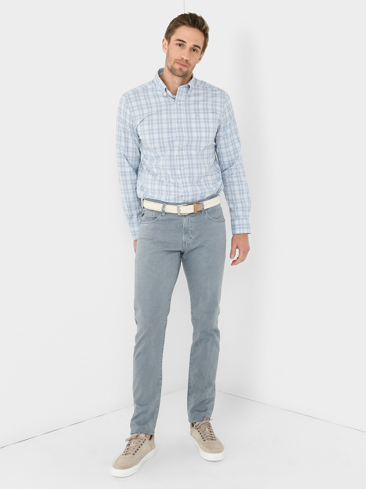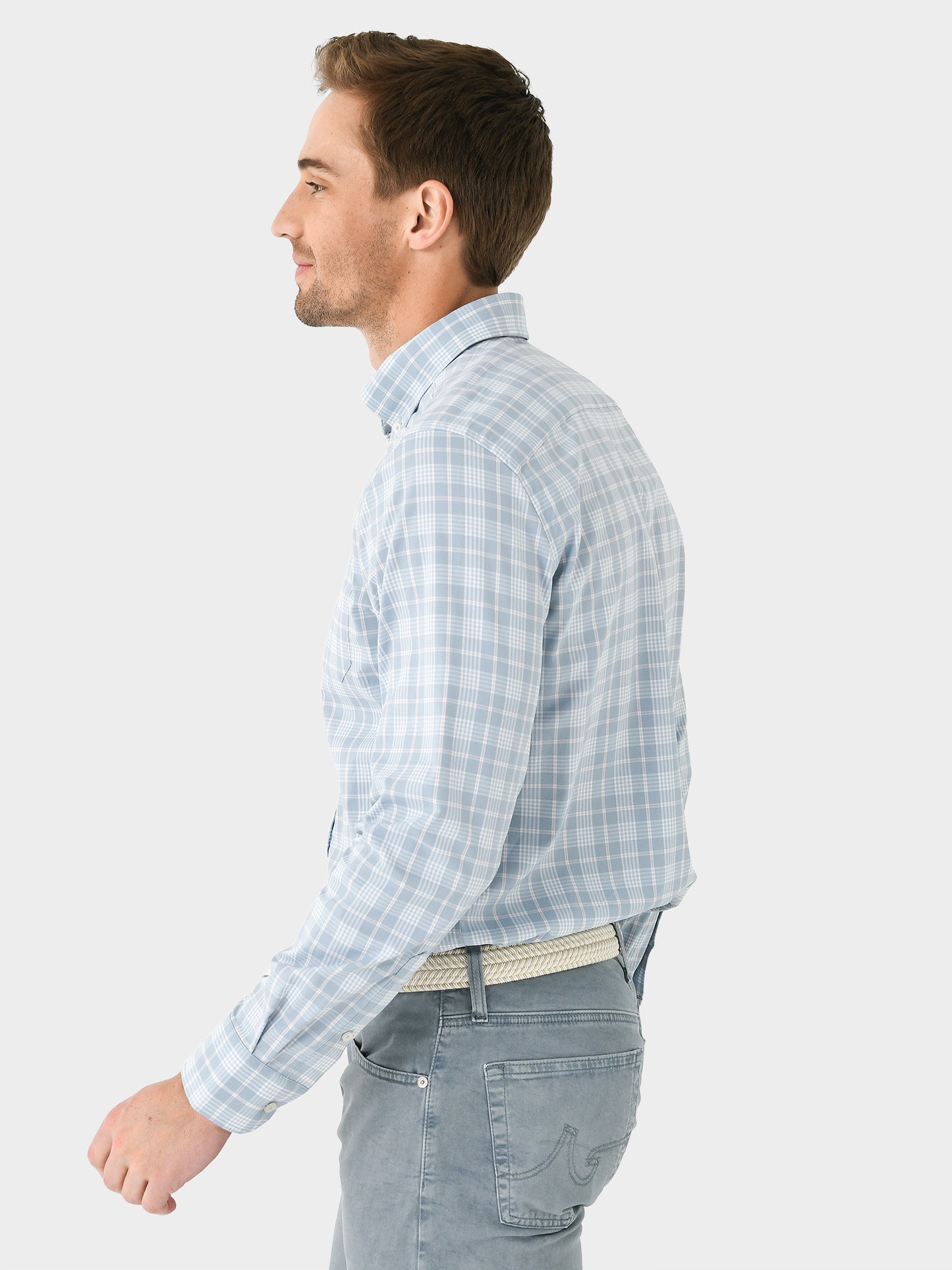 A performance button-down shirt with moisture-wicking and anti-odor technology.