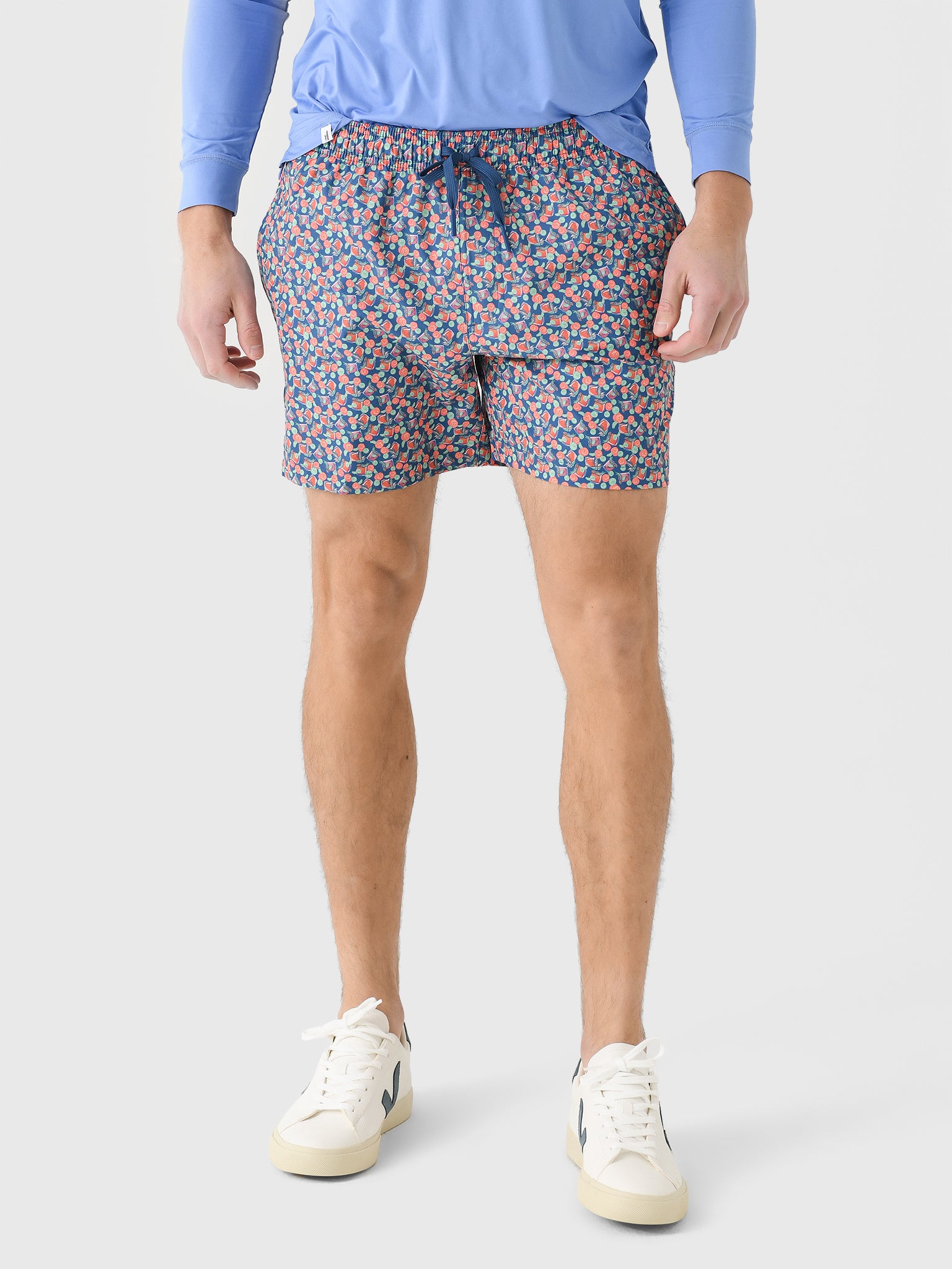 This flexible swim trunk is made from breathable fabric and features a custom beverage-inspired print.