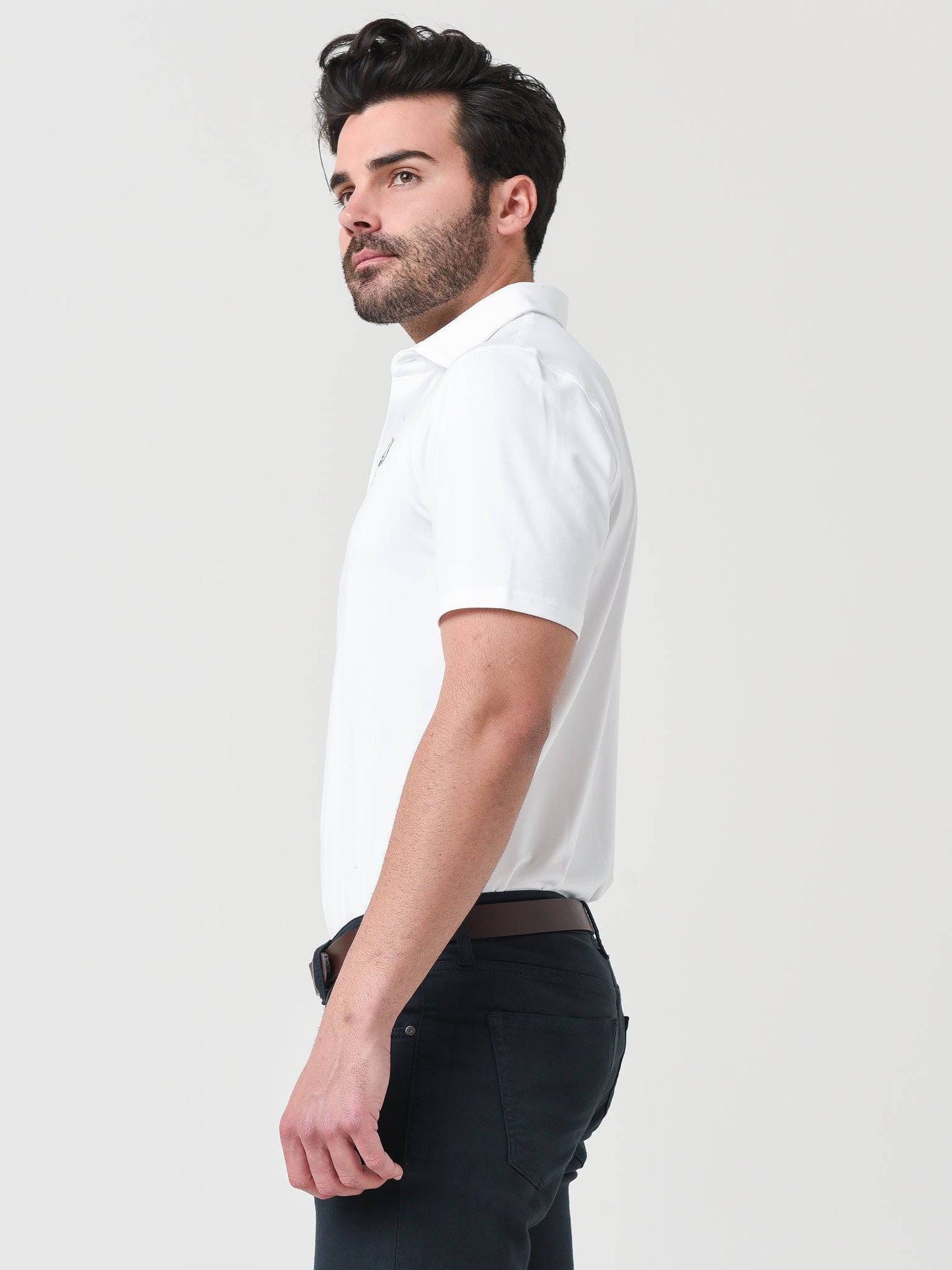 - Model is wearing size Medium polo.