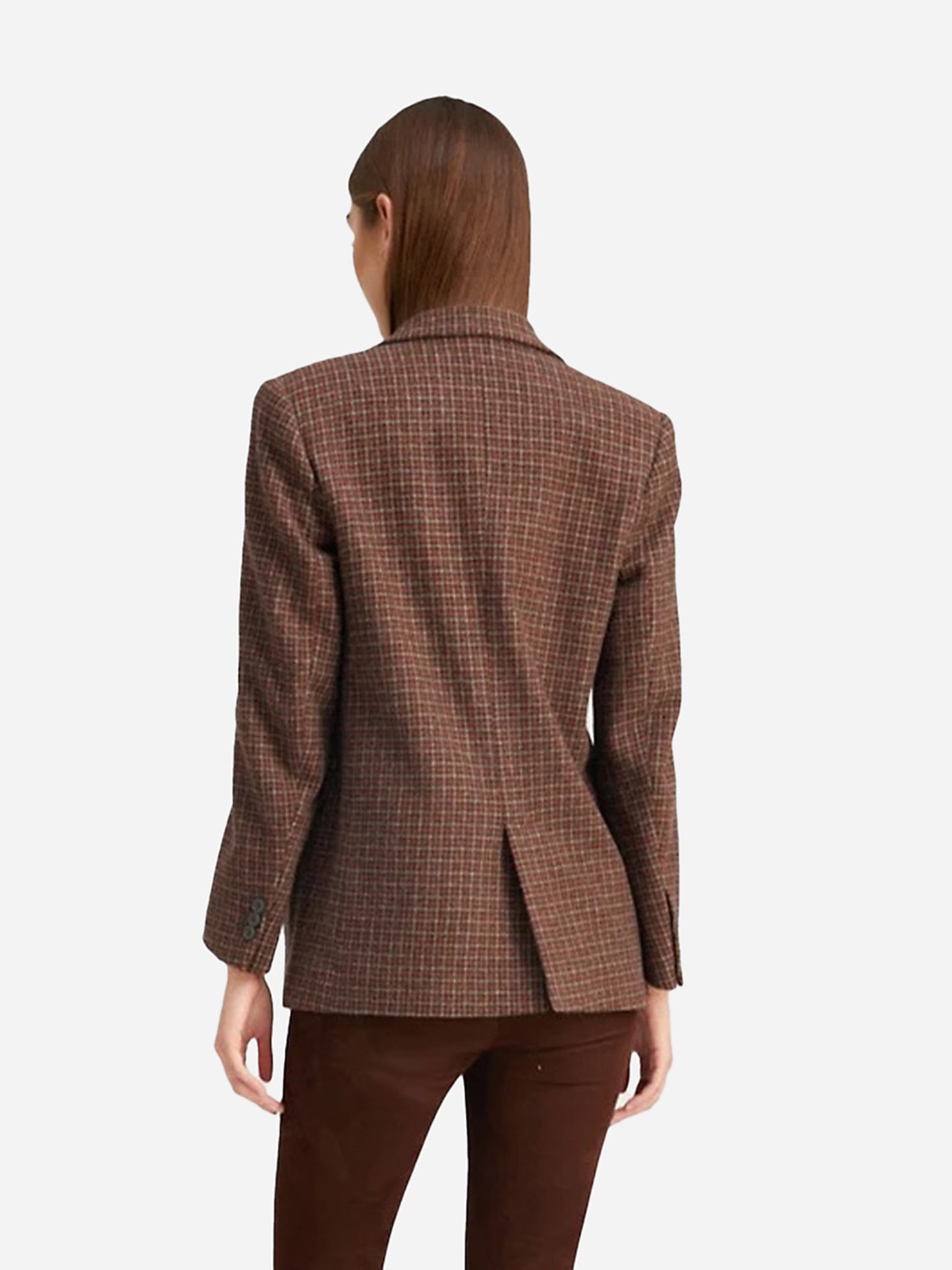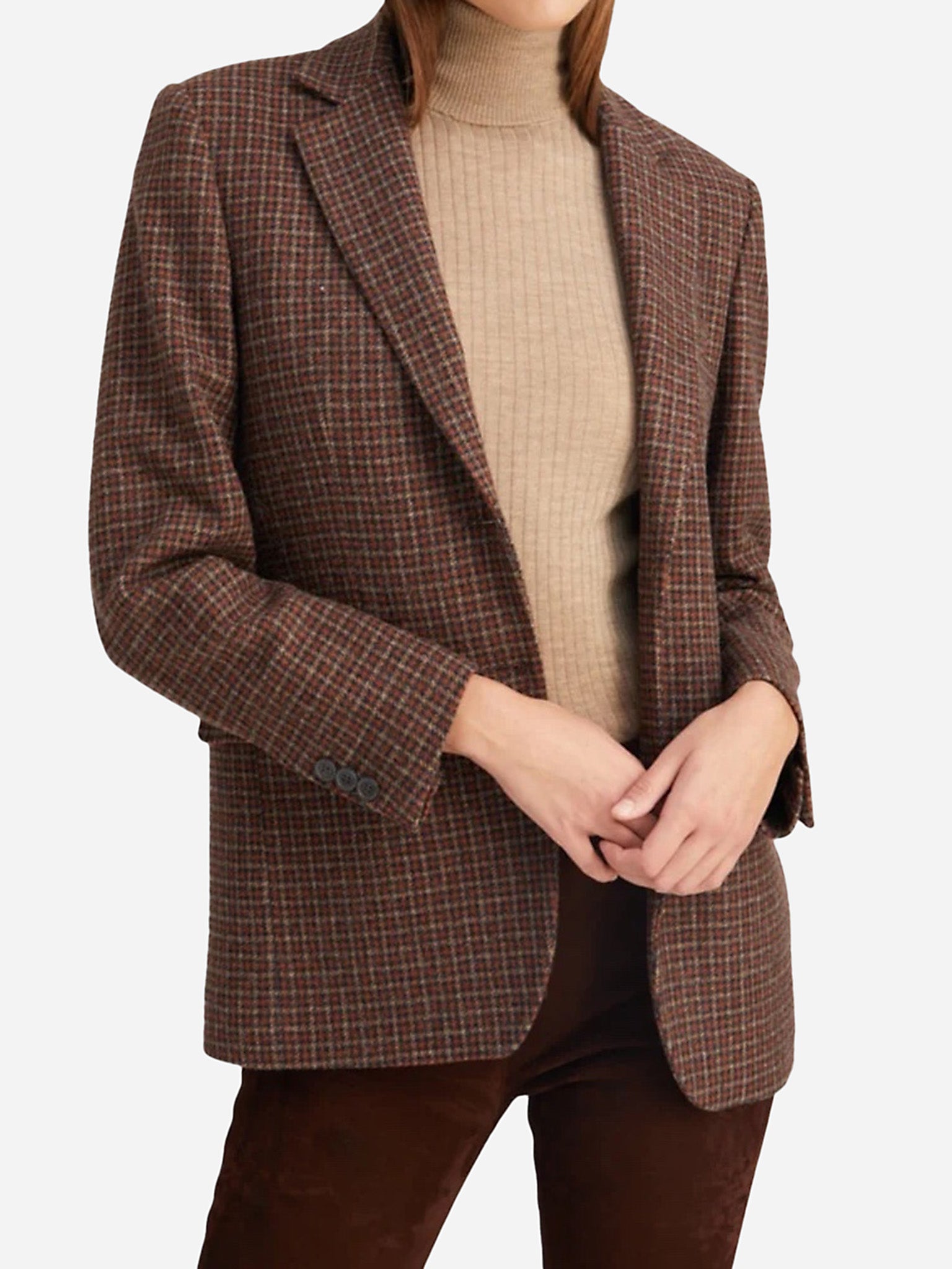 A tailored, single-breasted wool blend blazer with a classic houndstooth print and shoulder pads for added structure.