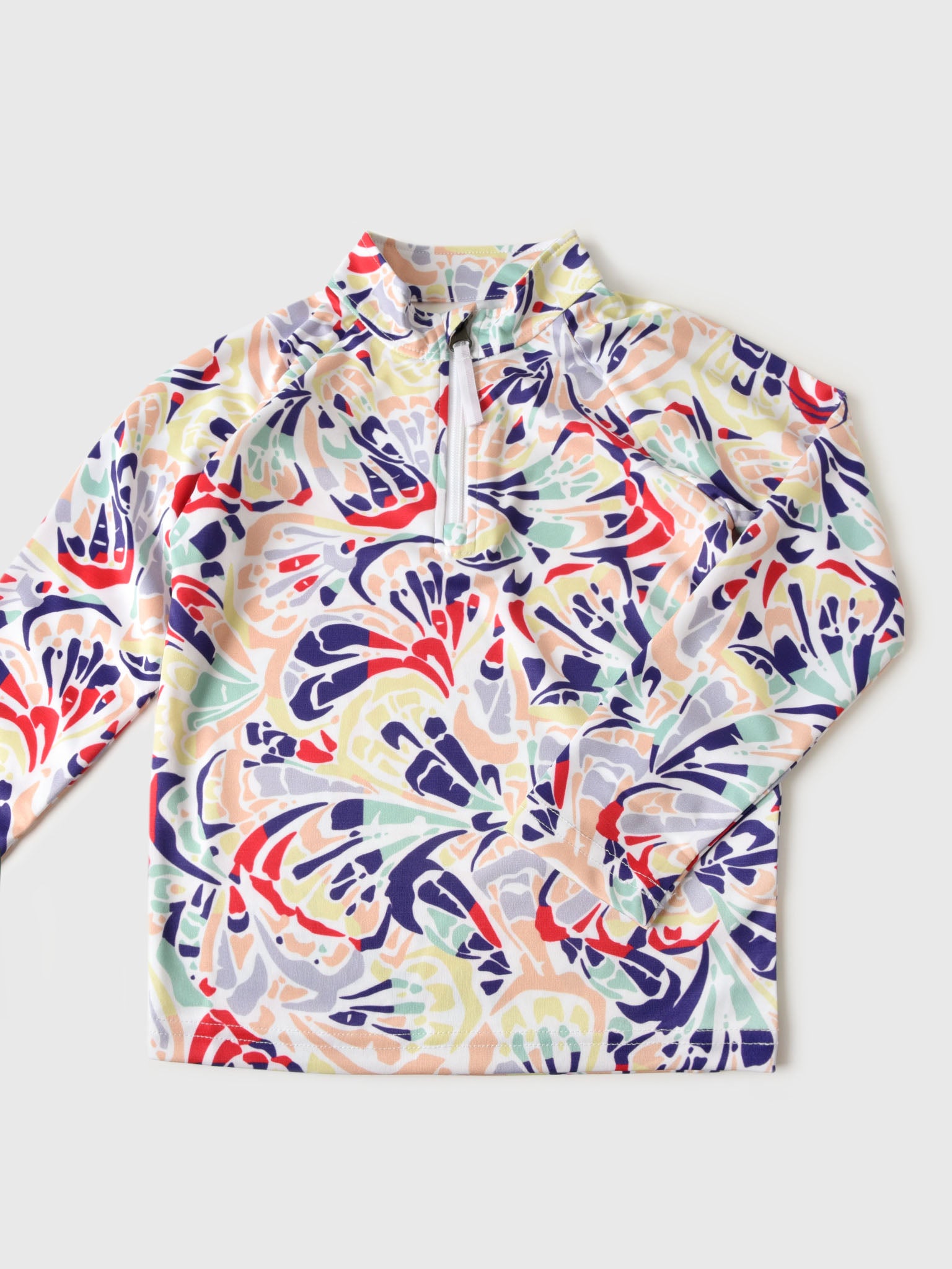 A printed half-zip made from soft moisture-wicking performance fabric.