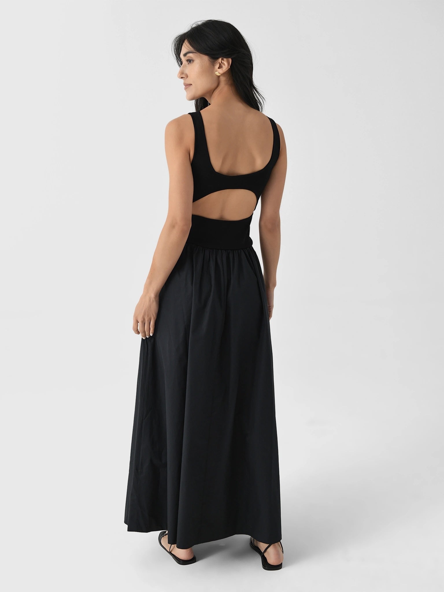 The Bateau Cut Out Dress offers a refined silhouette with subtle cut-out detailing, making it a versatile wardrobe essential. The fitted knit bodice flows into a relaxed poplin skirt and maxi length, effortlessly transitioning from day to evening.