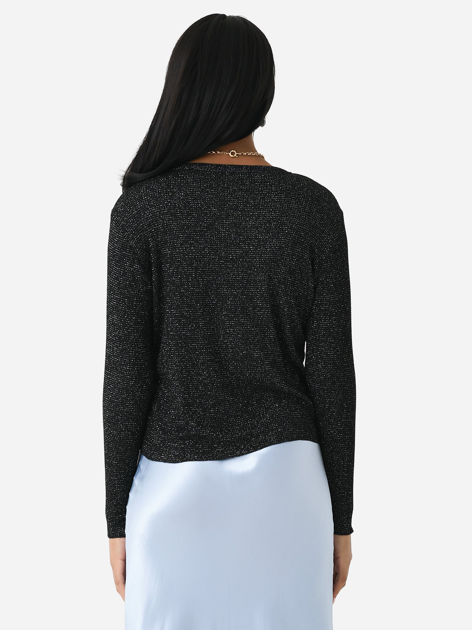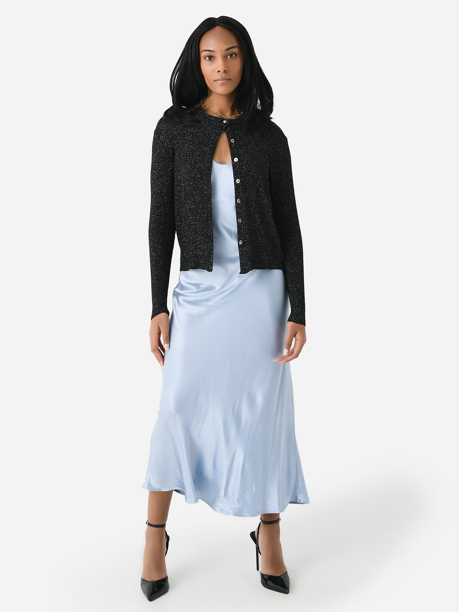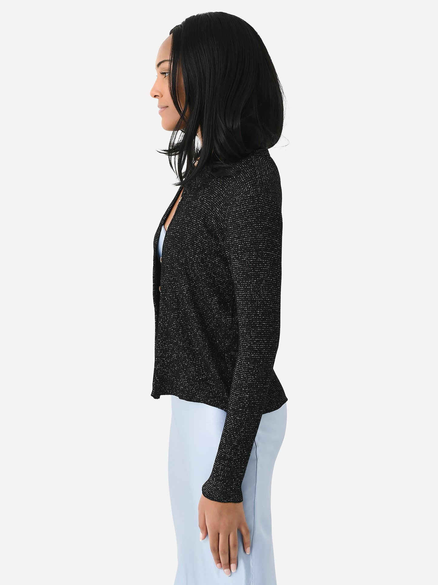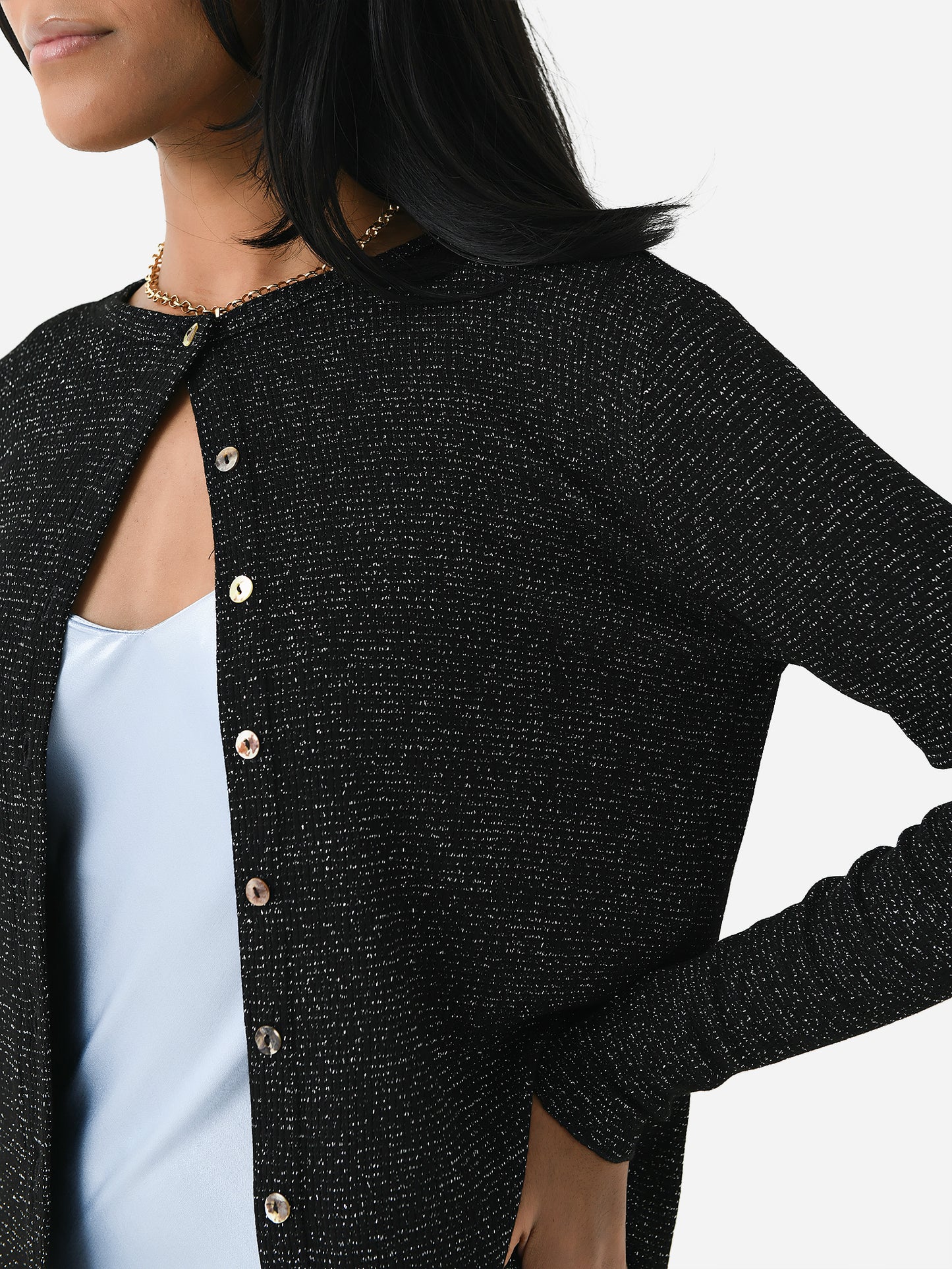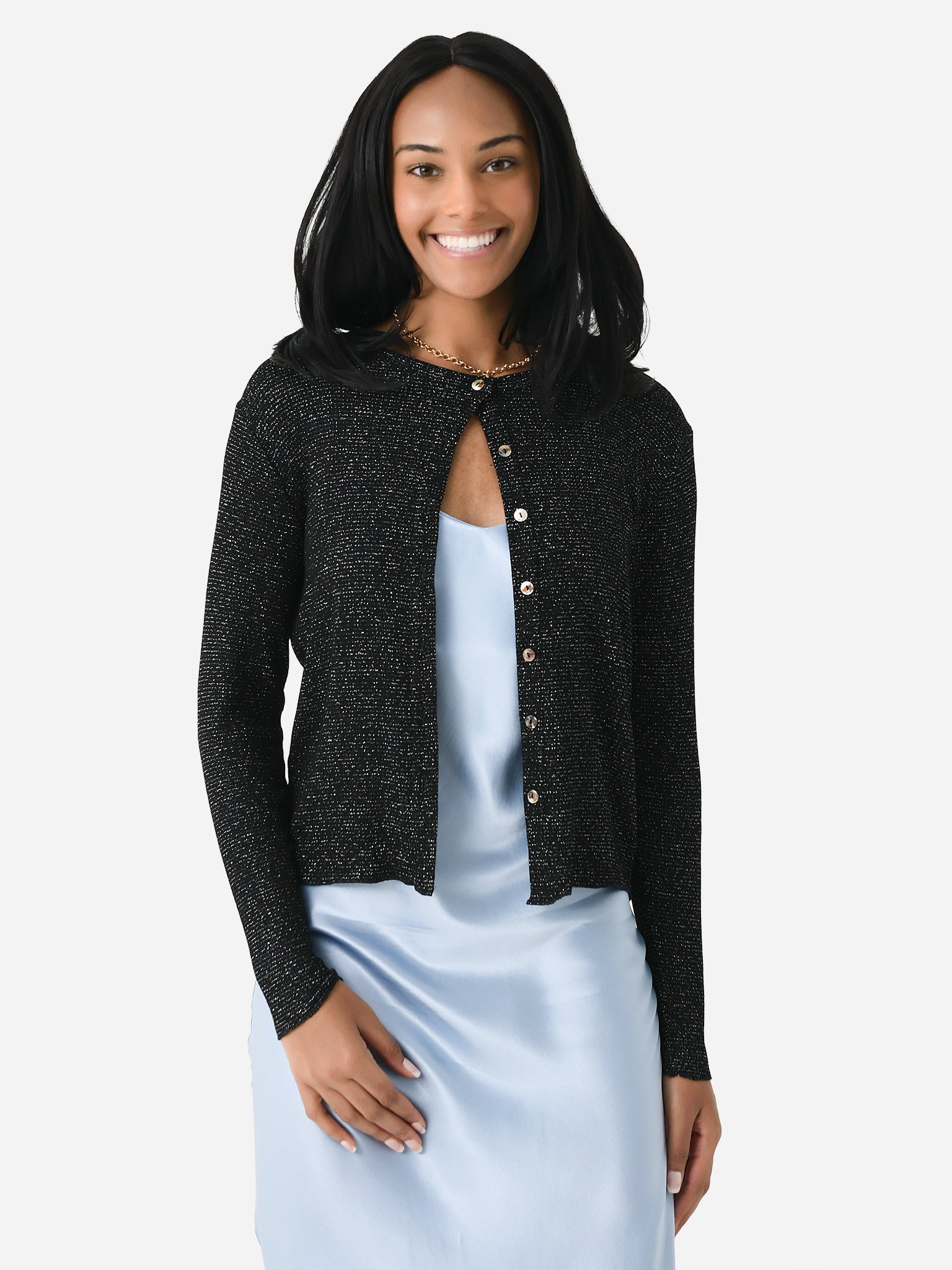 A lightweight cardigan featuring shimmer detailing perfect for the holiday season.