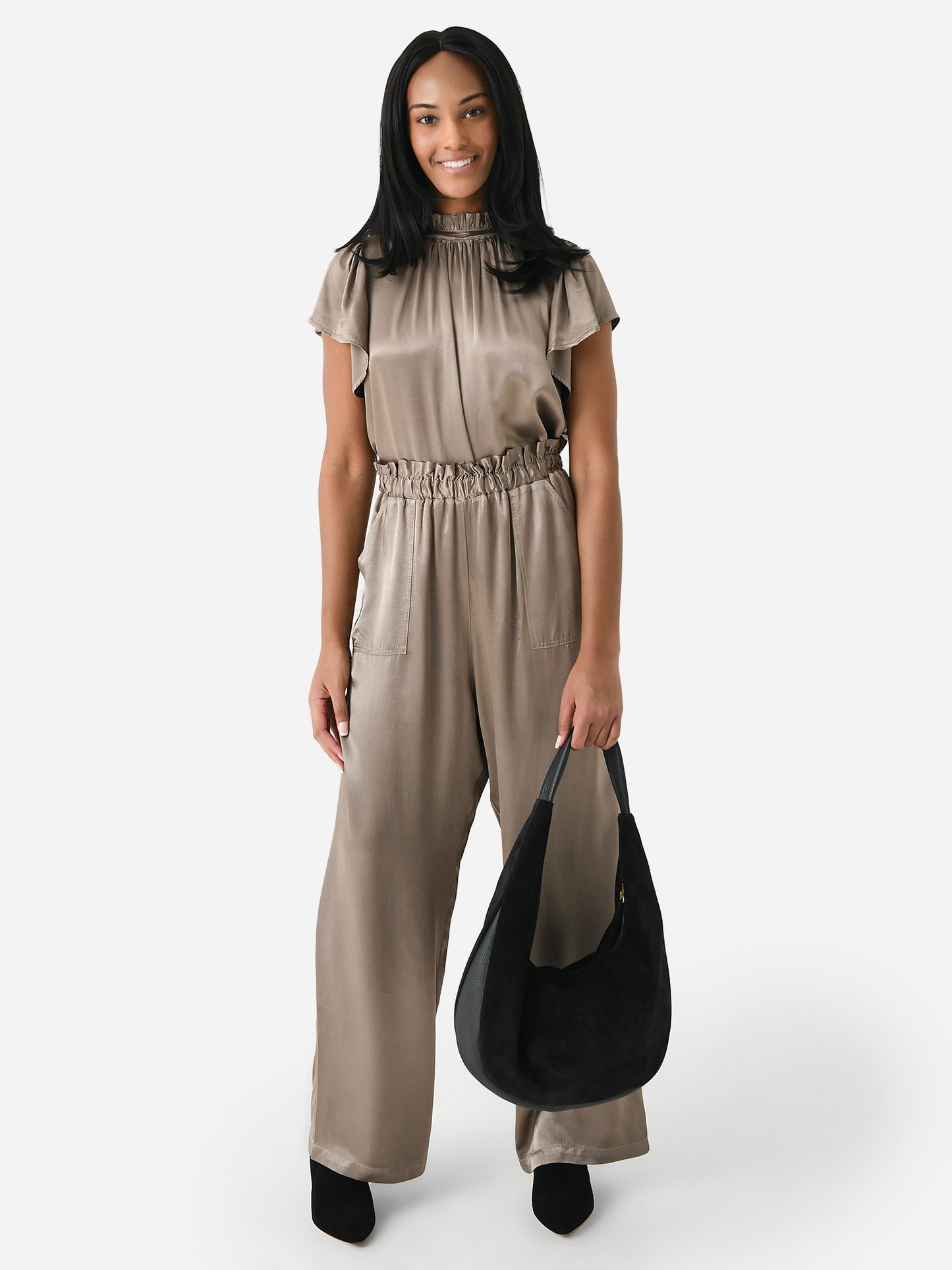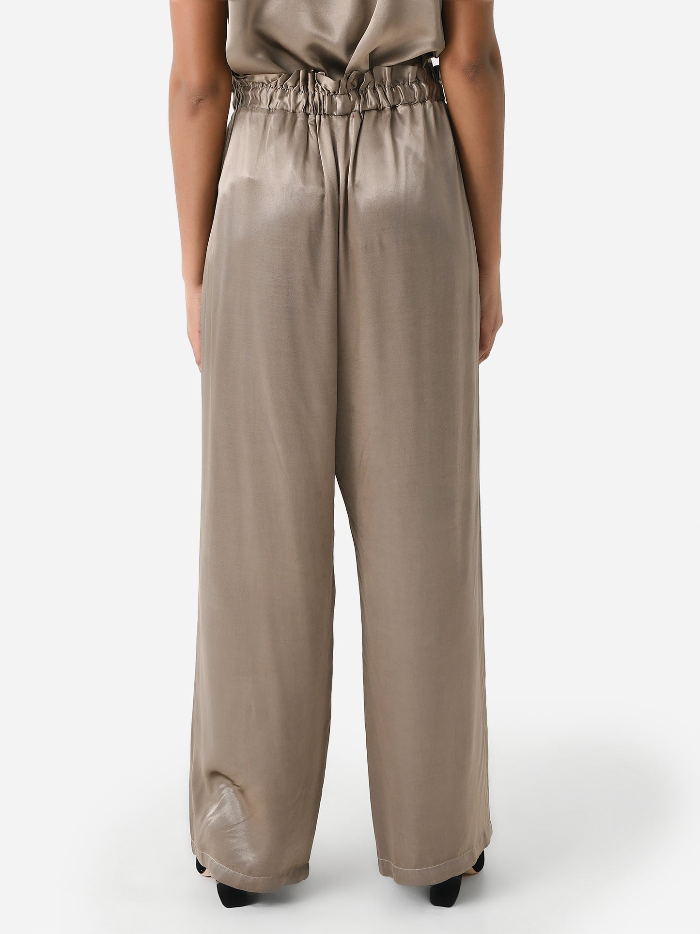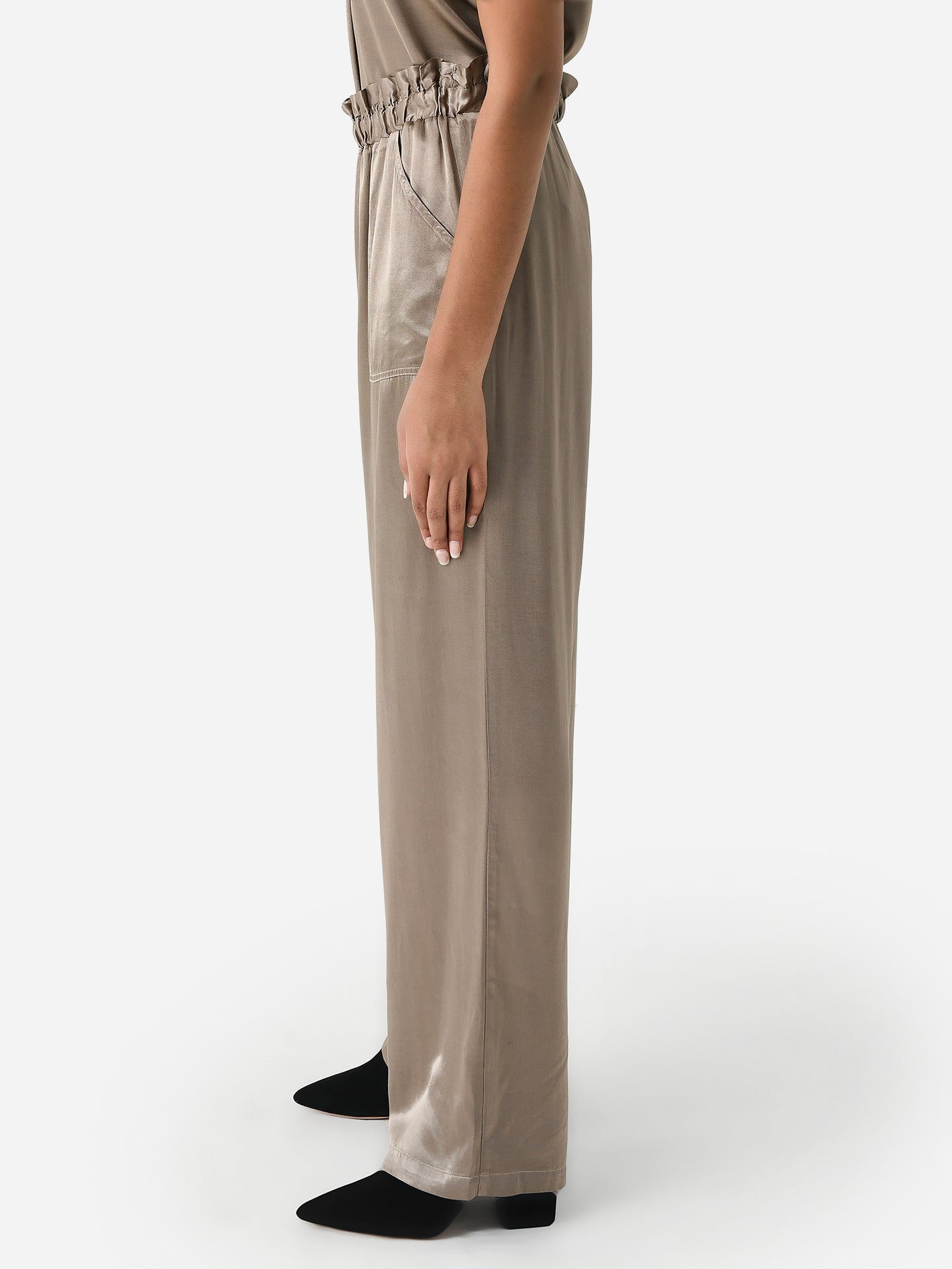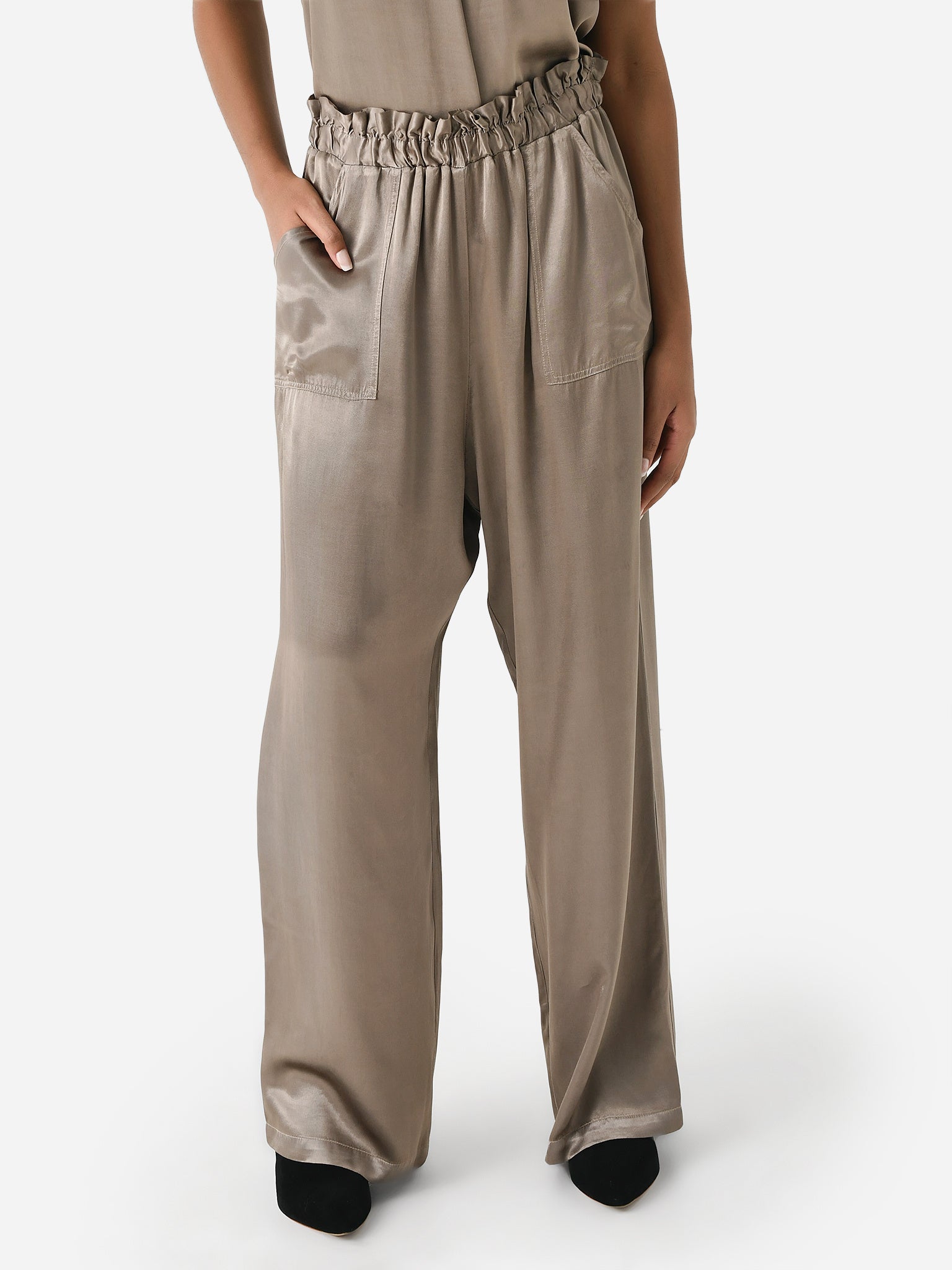 A wide-leg pant with a comfortable smocked waistband made from silky rayon fabric.