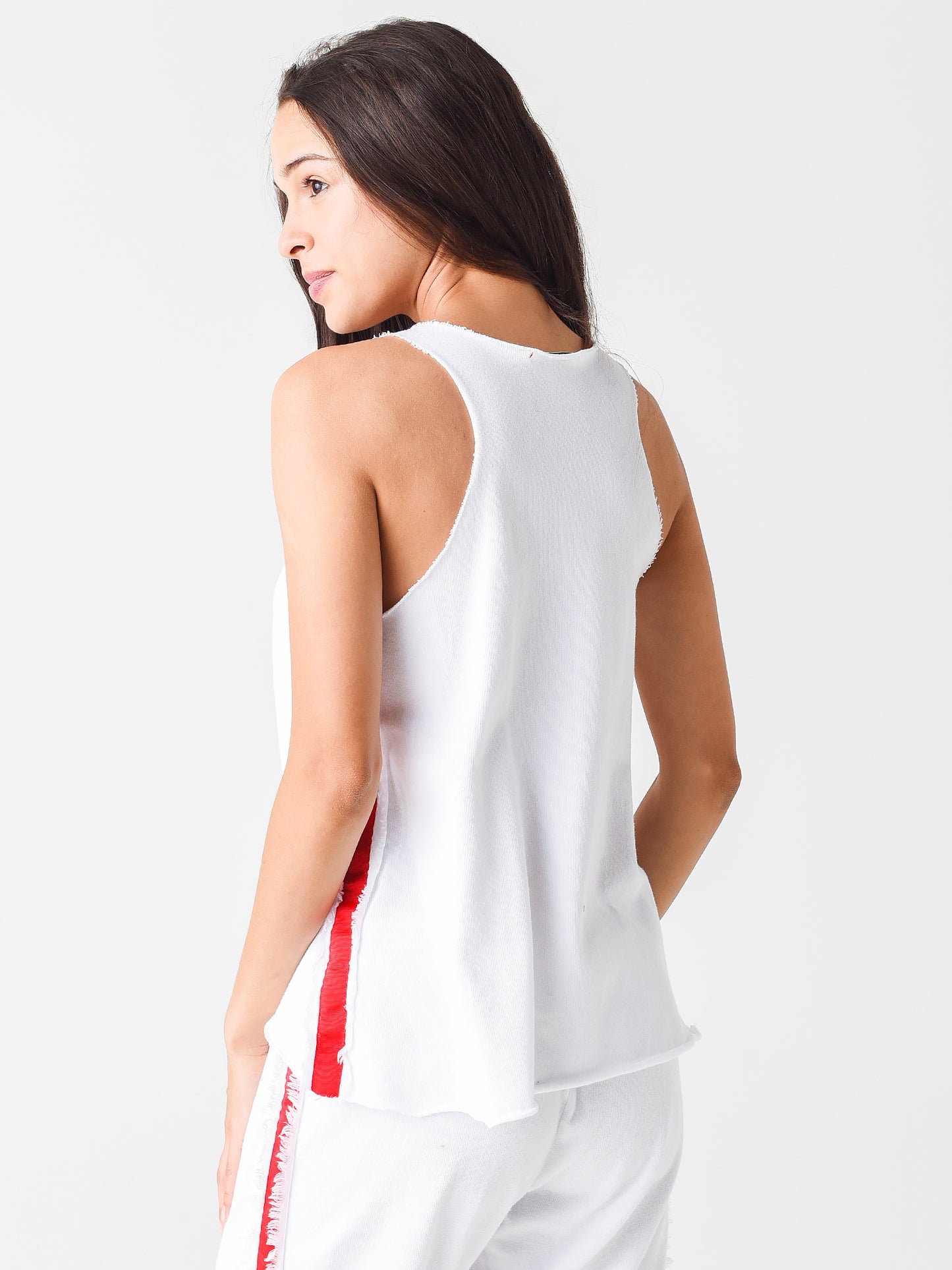 High-low tank top with raw edges and contrasting side details.