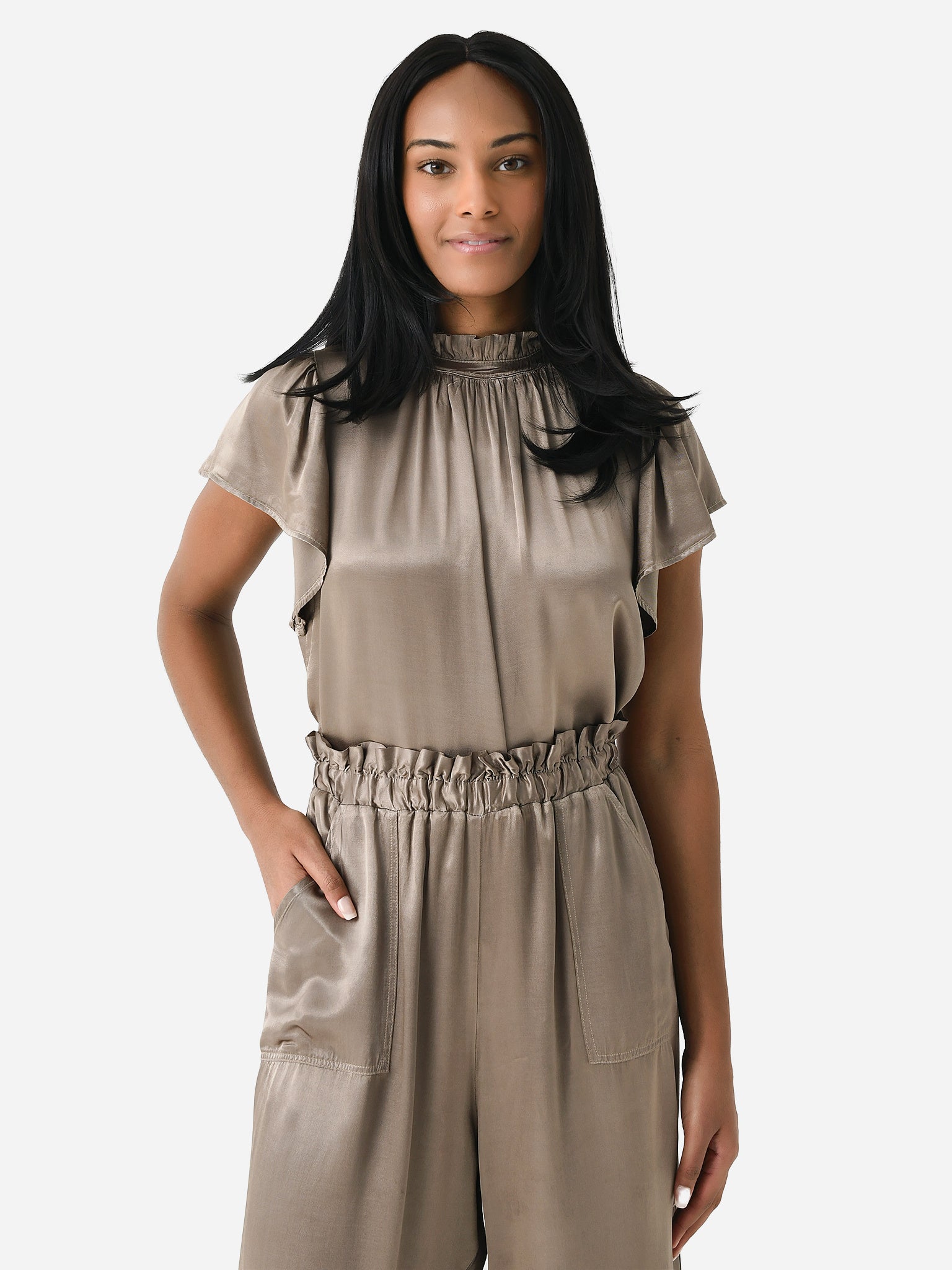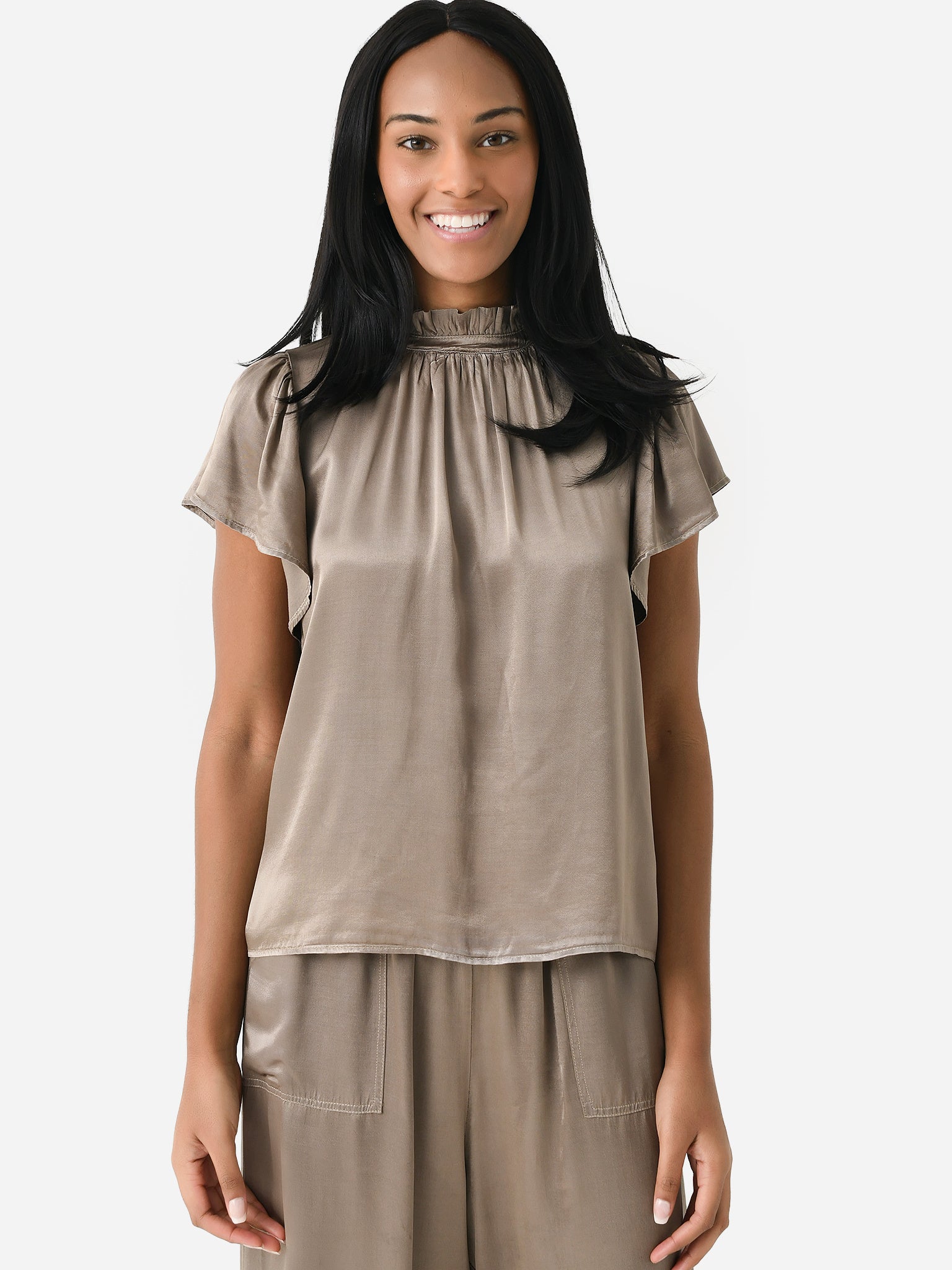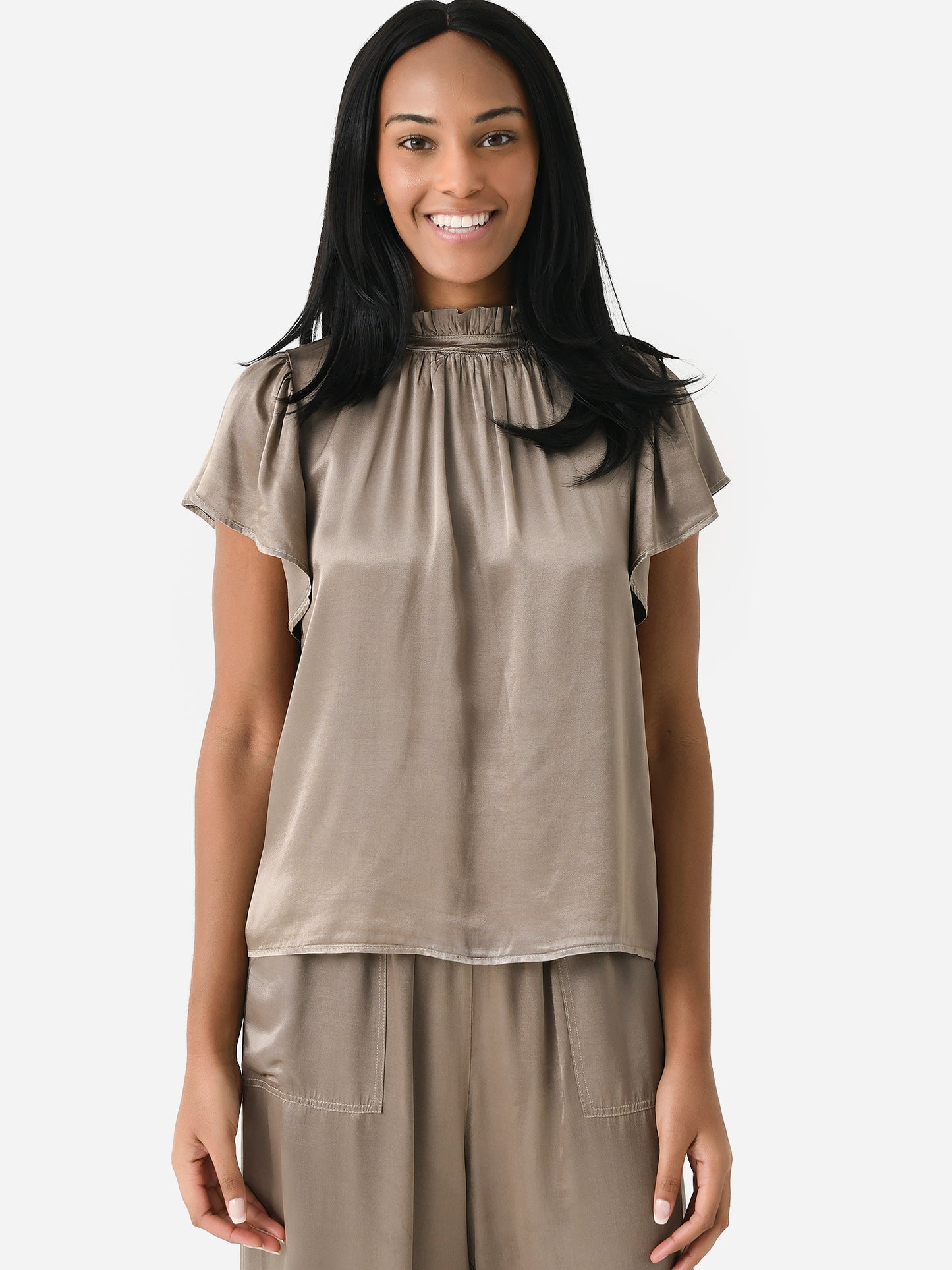 A flutter-sleeve blouse made from silky rayon with a high ruffle neckline.