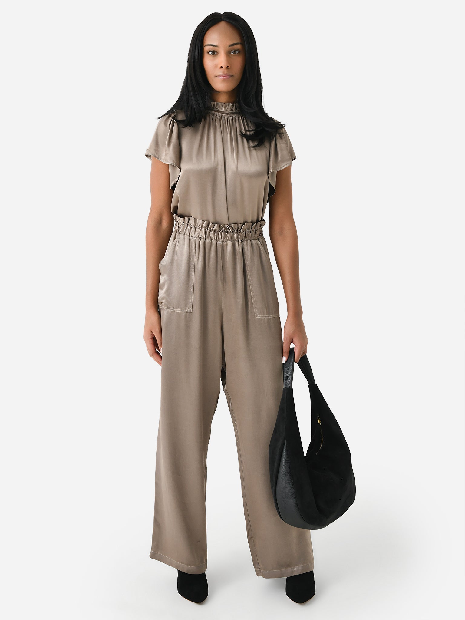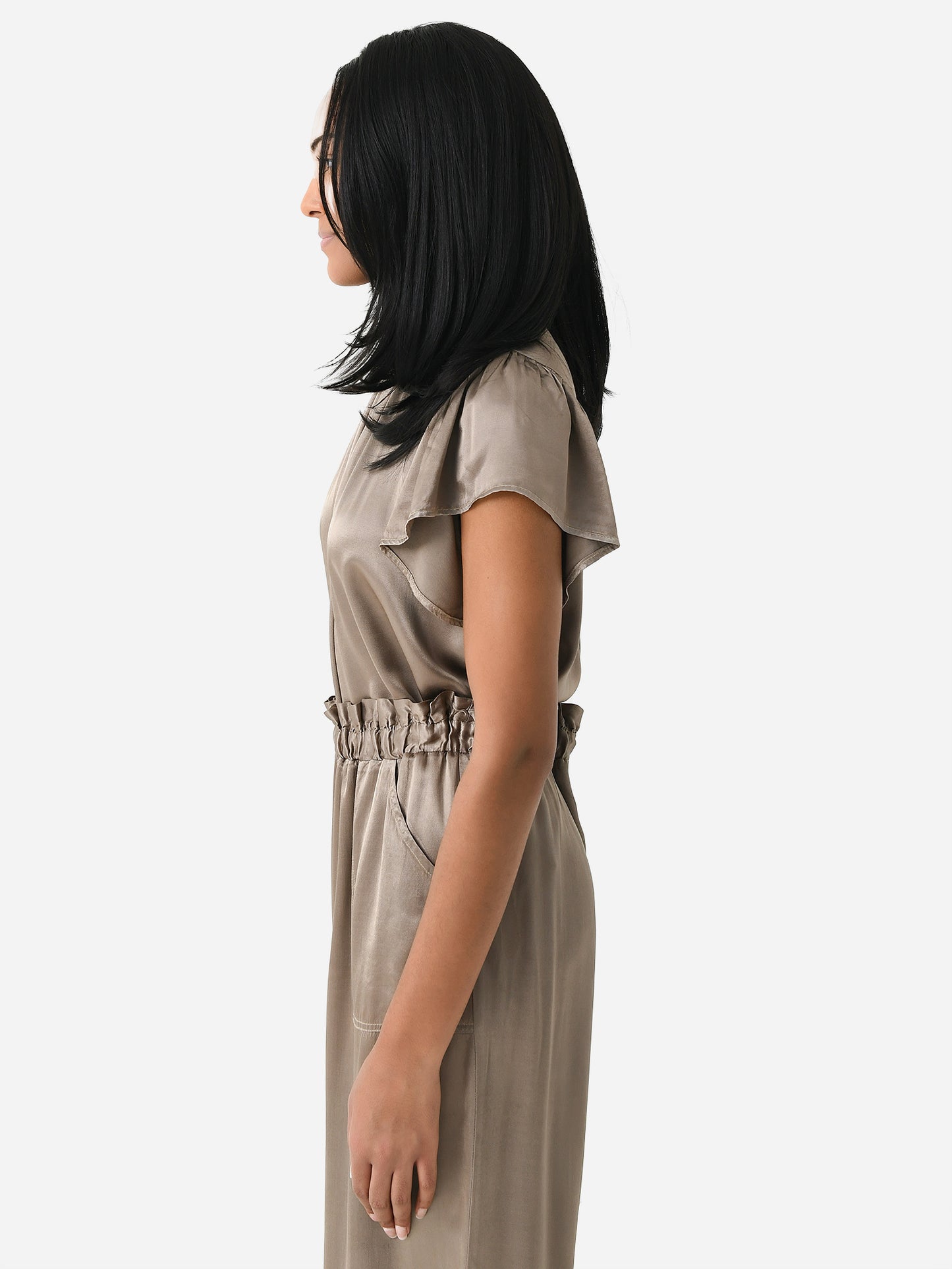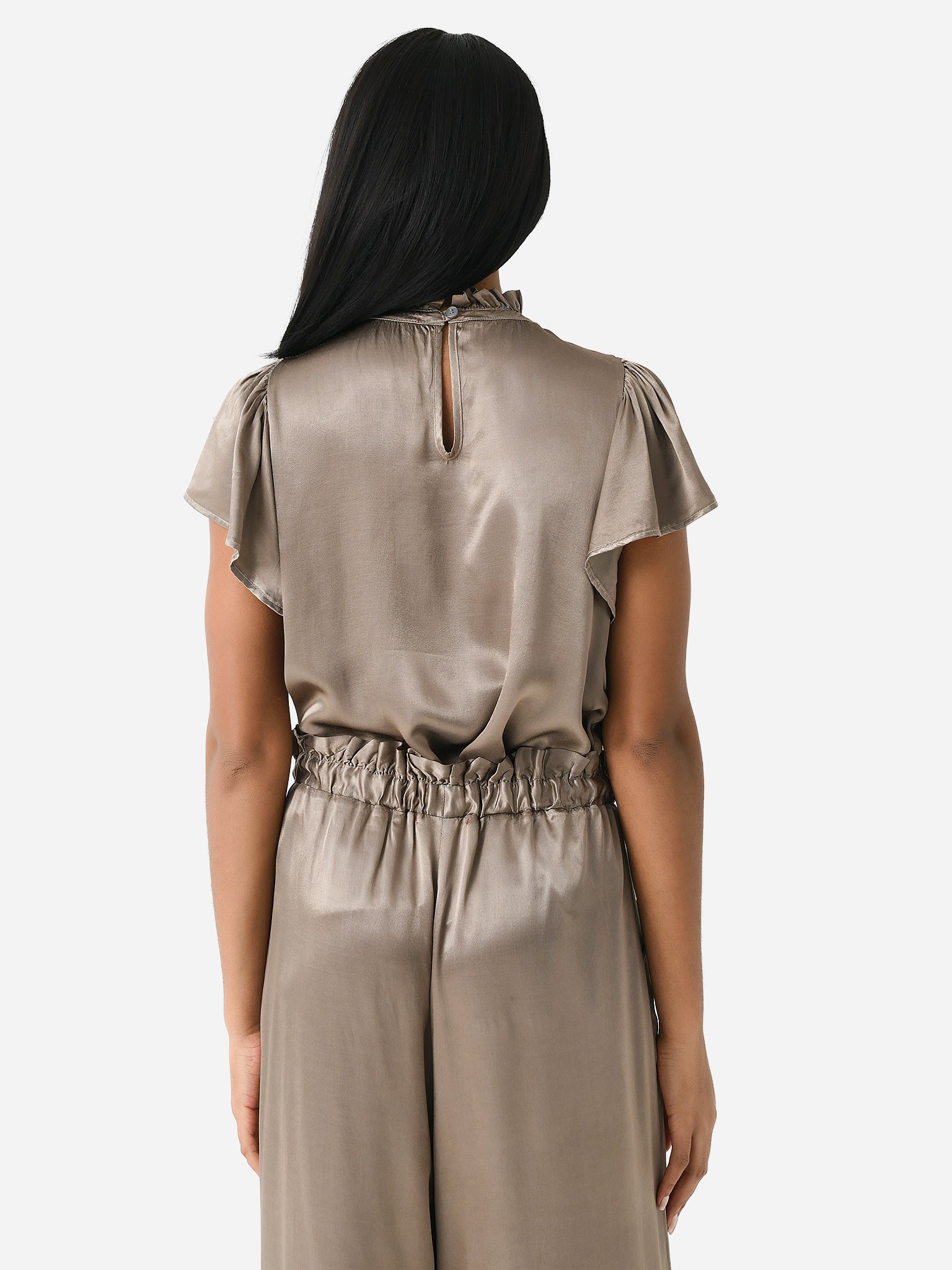 A flutter-sleeve blouse made from silky rayon with a high ruffle neckline.
