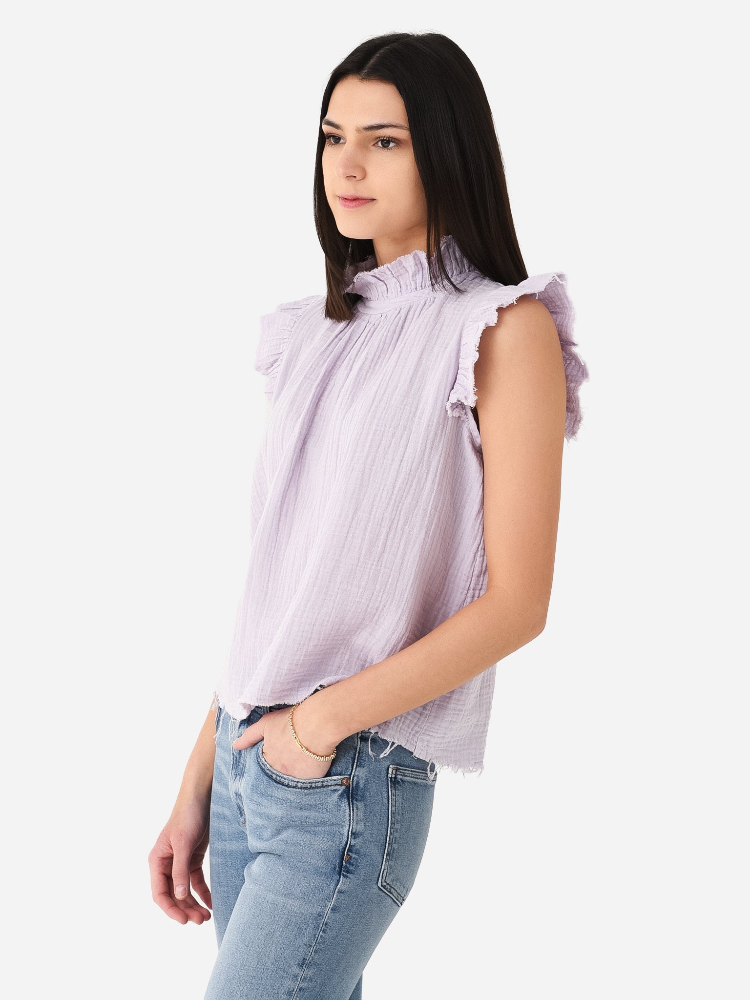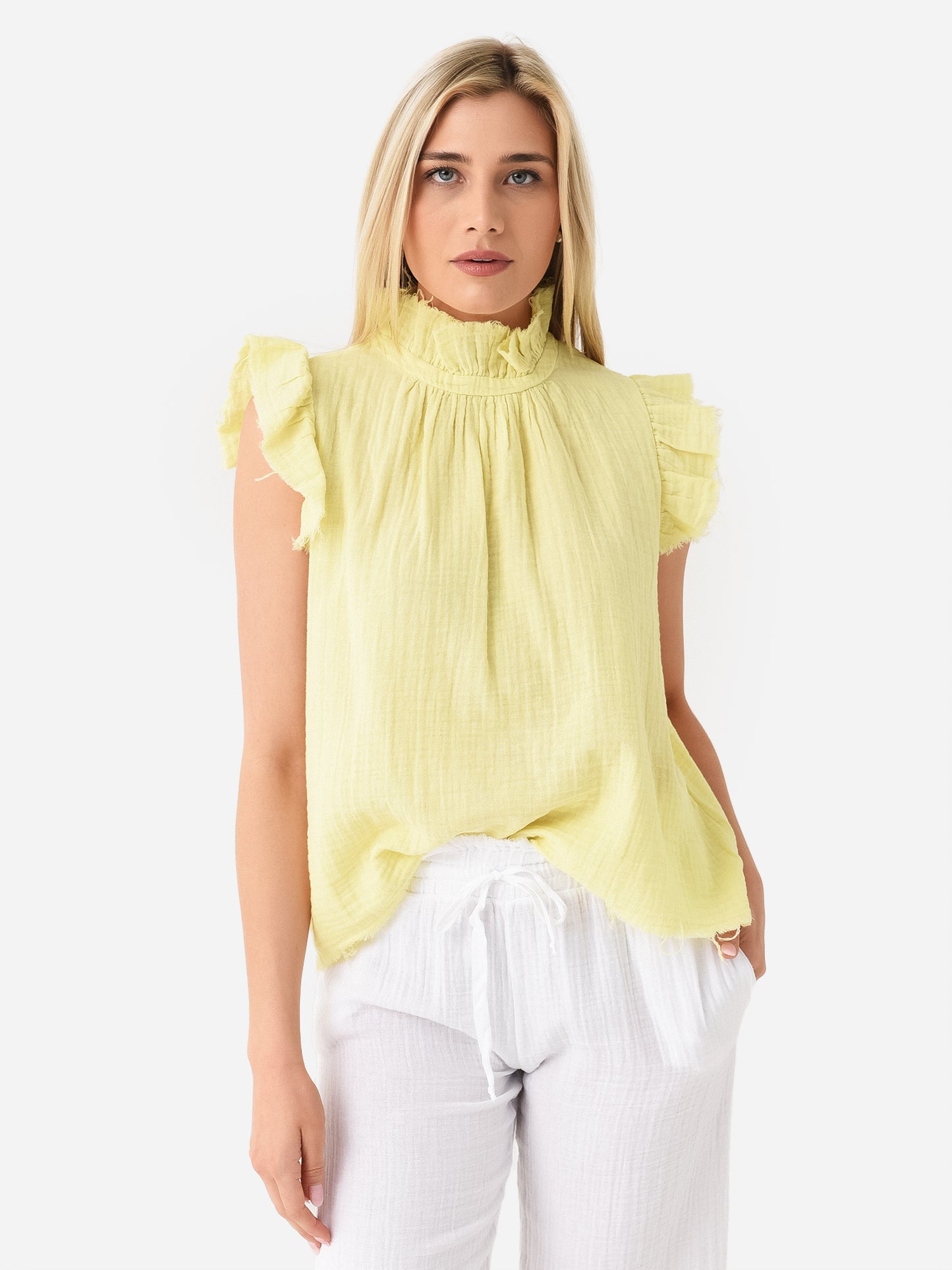 Ruffle-sleeved blouse with a high neckline.