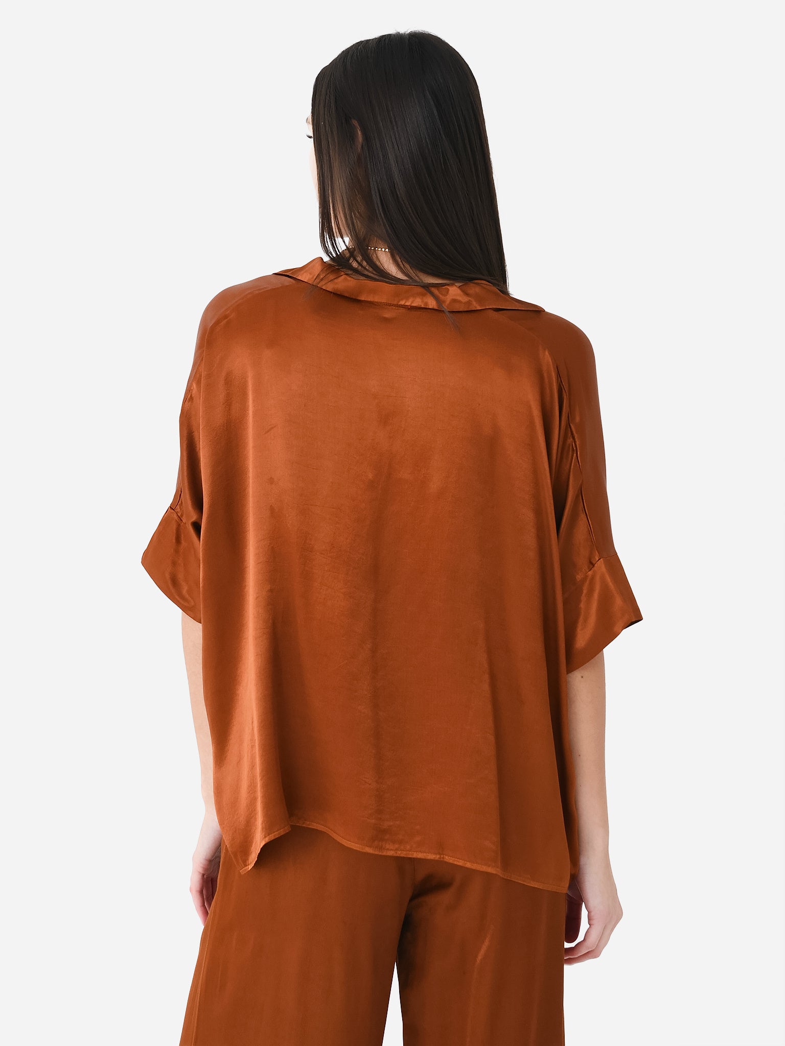 A slightly boxy top made from silky rayon with an asymmetrical hem.