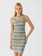 A form-fitting knit mini dress featuring a multi-colored irregular stripe print.