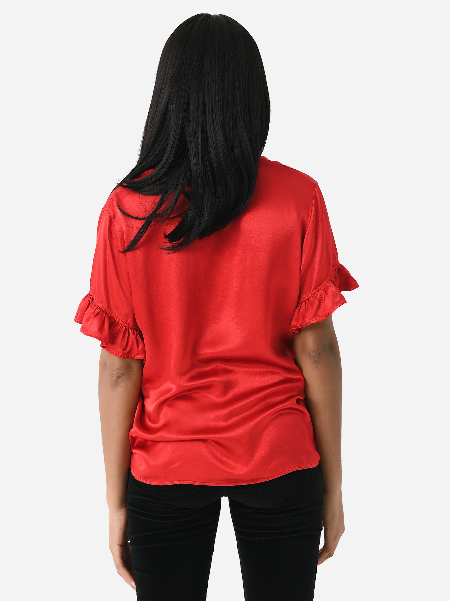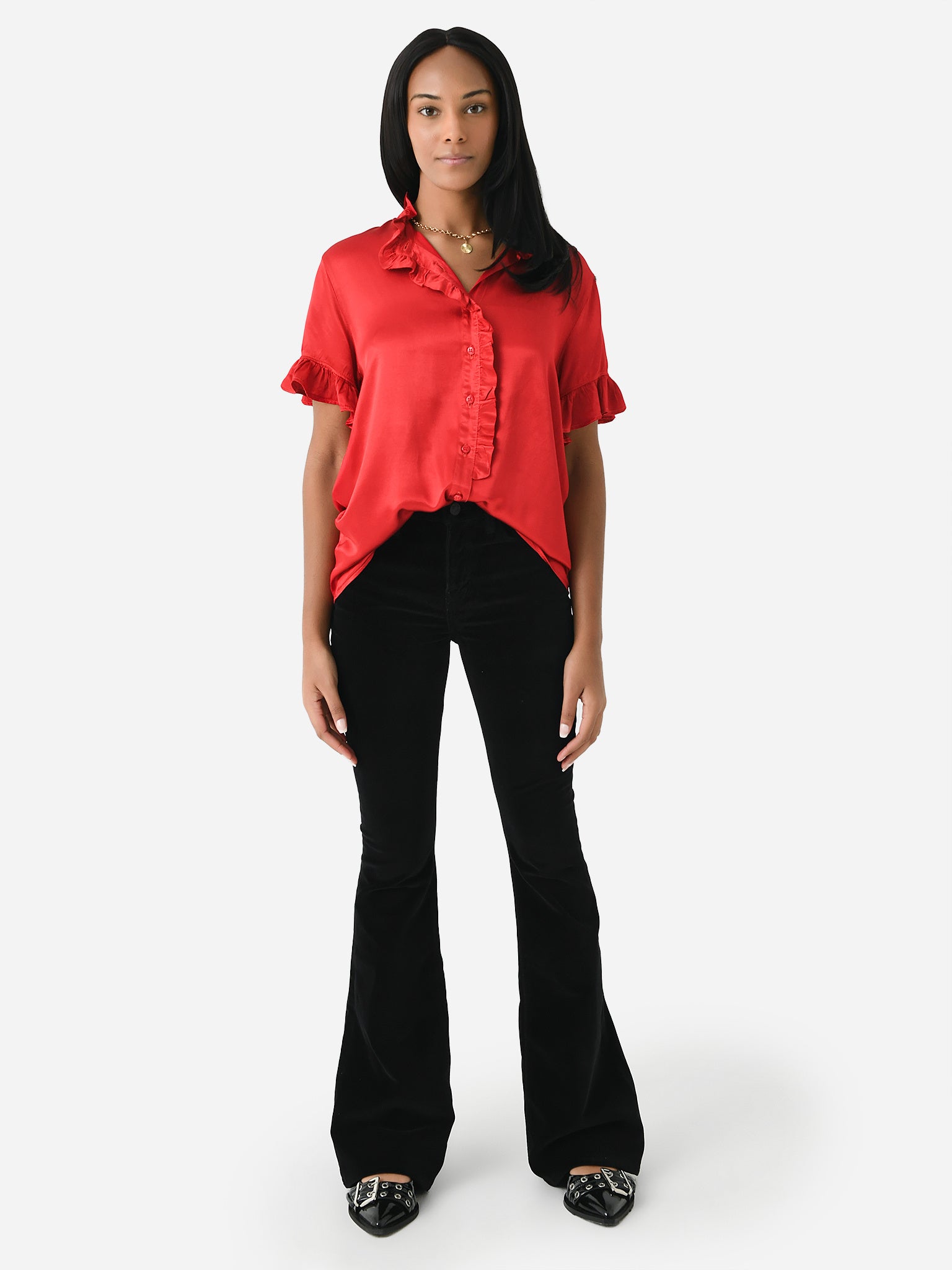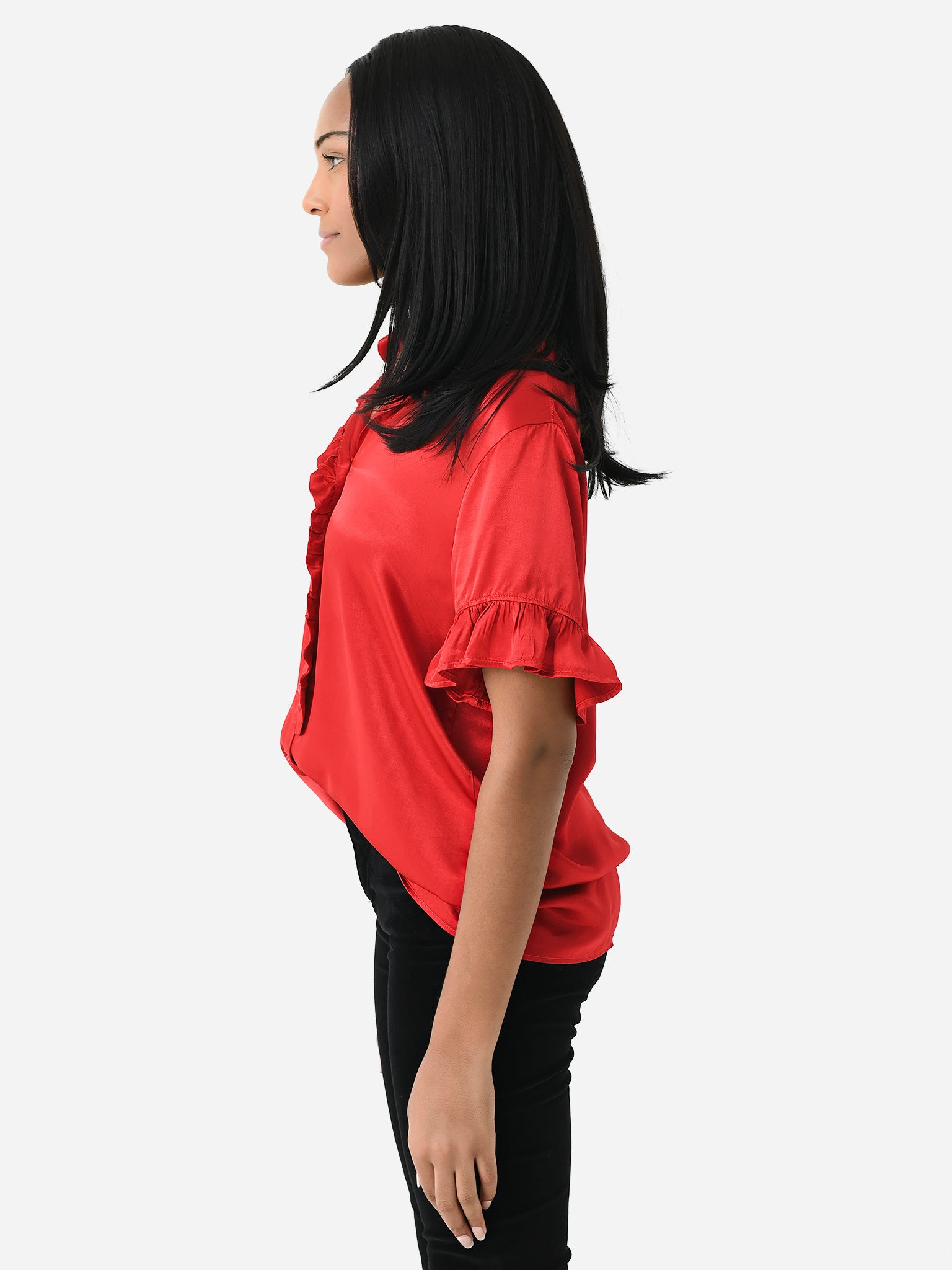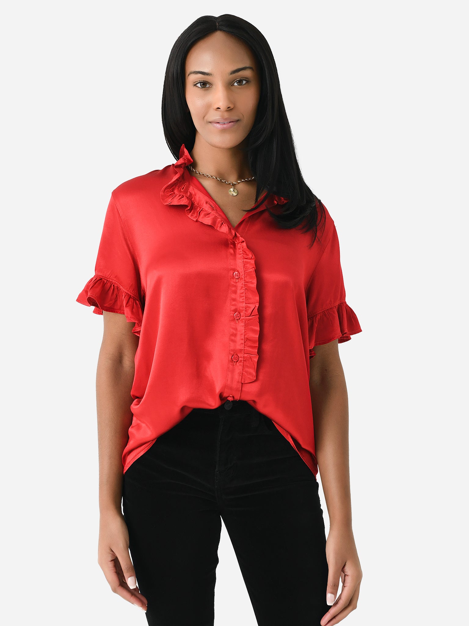 A short-sleeve button-down blouse made from silky rayon with ruffle trims.
