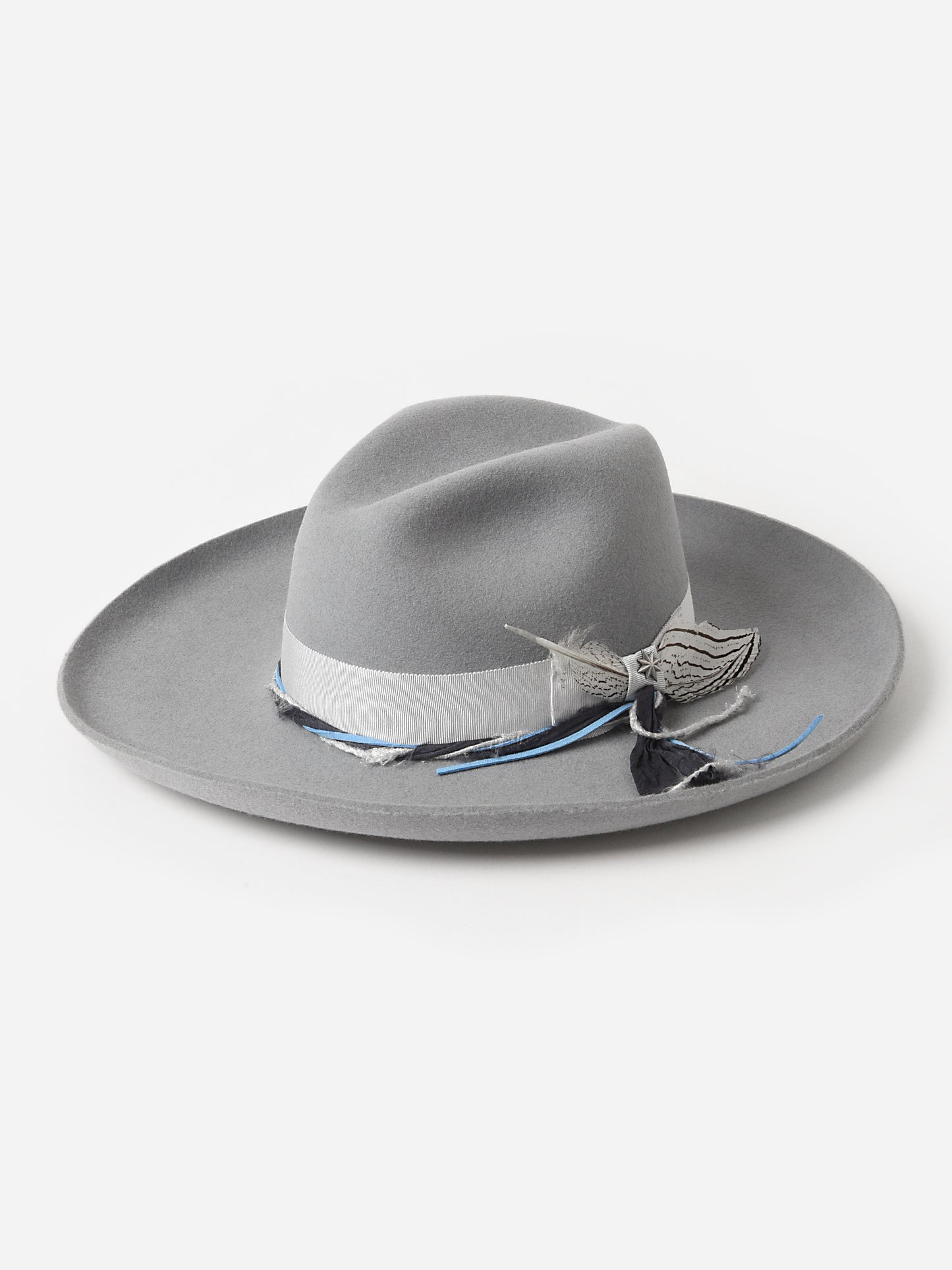 This wool-felt fedora features a curled, raw-edge brim, and a multilayered band that includes a grosgrain ribbon and silk cord.