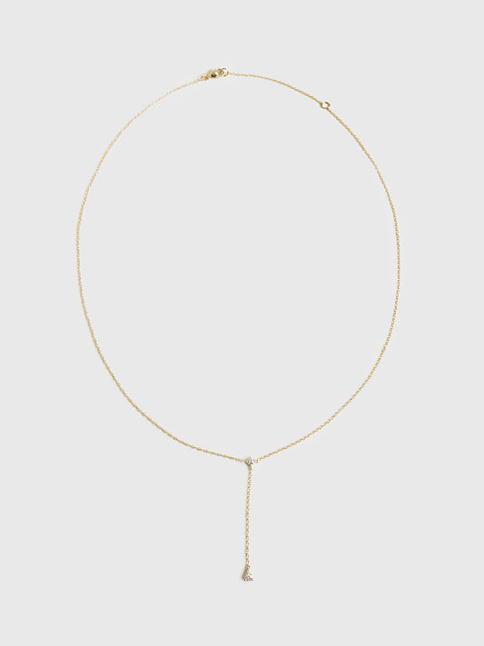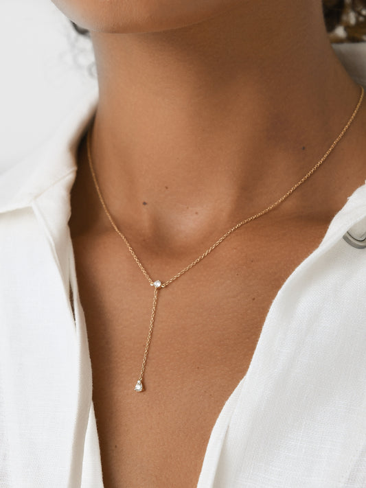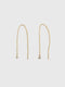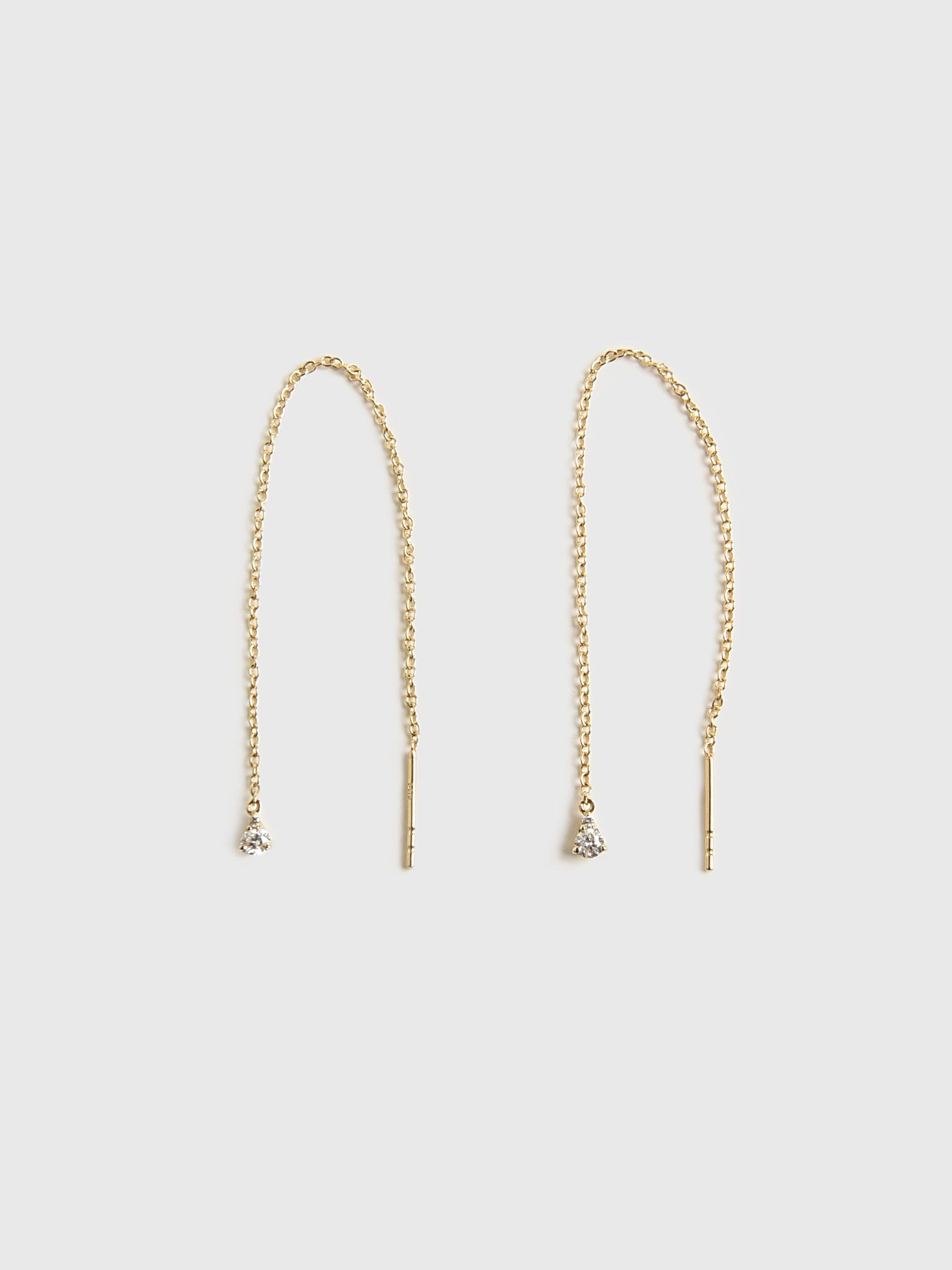 These dainty 14-karat yellow gold earrings feature a pear-shaped diamond and a long, slender chain that threads through your lobe, designed to sway softly.