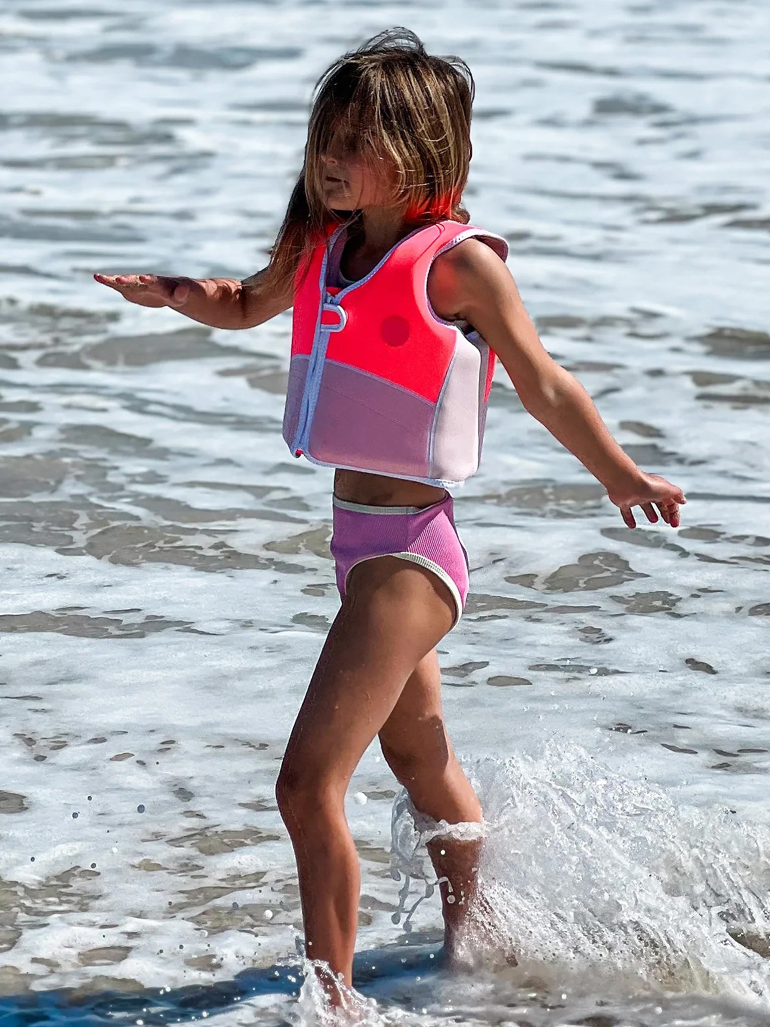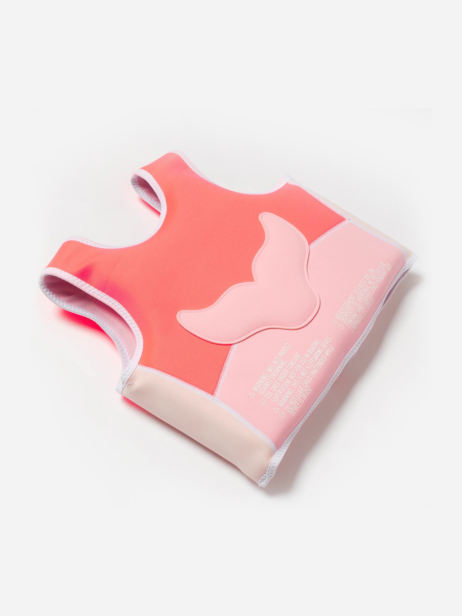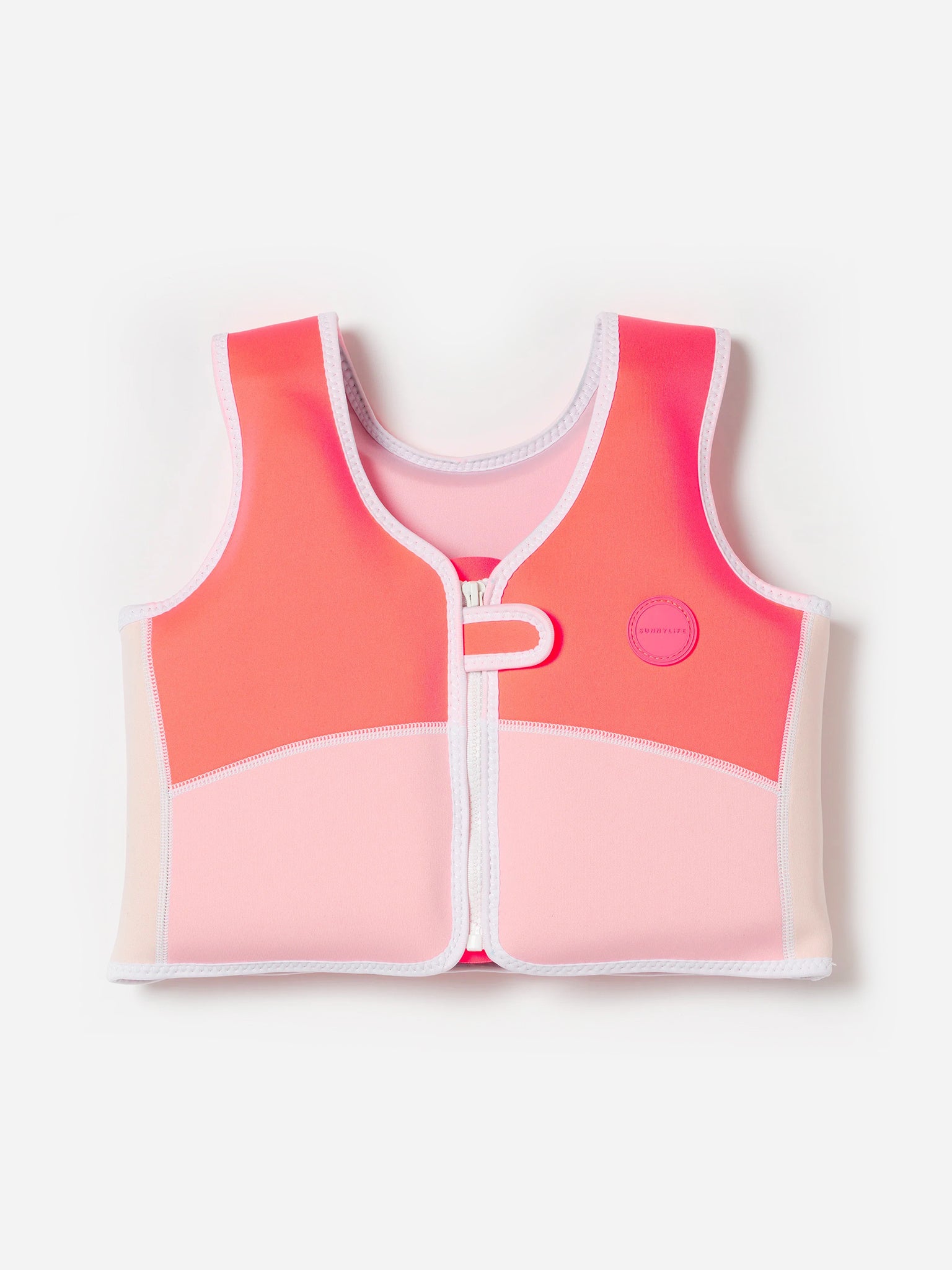 A neon pink swim vest made from durable neoprene for buoyancy and warmth.