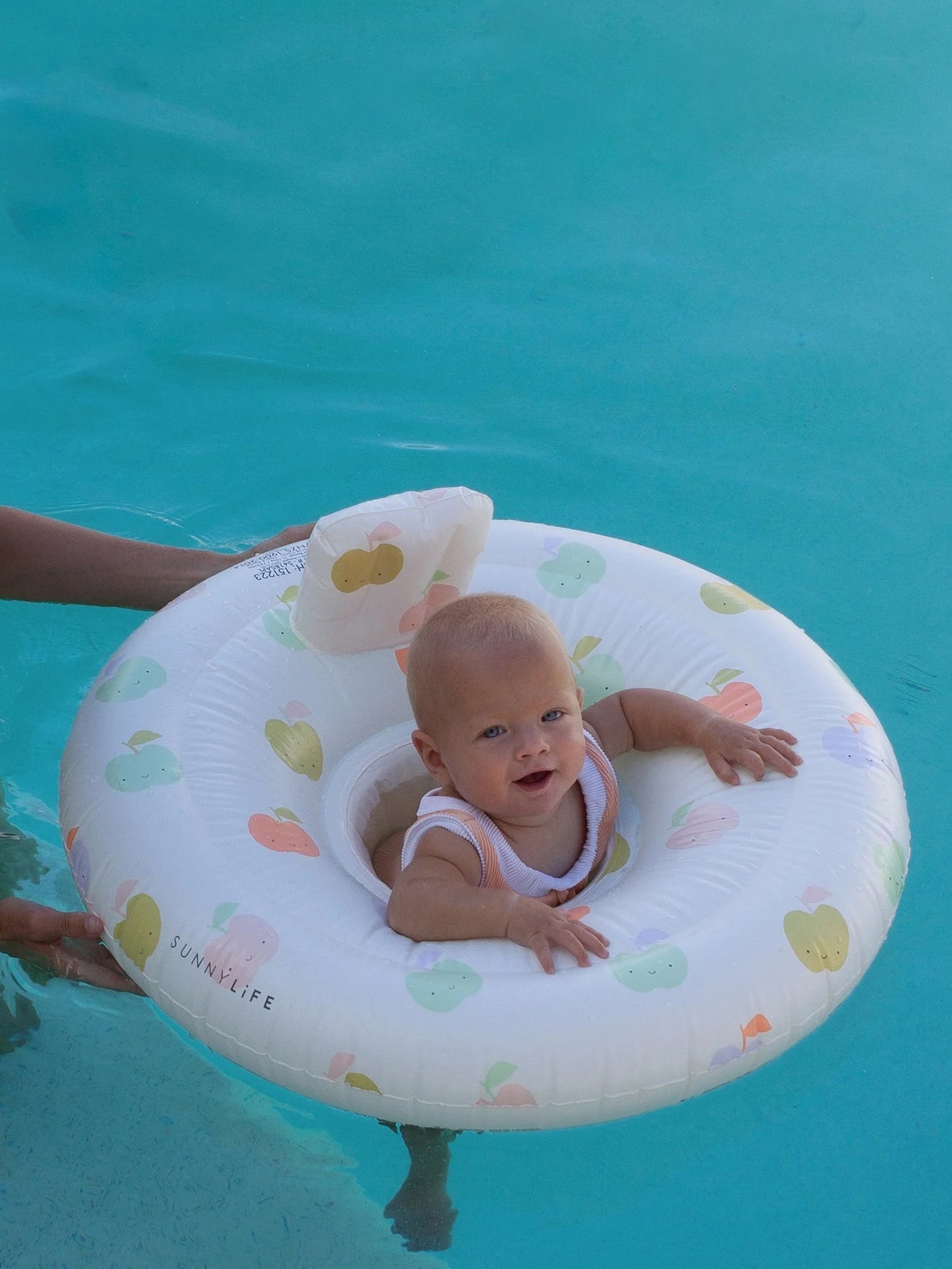 An inflatable float with soft leg support designed to build water confidence for babies and toddlers.