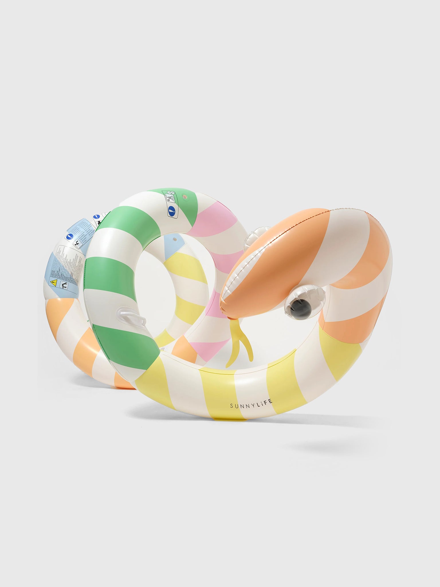 A loopy inflatable noodle with a colorful stripe print and a snake design.