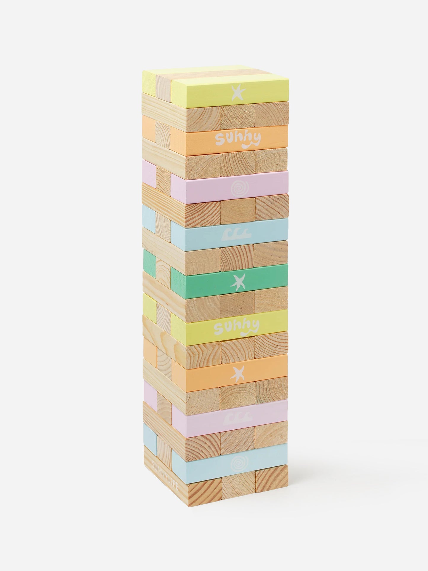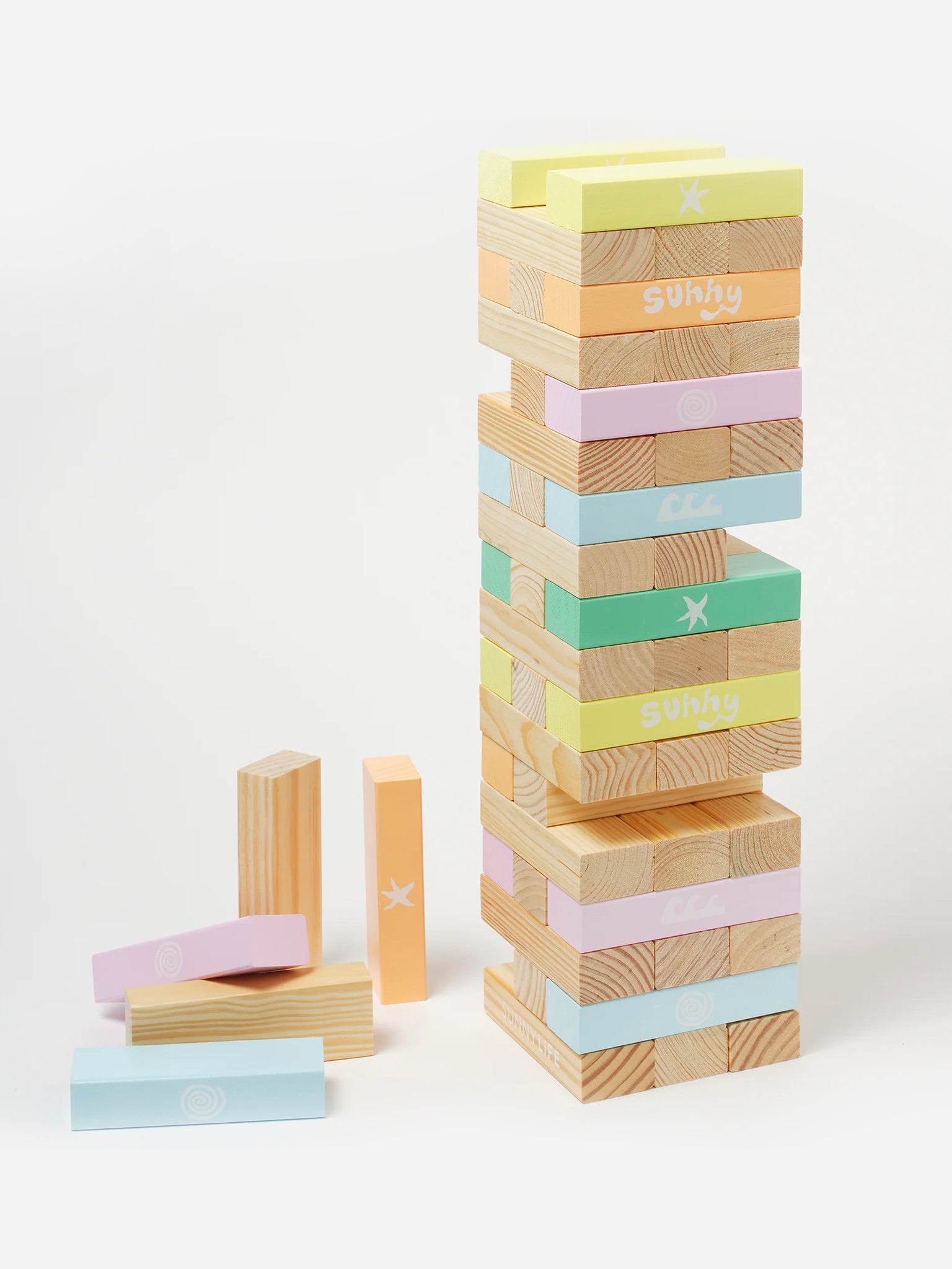 A large jumbling tower constructed from natural wood and featuring various hand-painted pastel tones.