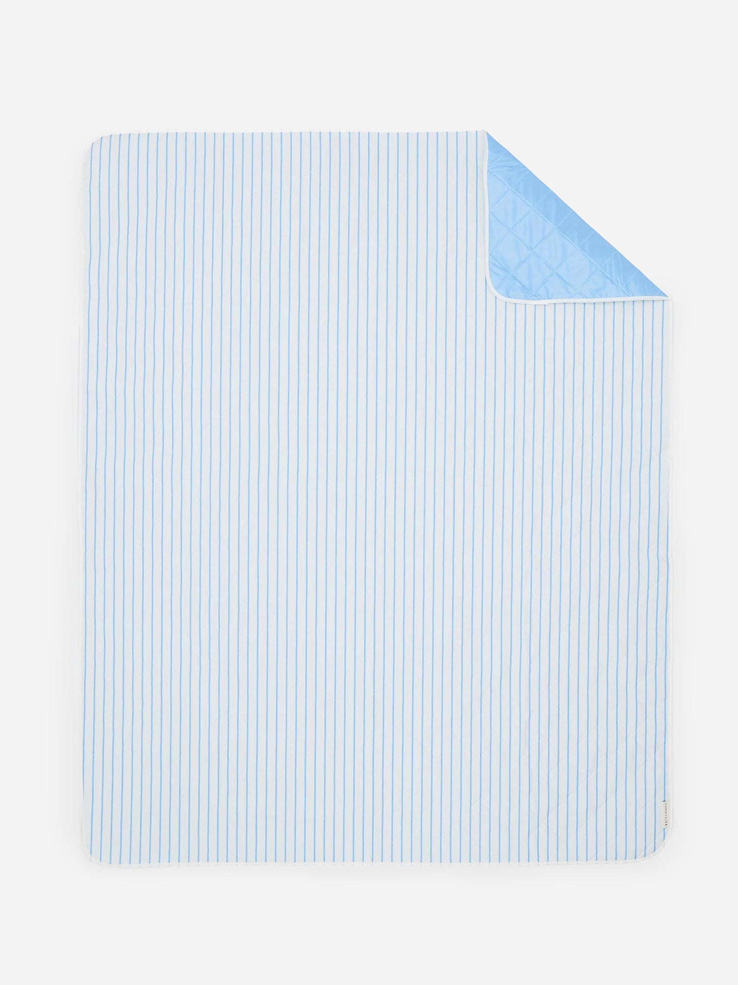 A striped beach and picnic blanket with an inner foam layer and water-resistant exterior.