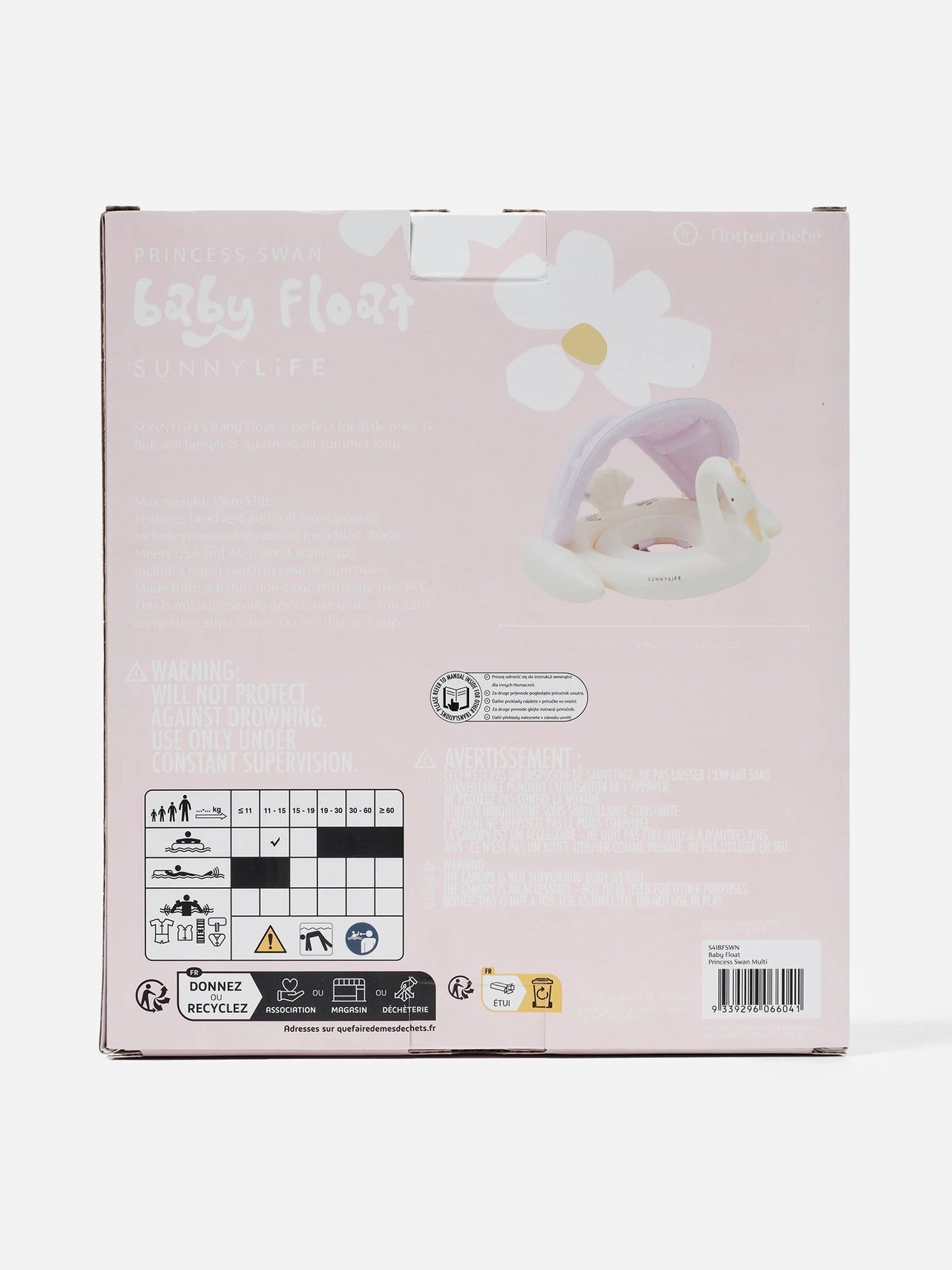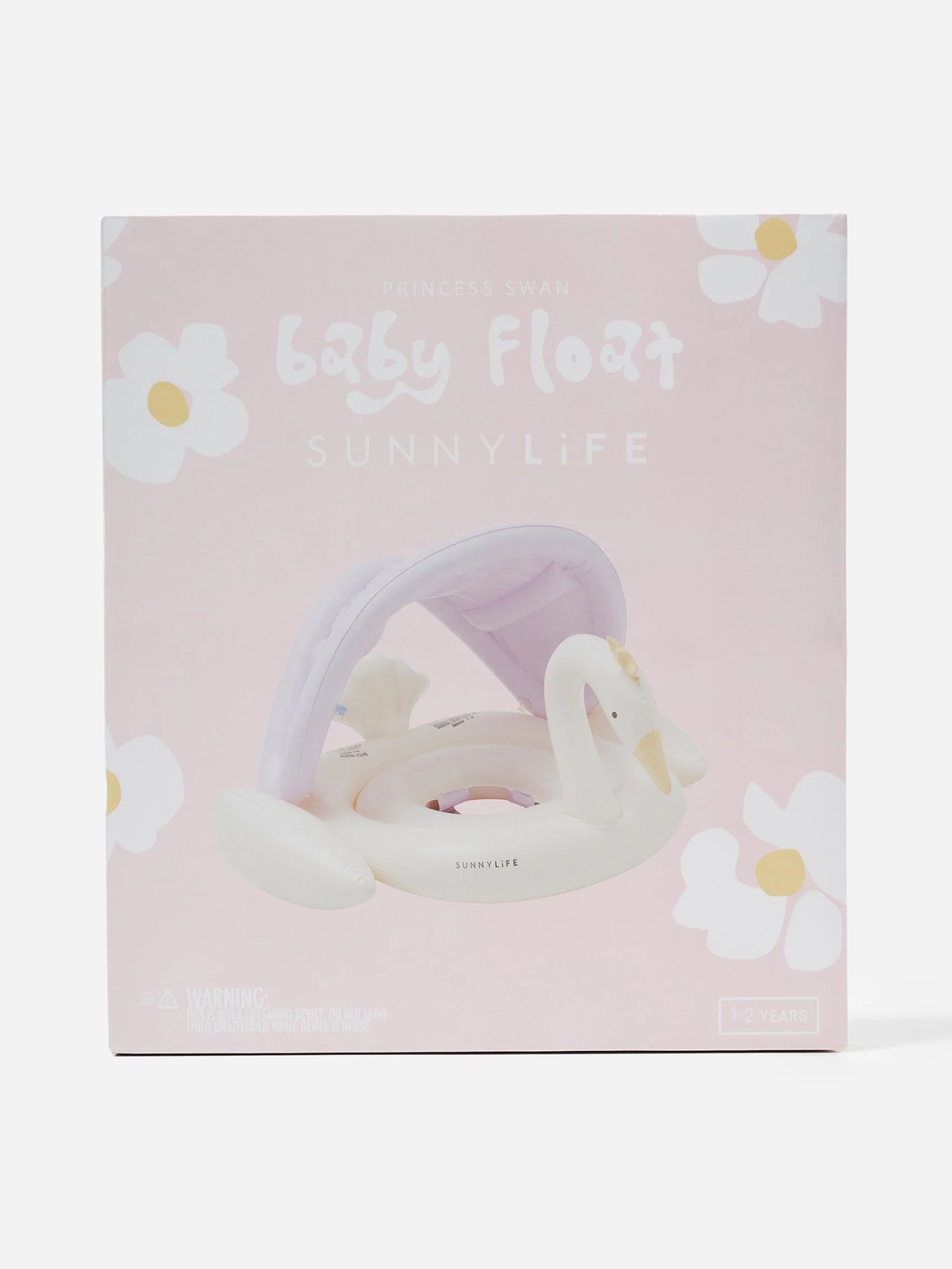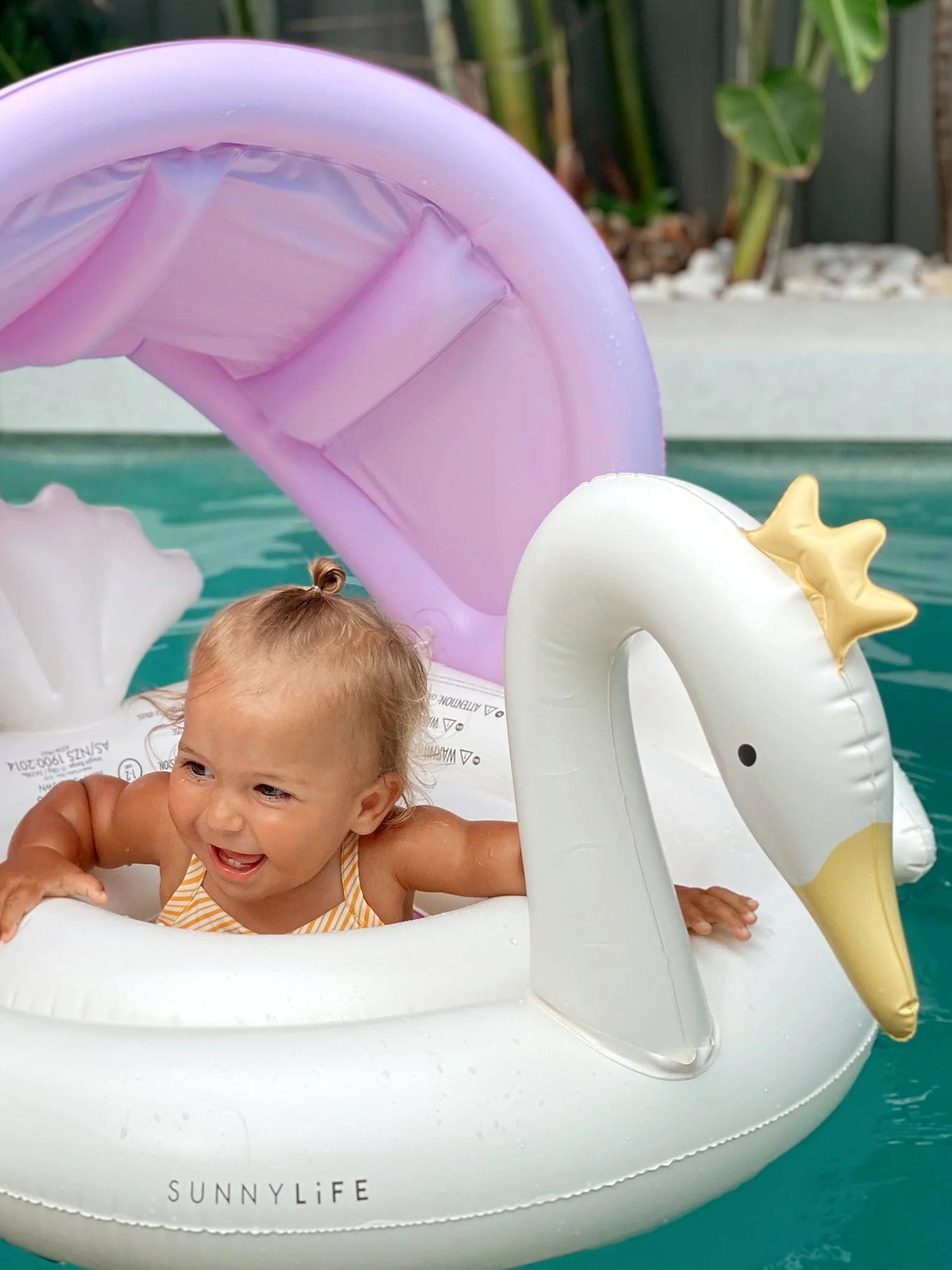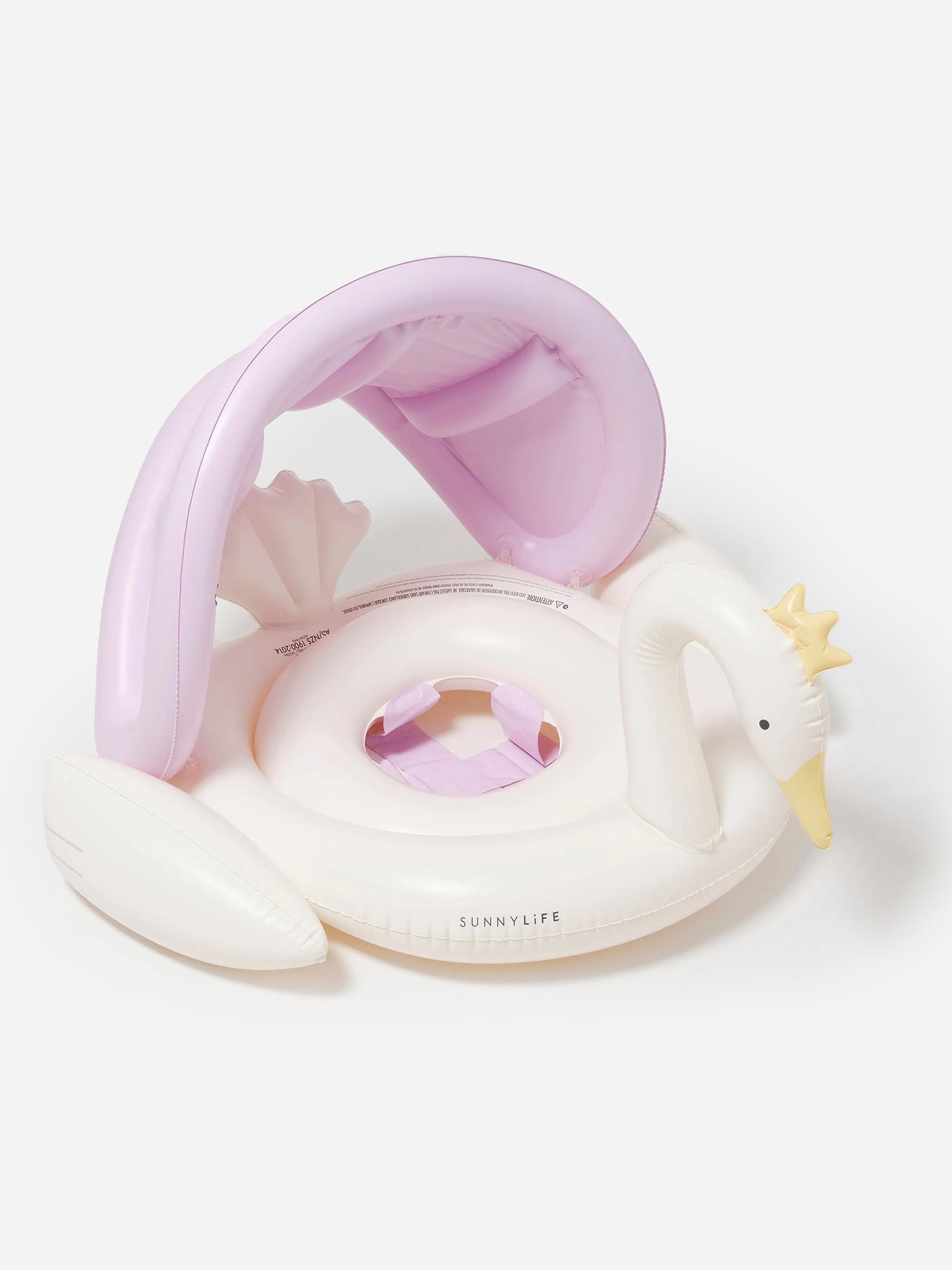 A swan-themed baby float featuring soft leg support and a removable canopy.