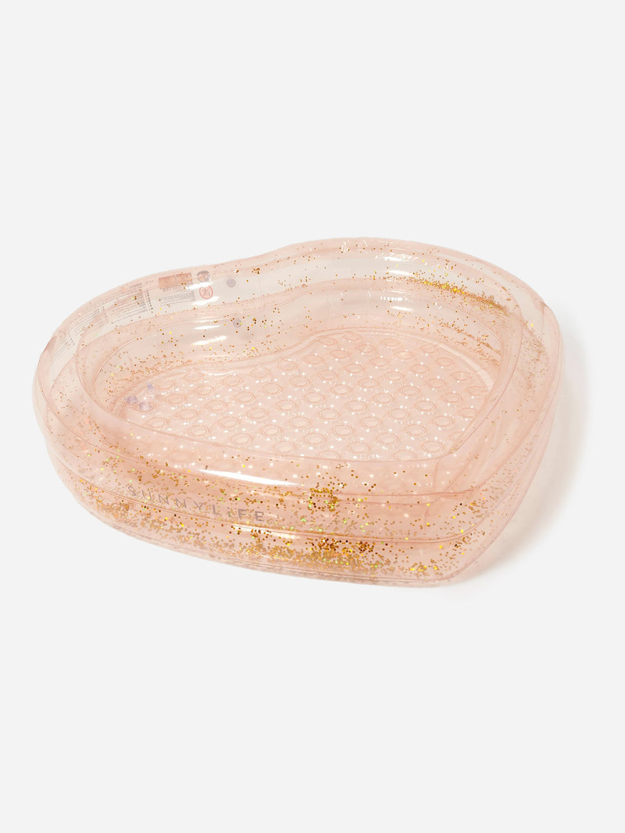 A heart-shaped inflatable pool with free-flowing gold glitter and a soft padded floor.