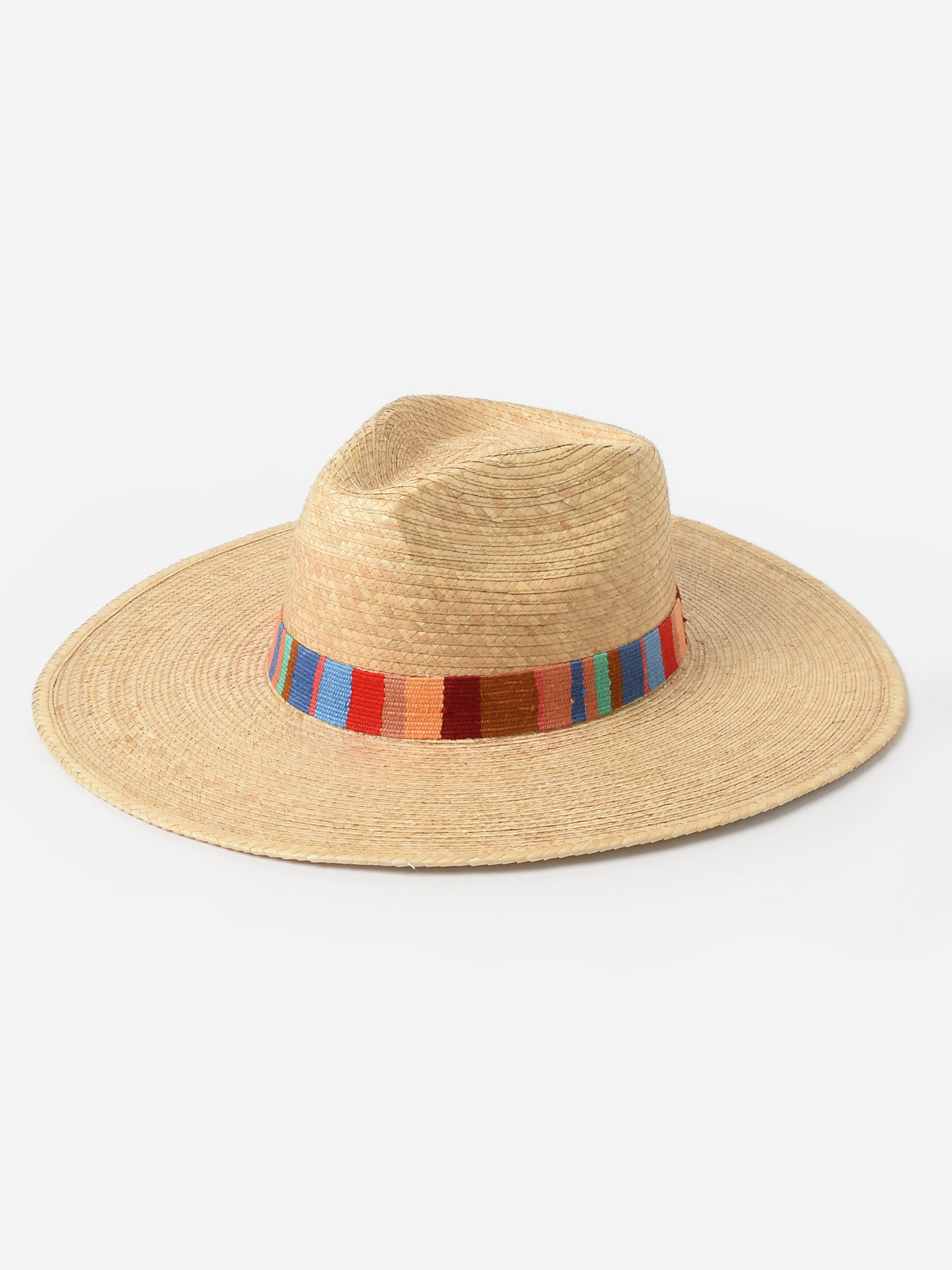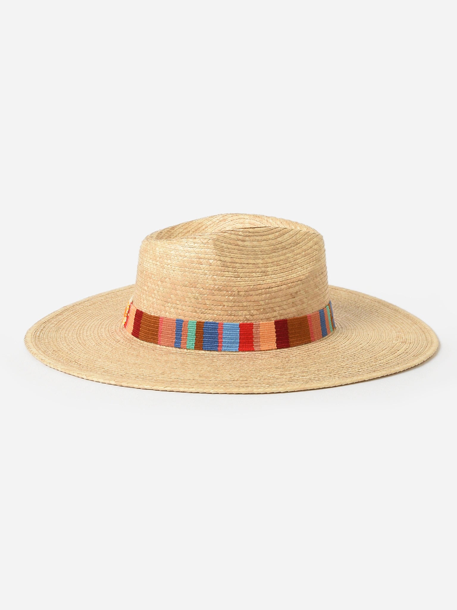 Handmade palm hat featuring a multi-colored woven band.
