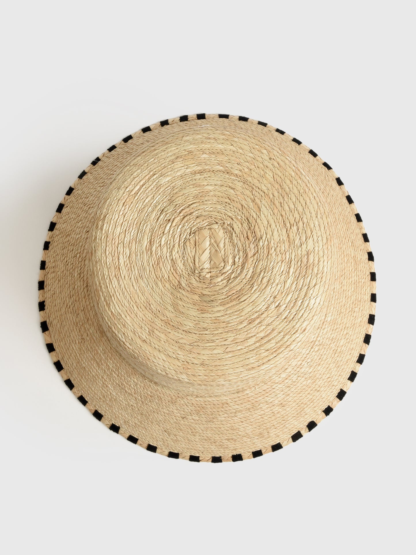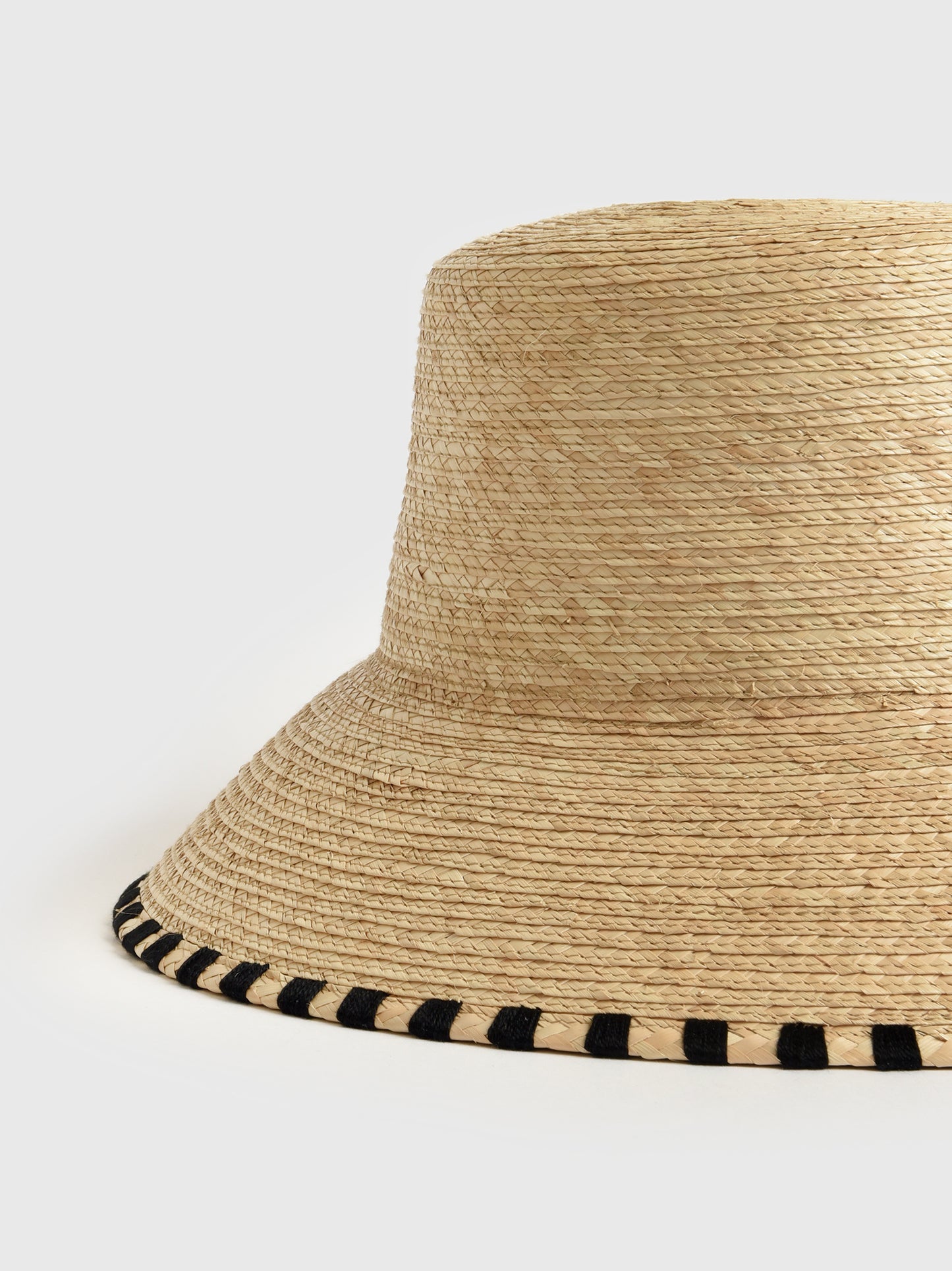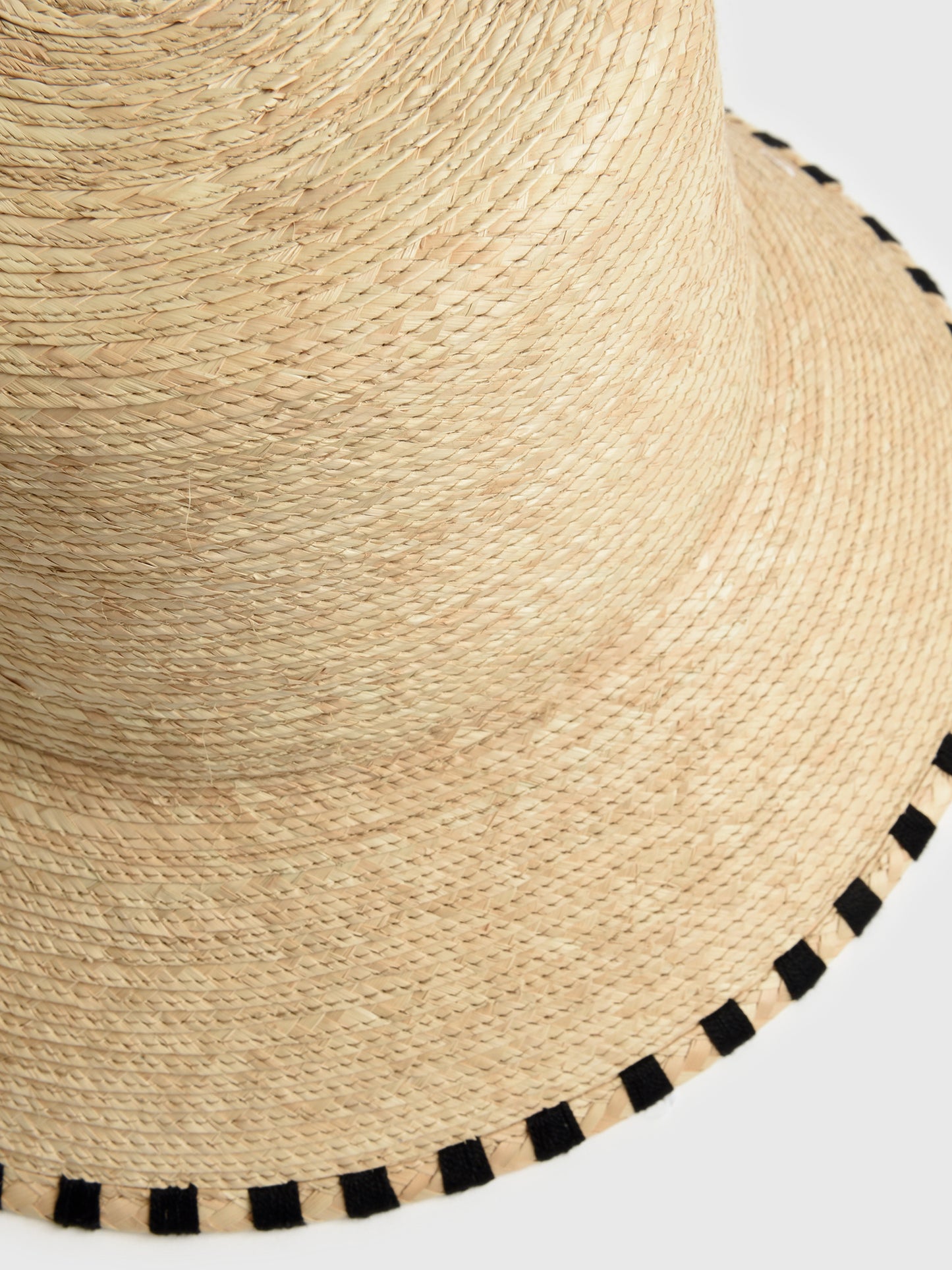 This bucket hat is handmade from natural palm and features a black stitched edge.