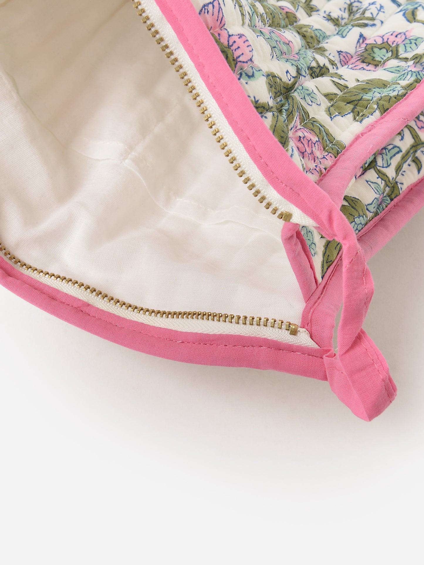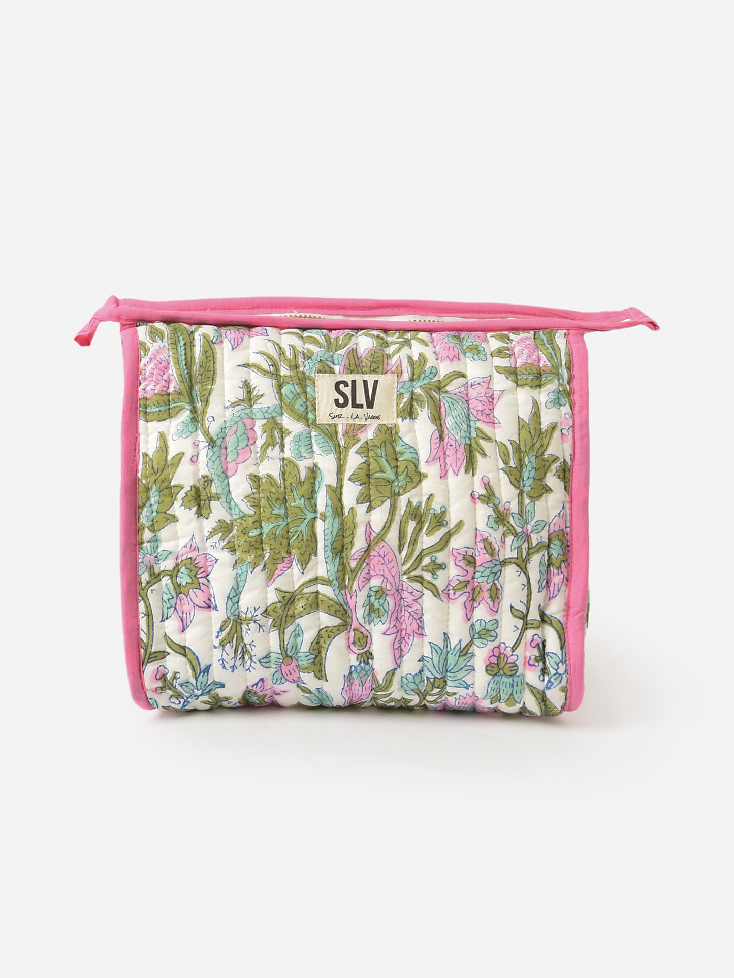 A medium-sized cosmetic bag with contrast trims and a colorful print.