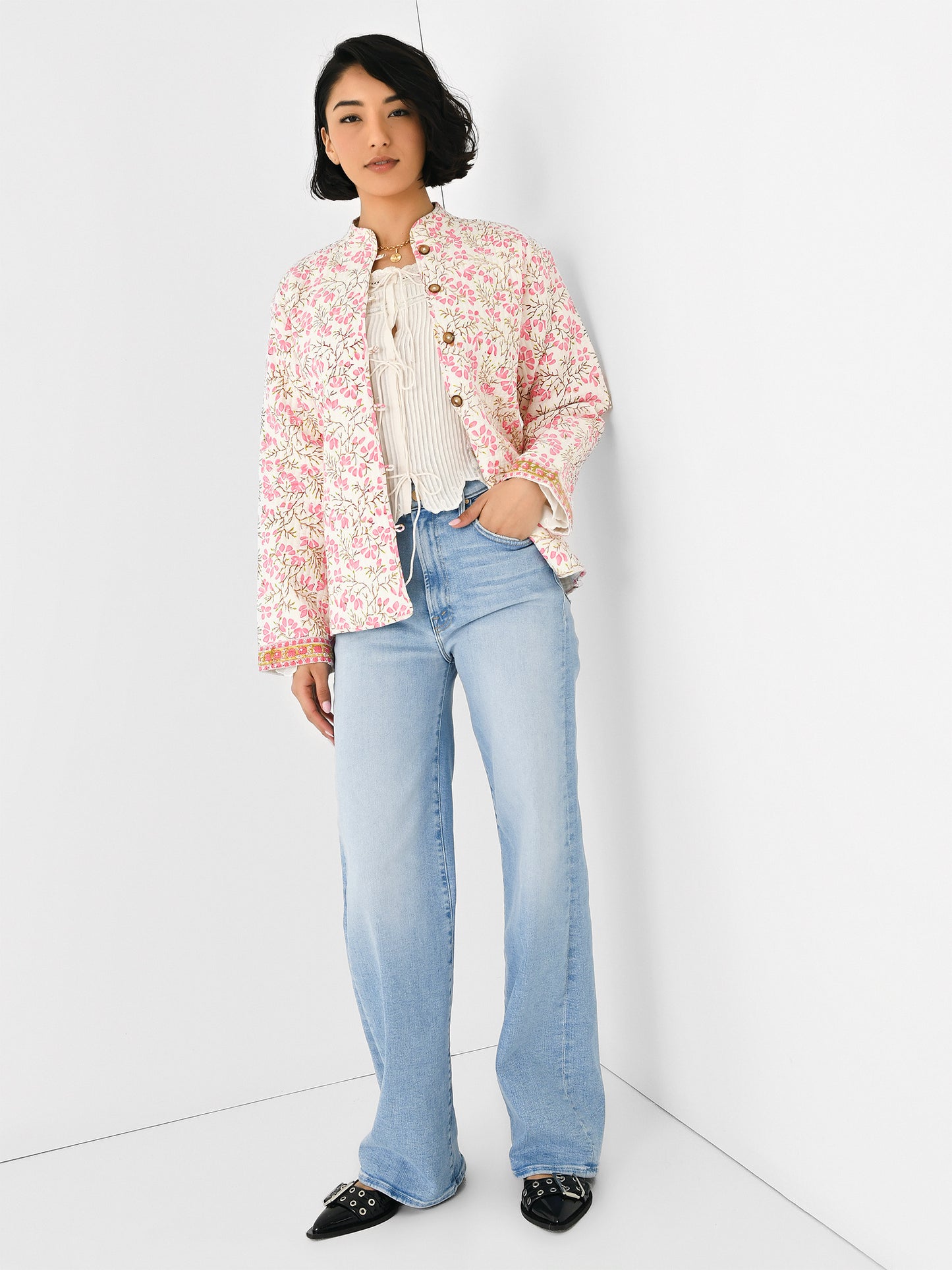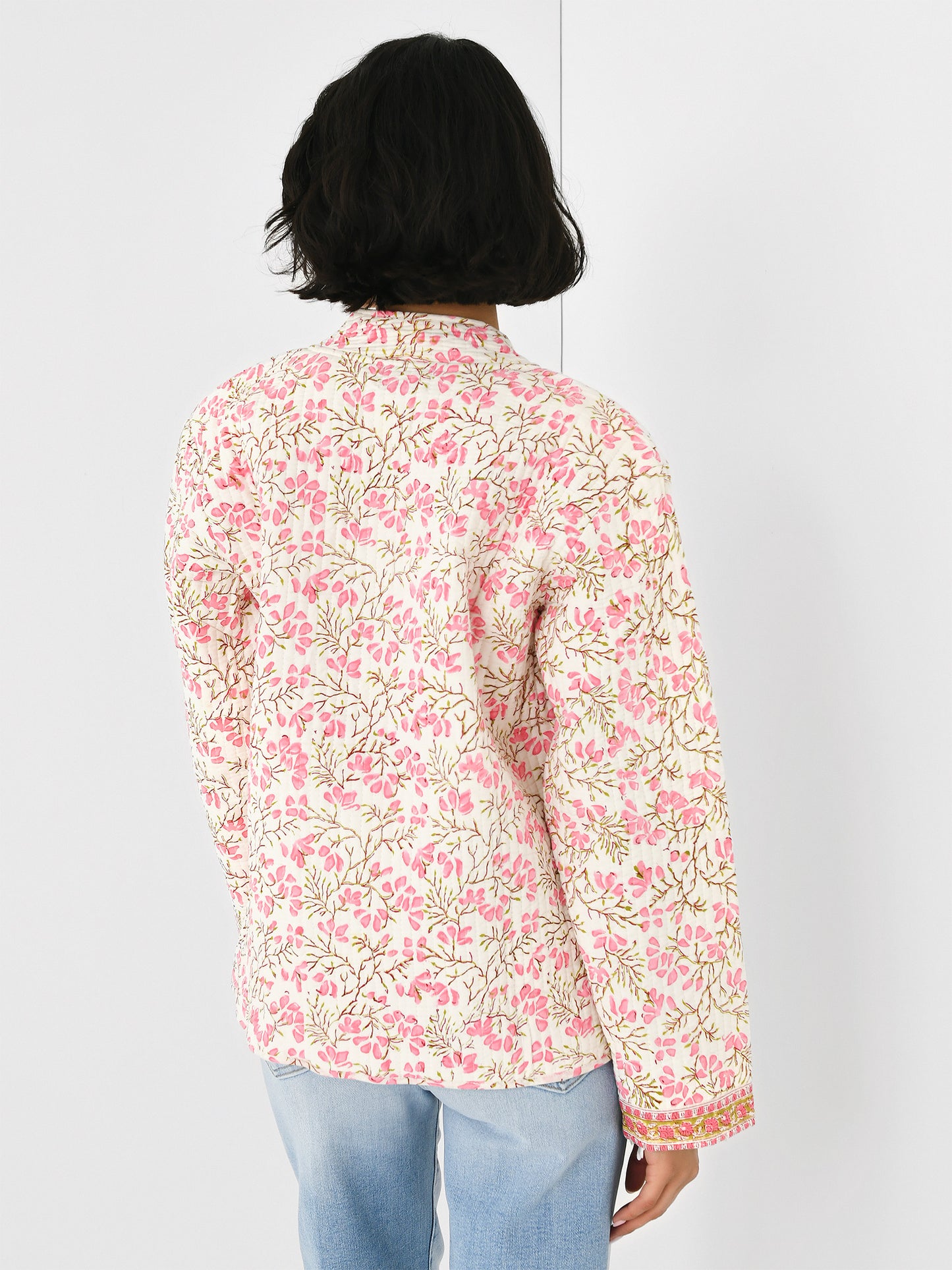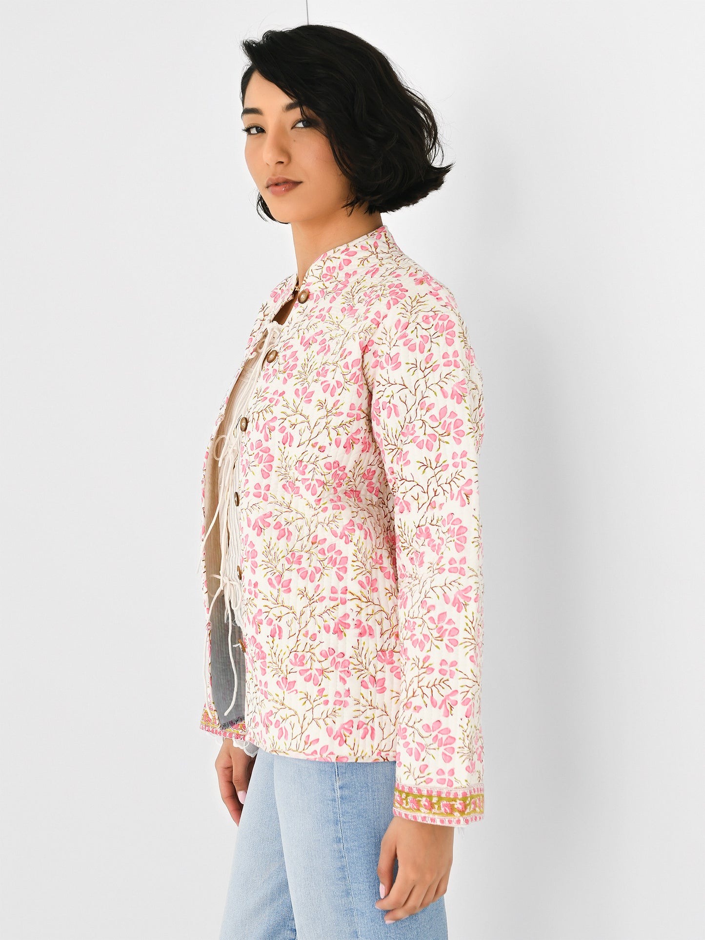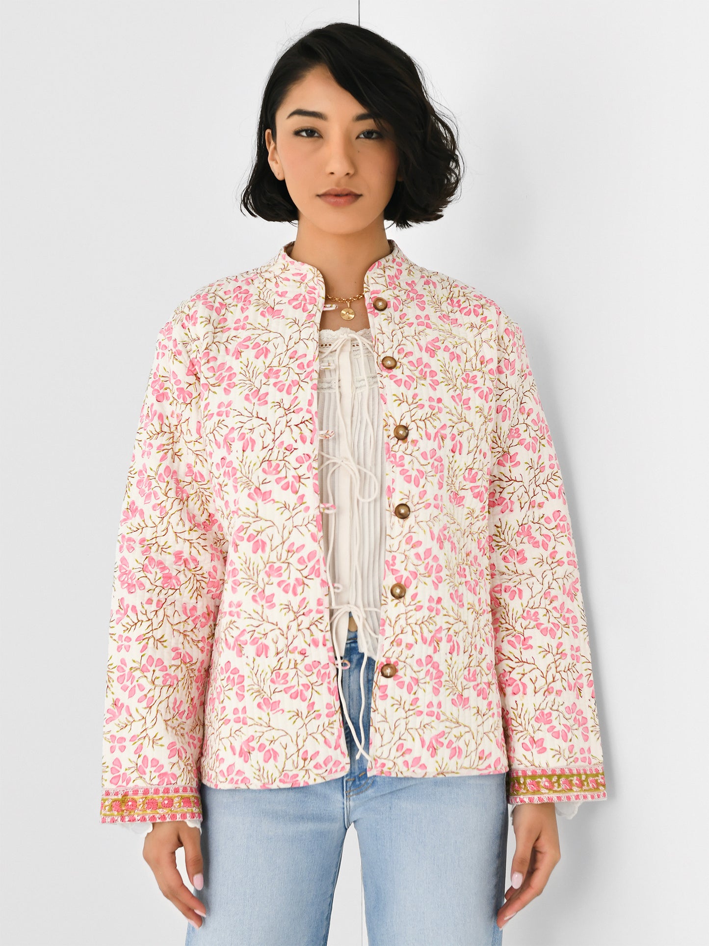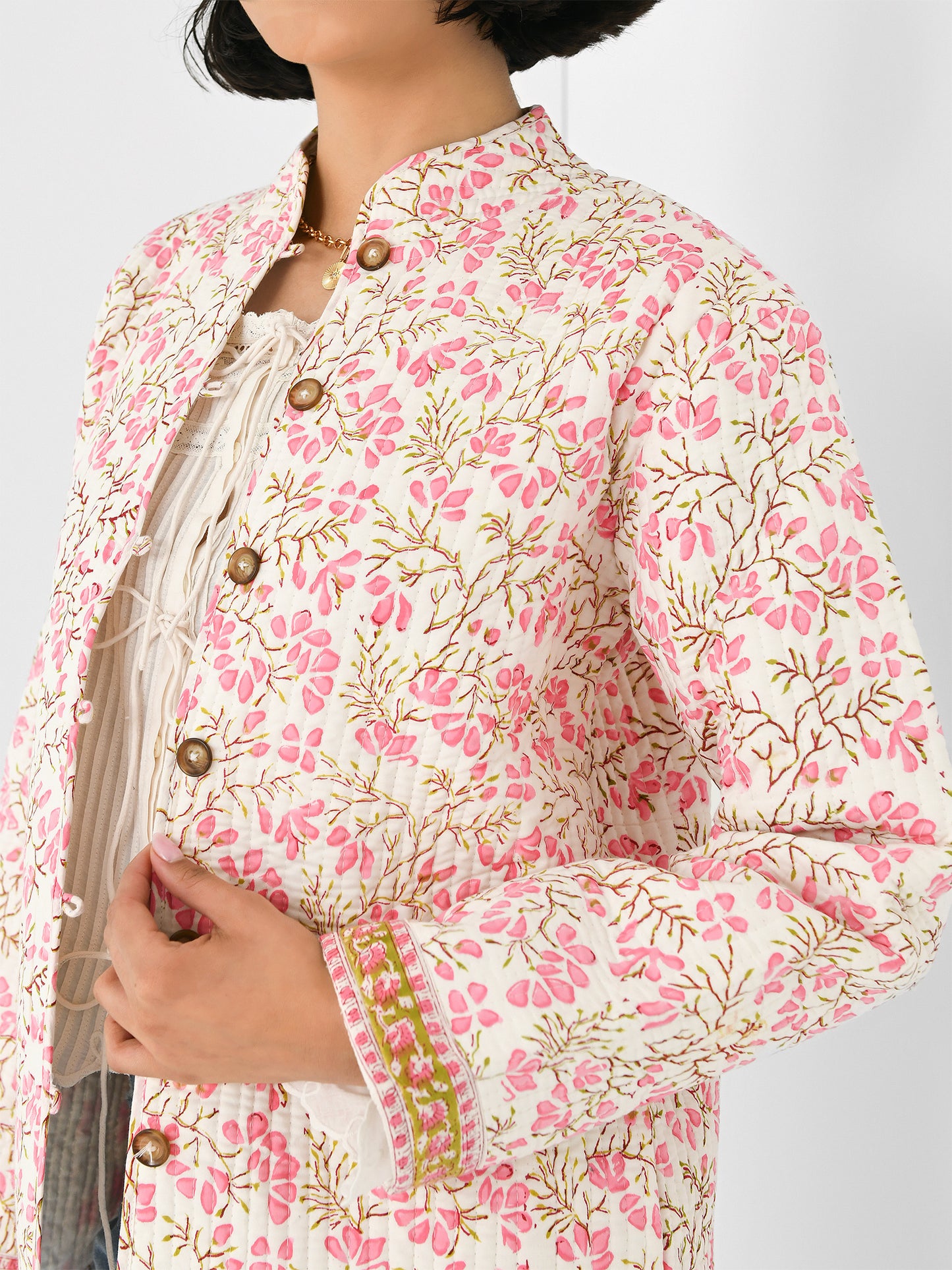 A lightly quilted cotton coat with a pink floral print and button closure.